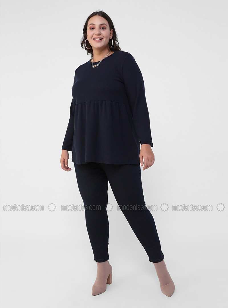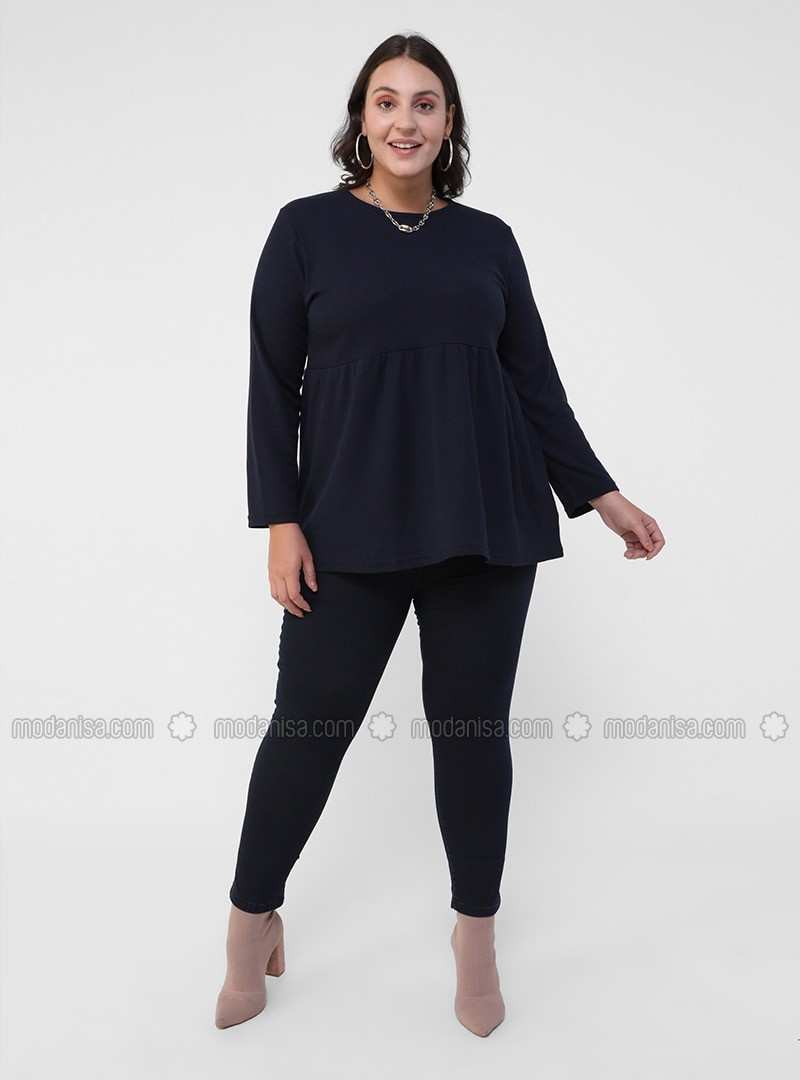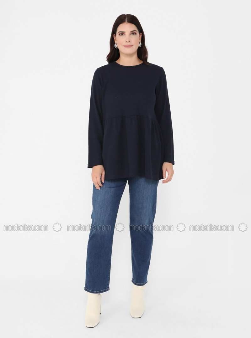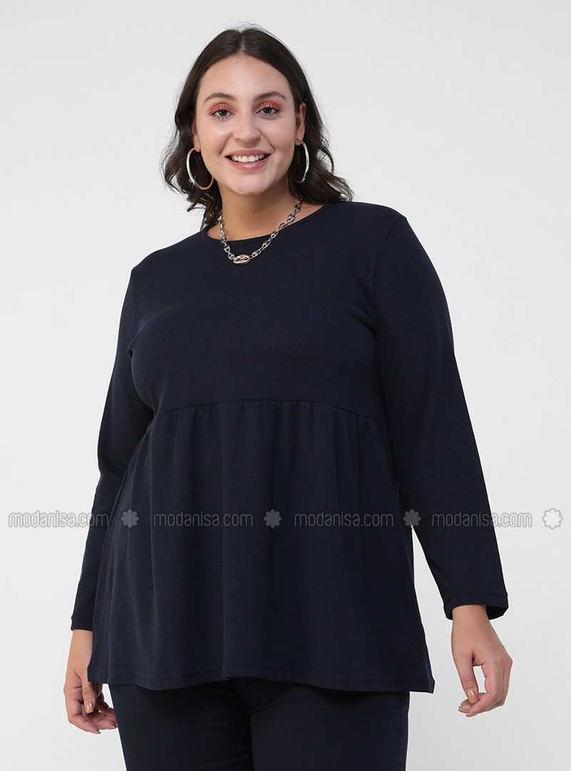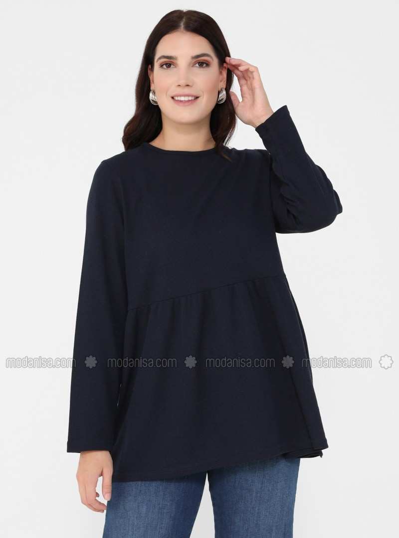 قطن برقبة دائرية باللون الأزرق الداكن مقاس كبير حجم تونك