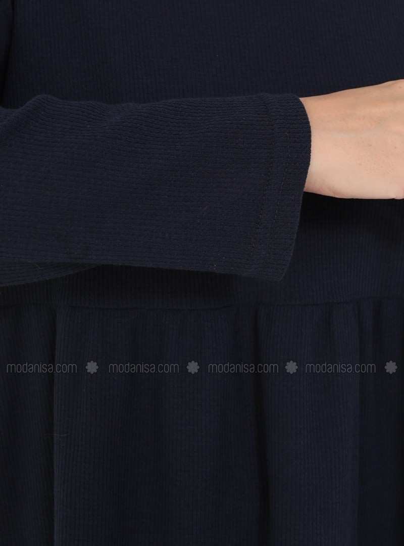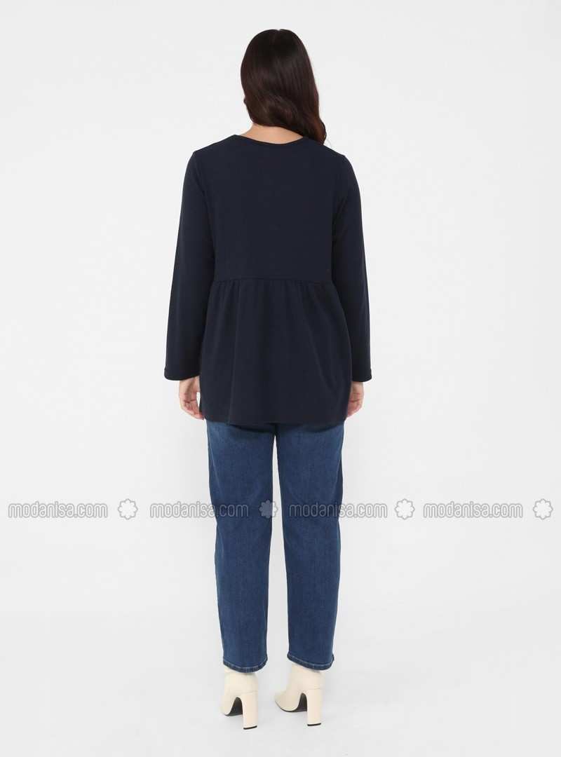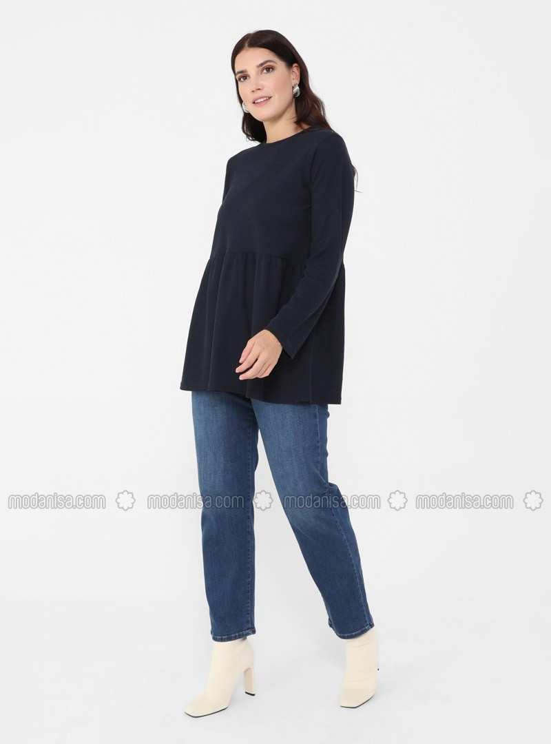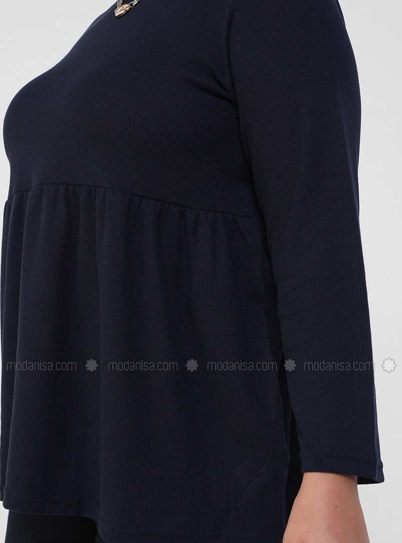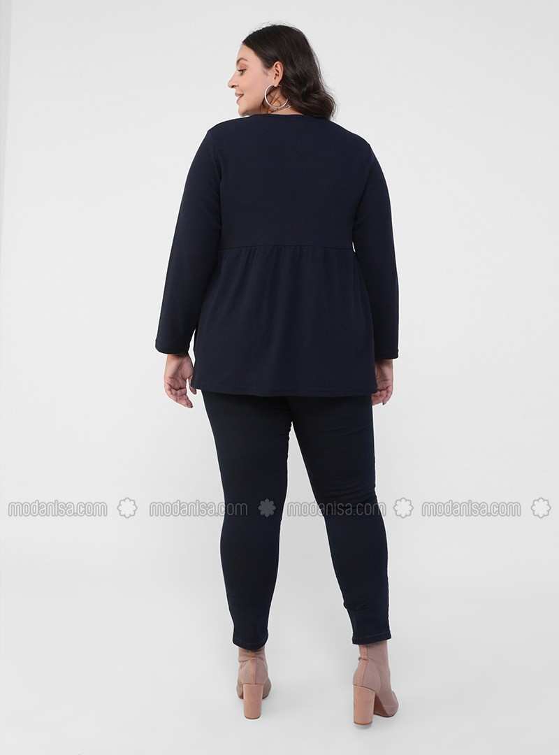 قطن برقبة دائرية باللون الأزرق الداكن مقاس كبير حجم تونك