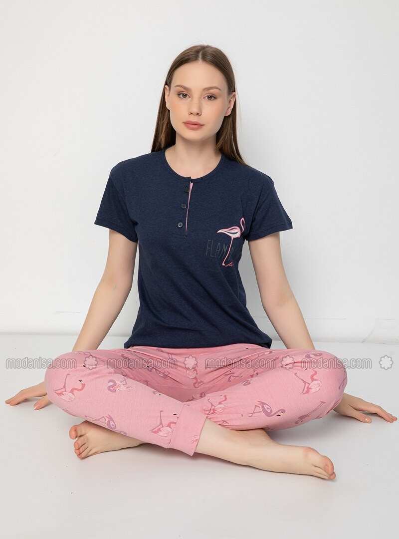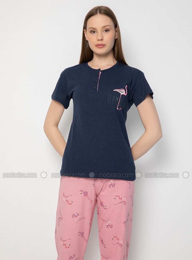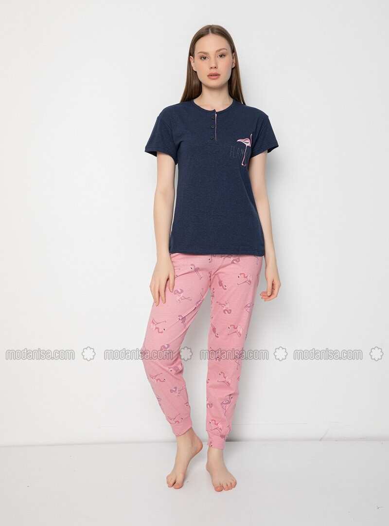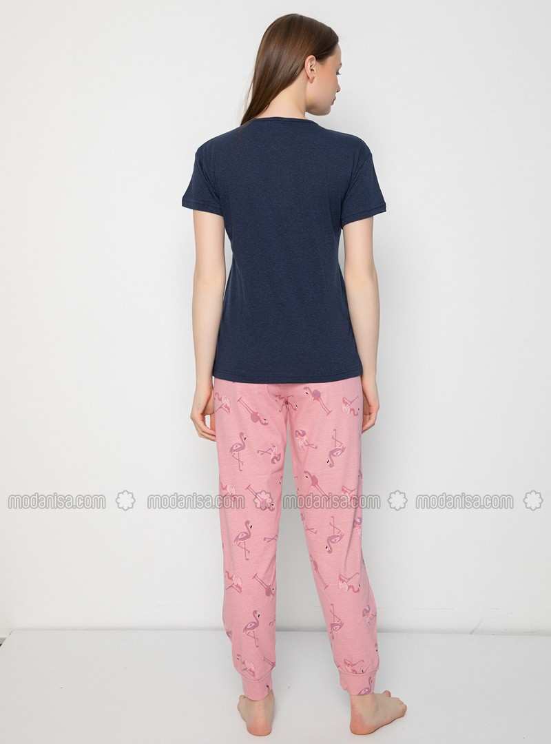 طقم بيجامة متعدد الألوان برقبة دائرية باللون الأزرق الداكن