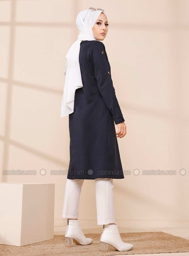 سترة برقبة دائرية مطبوعة باللون الأزرق الداكن
