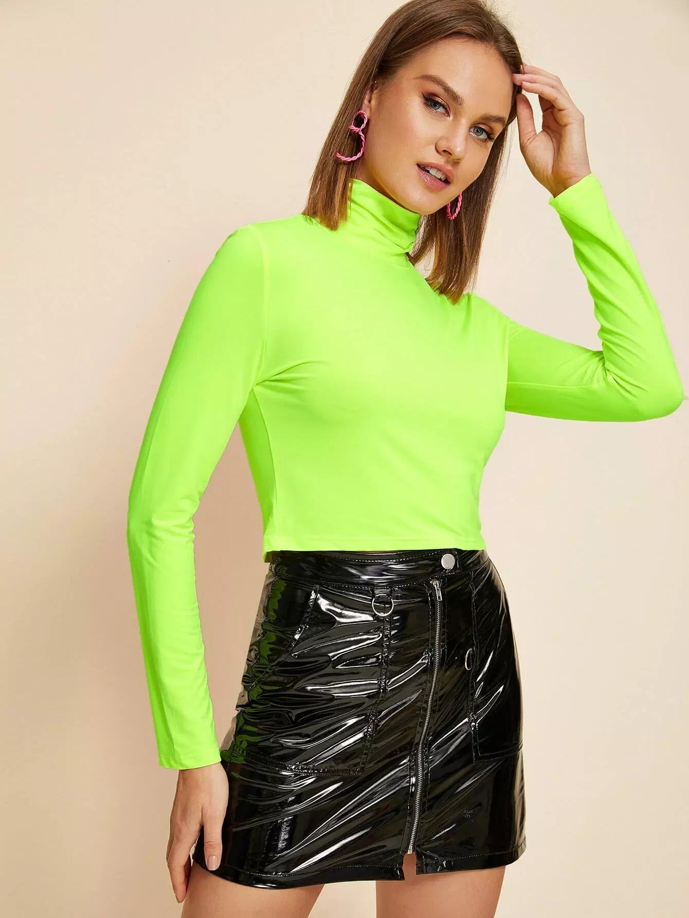 تي شيرت بياقة عالية الرقبة باللون الأخضر النيون