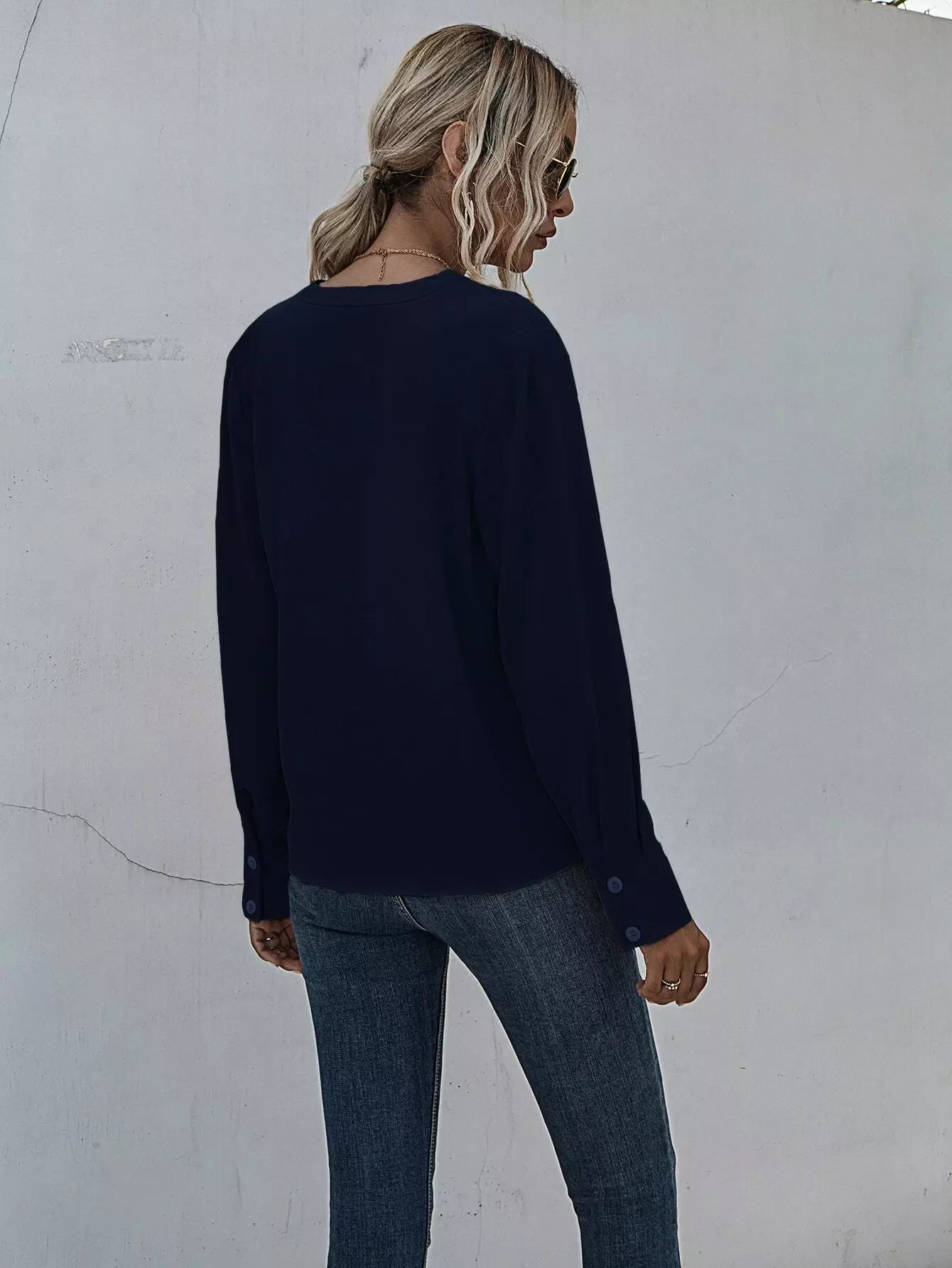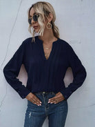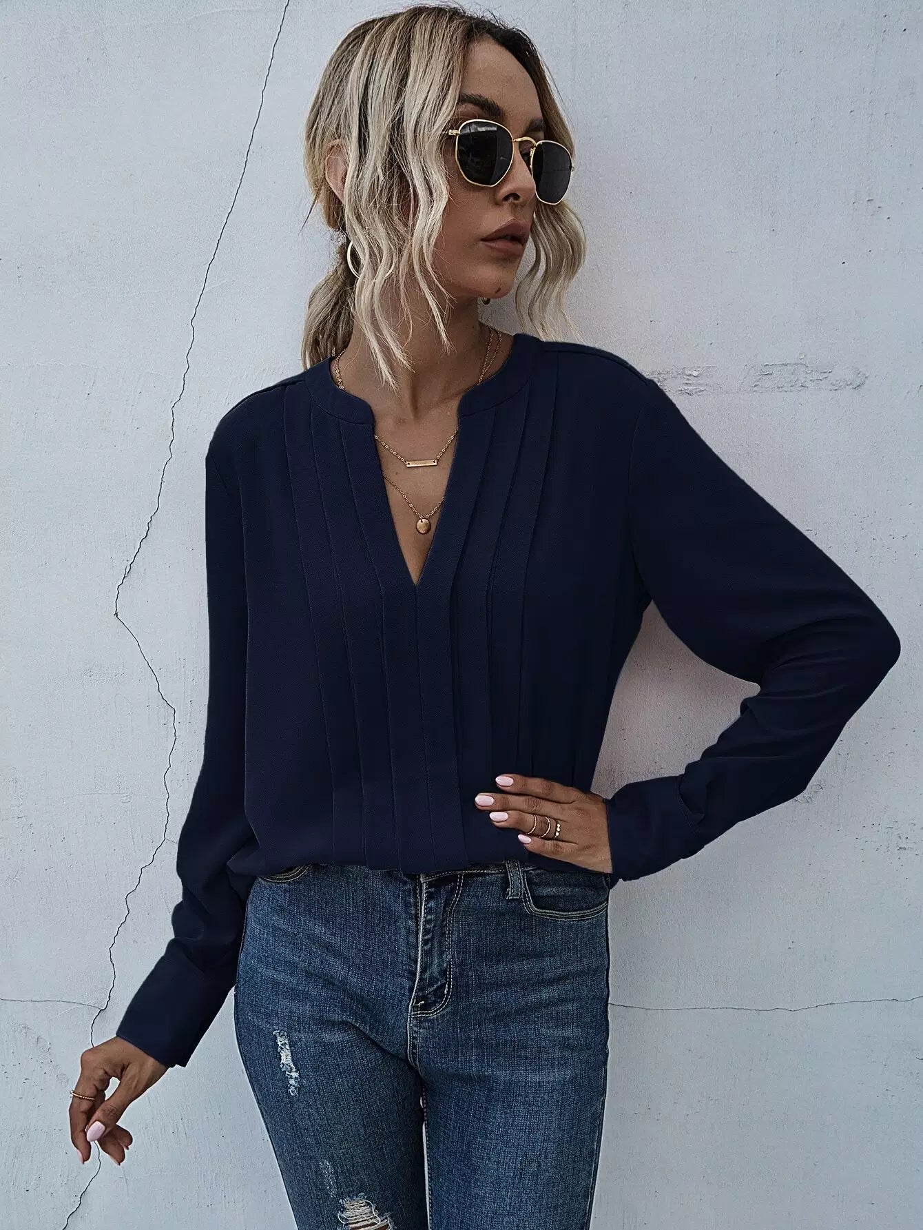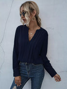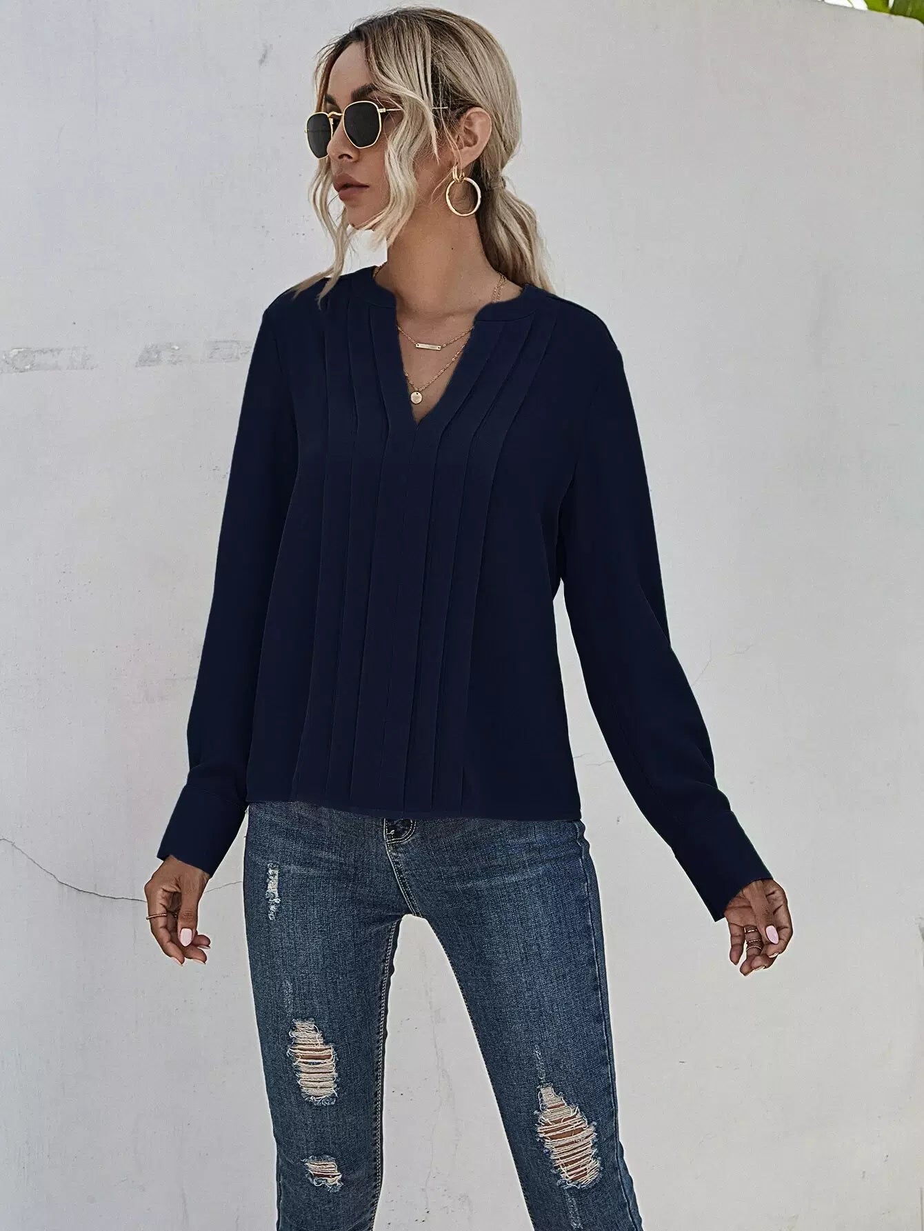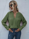 بلوزة مزخرفة بفتحة رقبة مشقوقة ومزخرفة بطيات