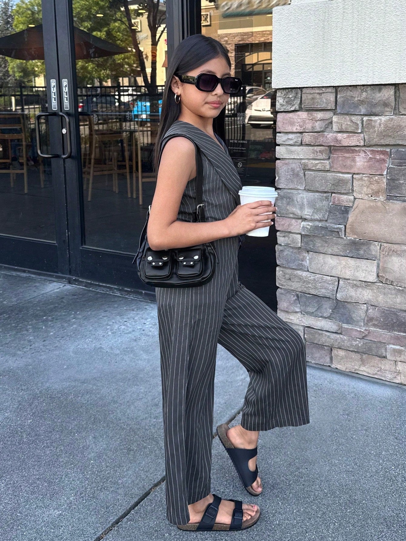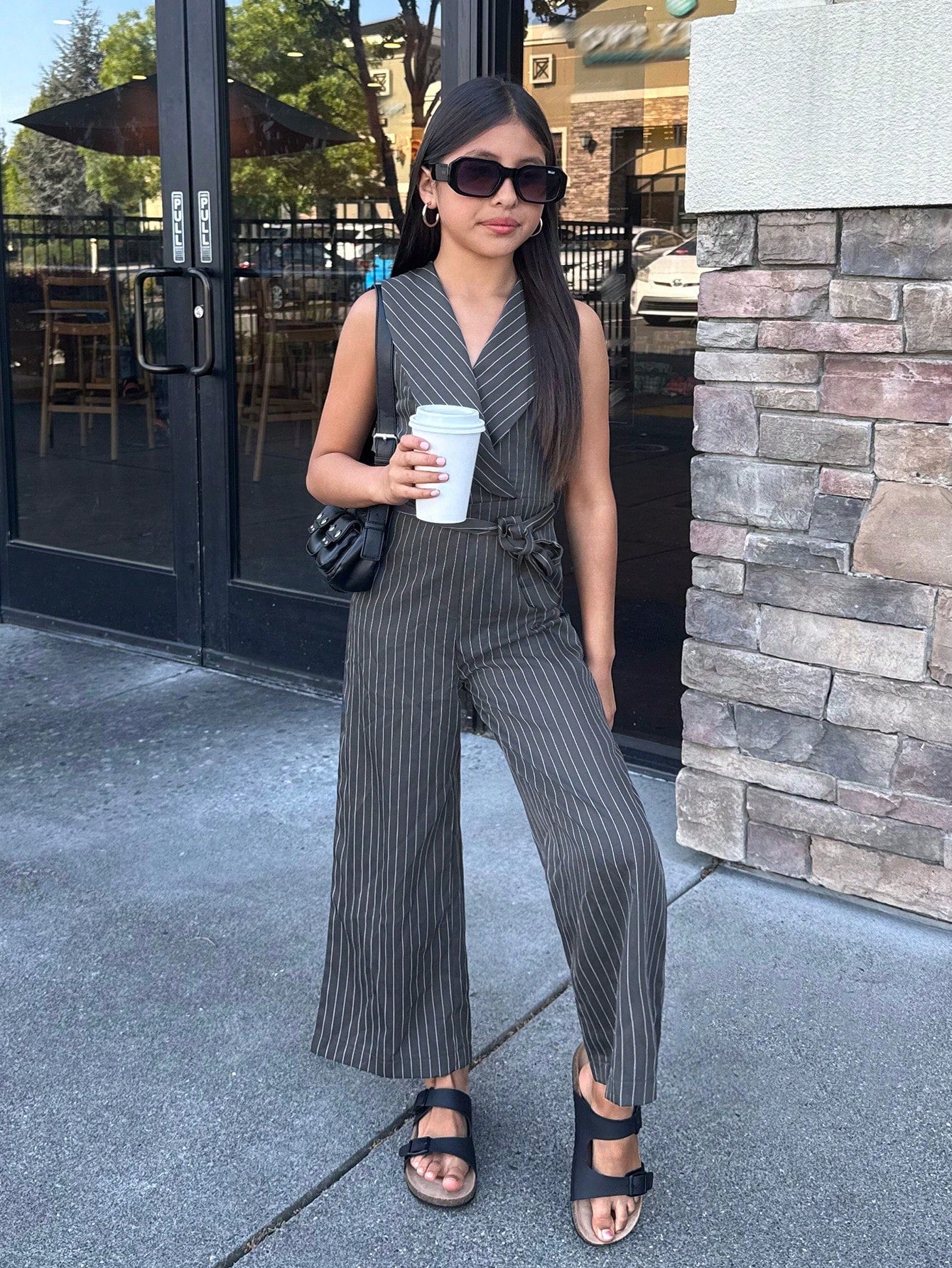 جمبسوت مخطط أزرق بياقة على شكل حرف V من Nova Glow Tween Girl، بنطلون كاجوال للتنقل