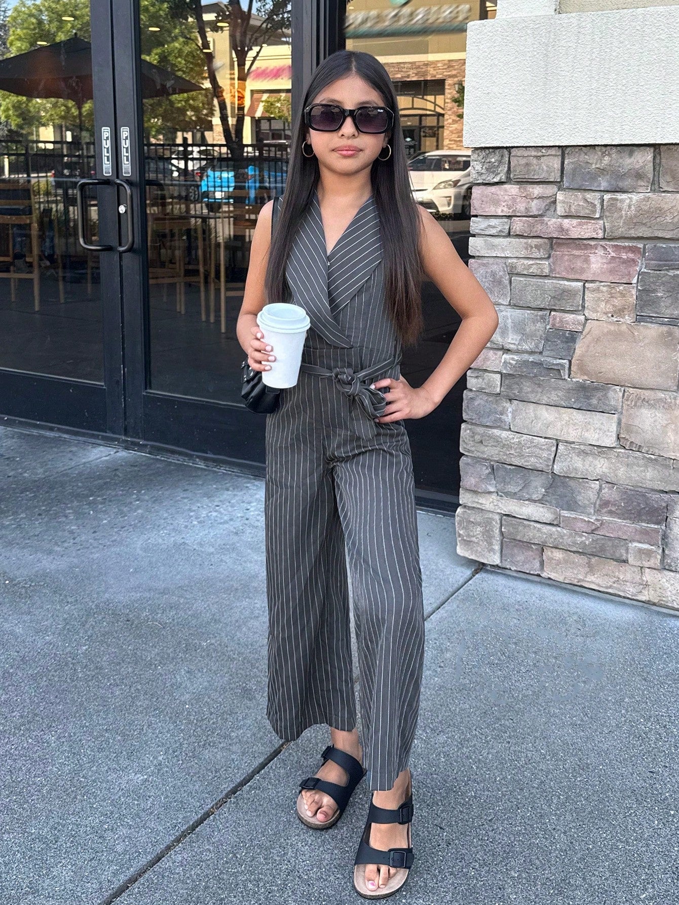 Nova Glow Tween Girl Fashion V-Neck Collar Blue Striped Jumpsuit Casual Commuting Pants