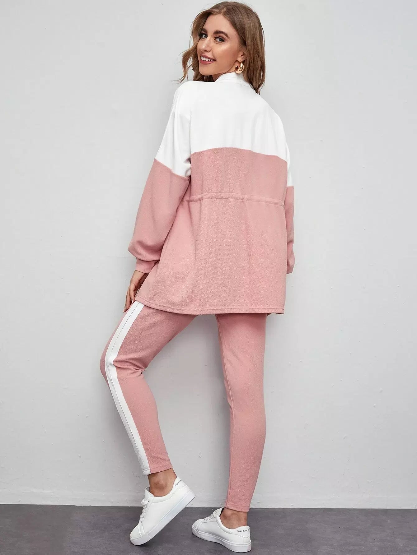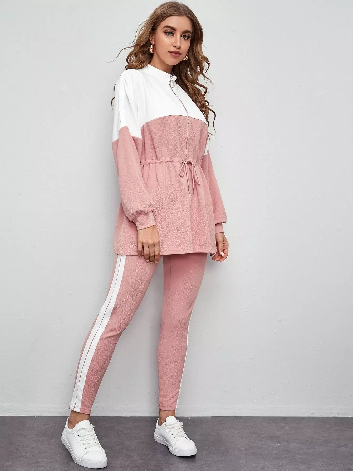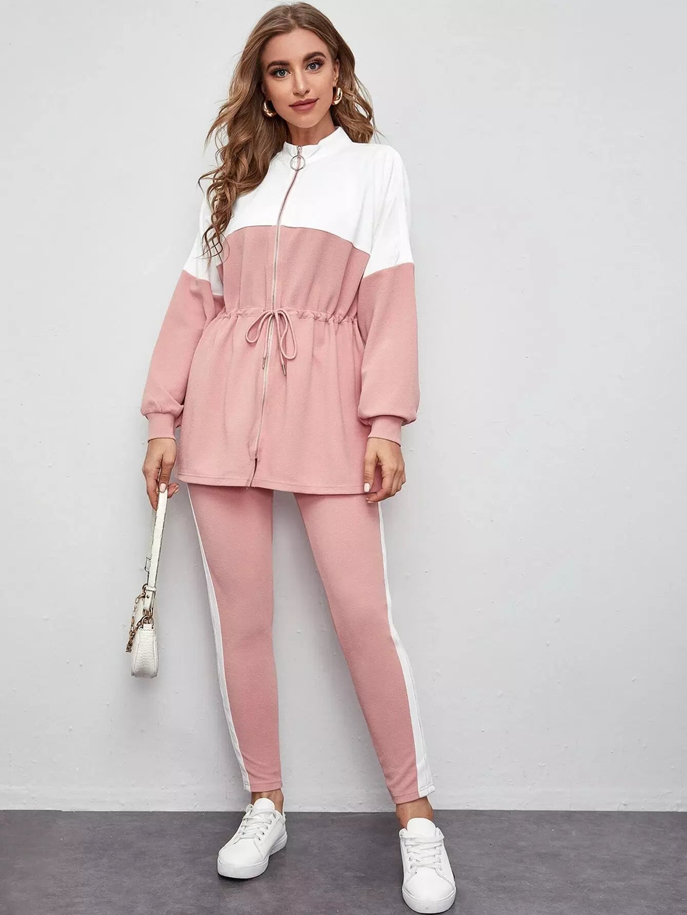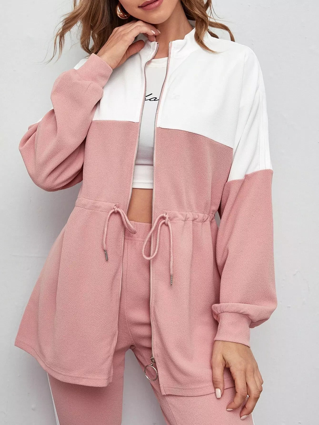 طقم بلوزة وبنطال ضيق ملون برباط على شكل حرف O بسحاب على الخصر