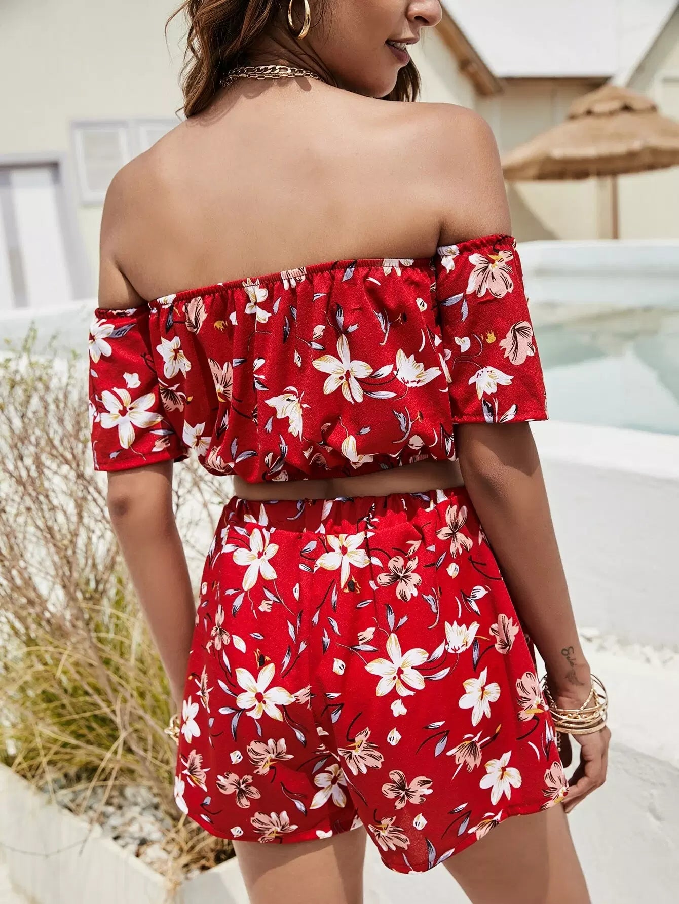 بلوزة وشورت بطبعة زهور عارية الأكتاف وشورت قصير