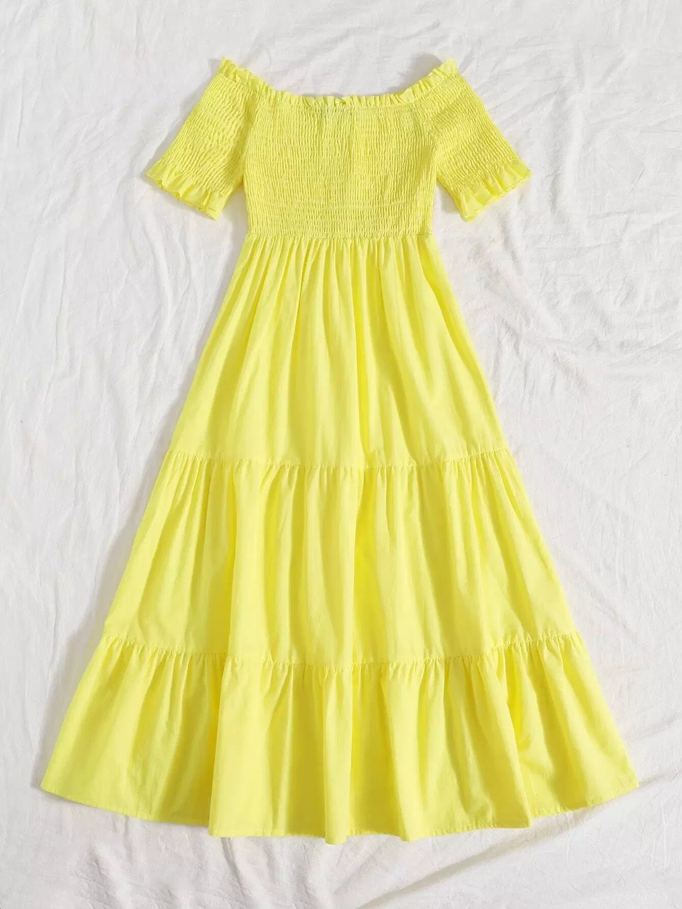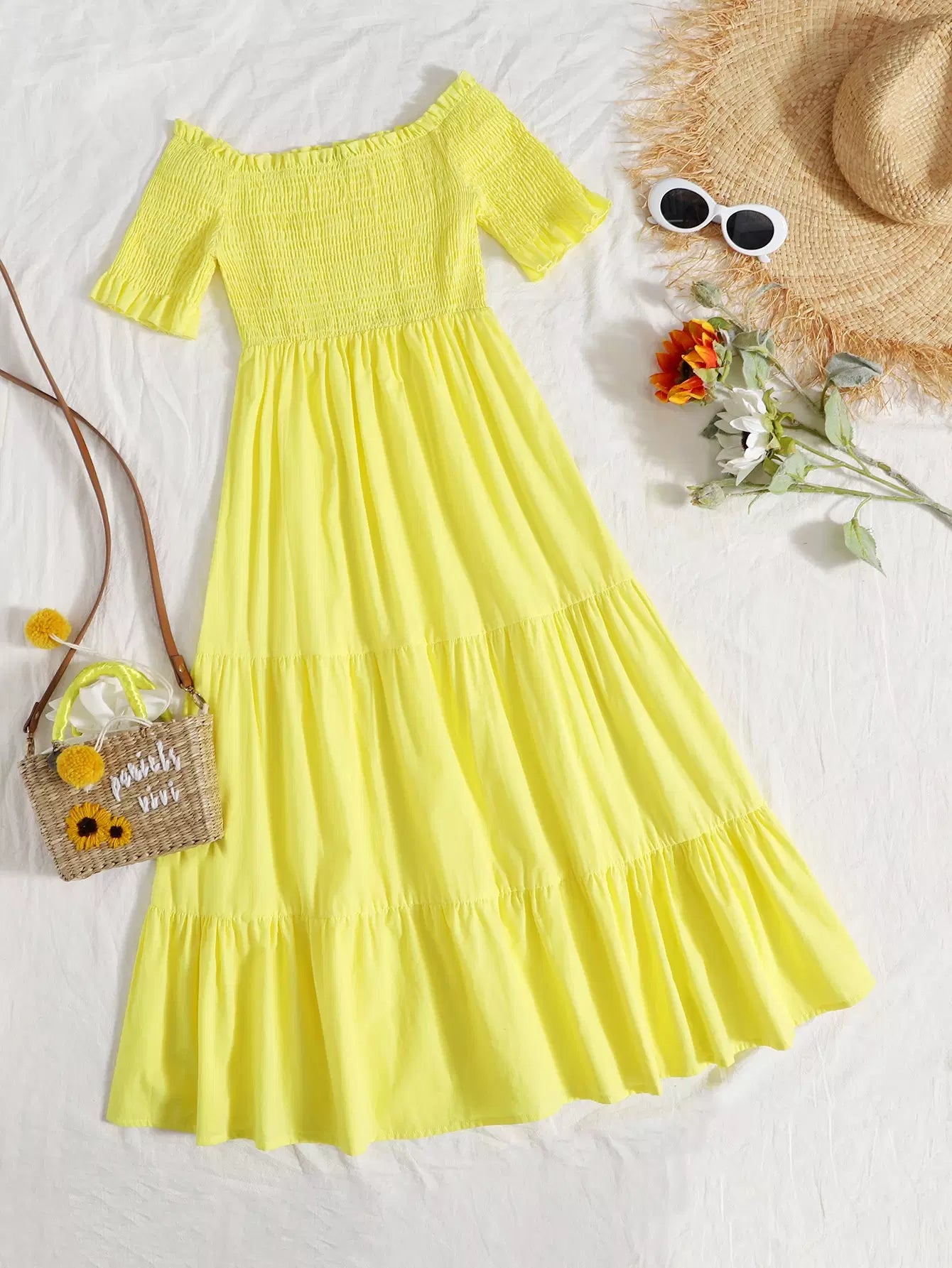 فستان مكشوف الأكتاف بحواف كشكش على الصدرية