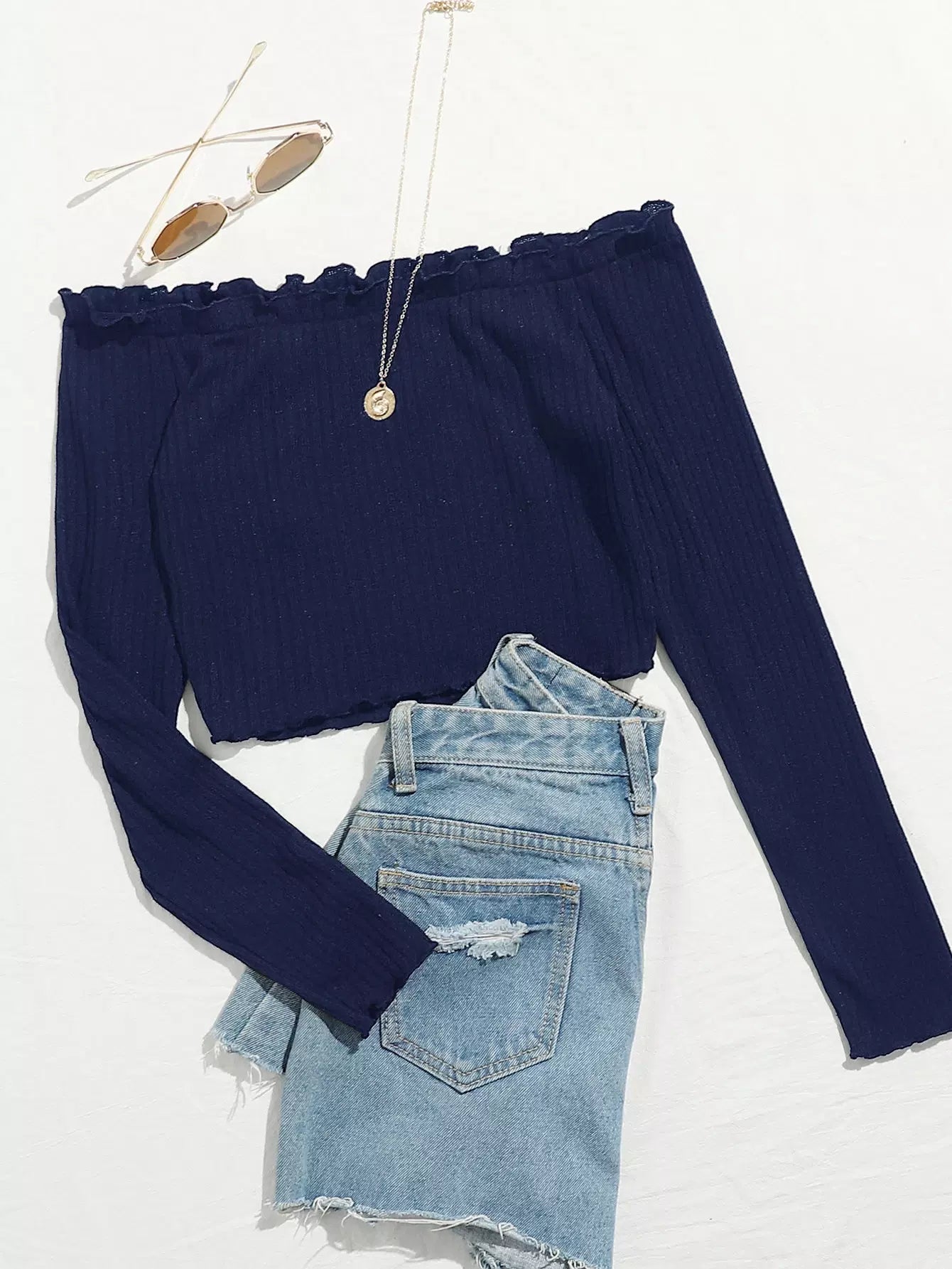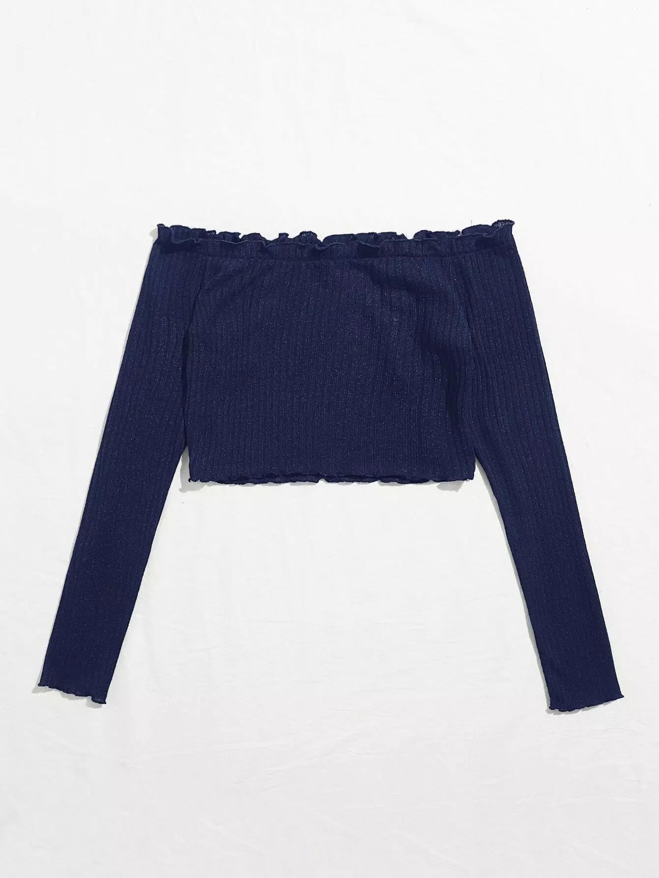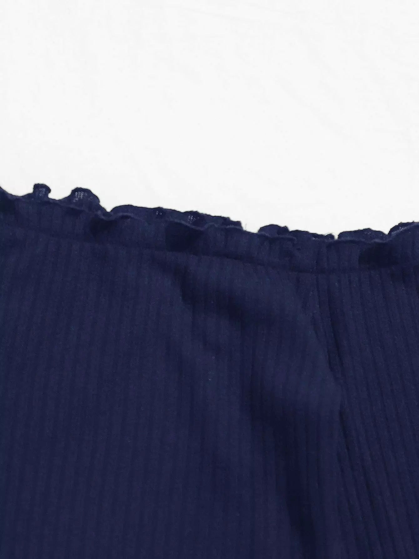 بلوزة قصيرة محبوكة على شكل ضلع محبوكة من دون أكتاف بحواف من الخس