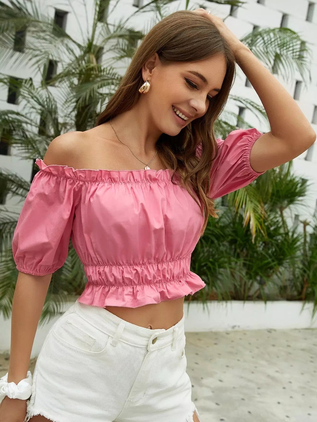 بلوزة قصيرة منفوشة بأكمام كشكش منفوشة من دون أكتاف