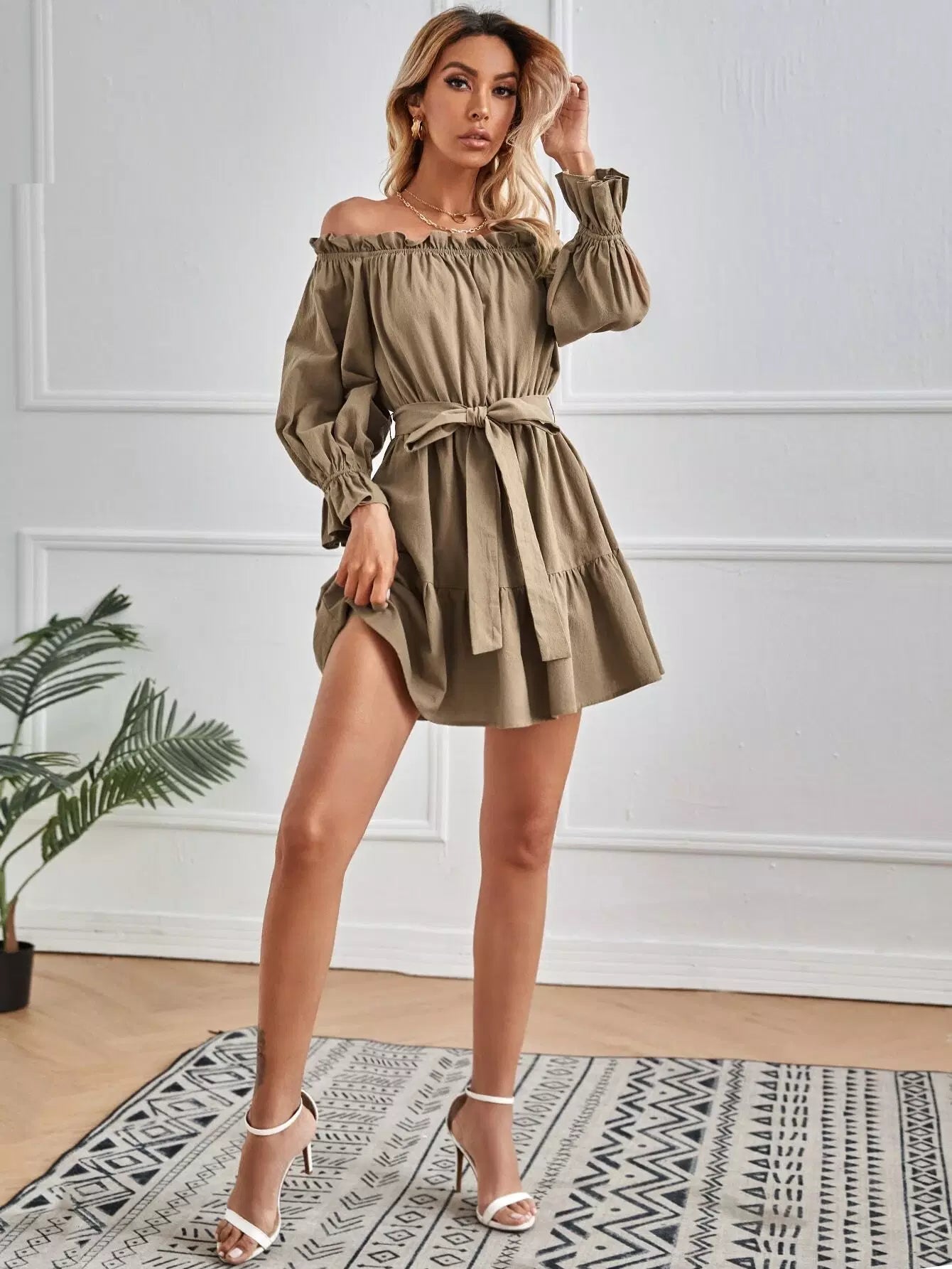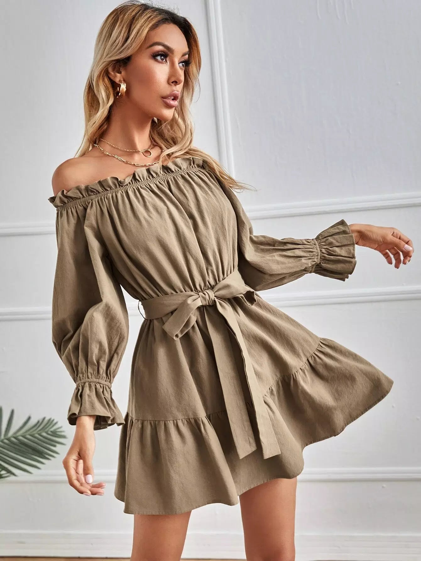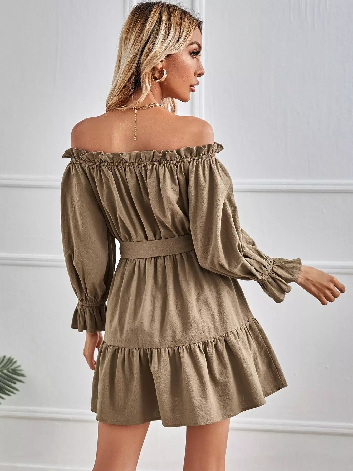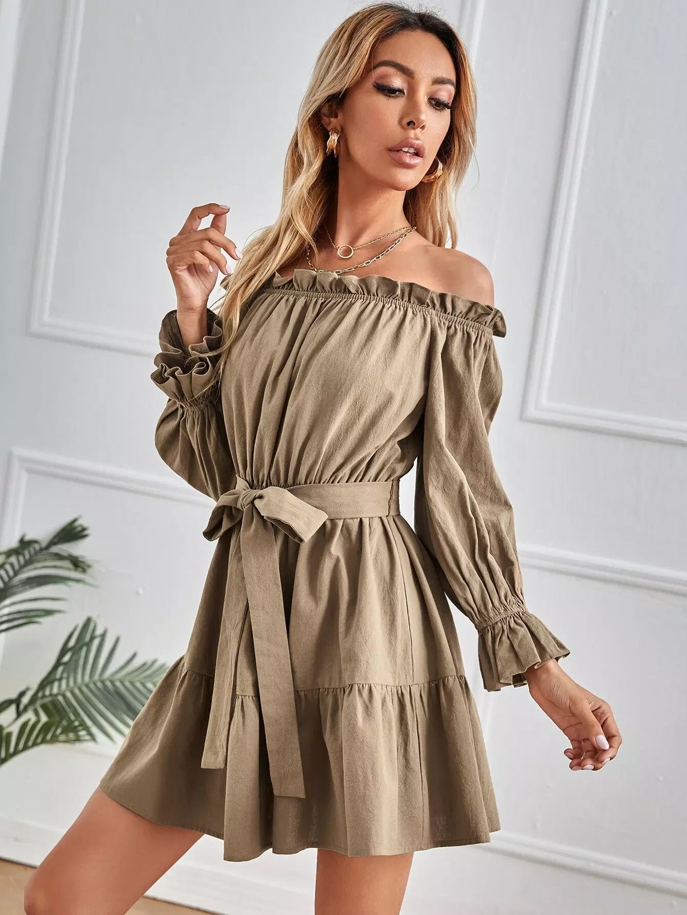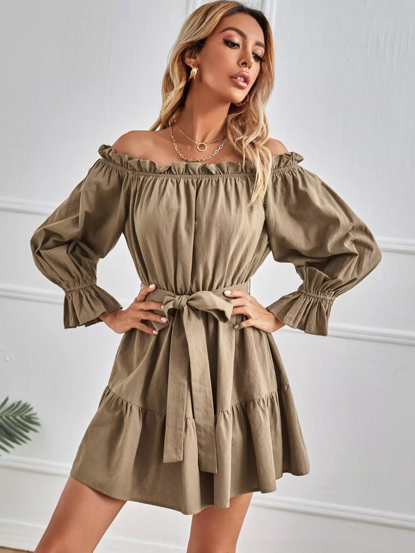فستان بحاشية مكشكشة مكشوفة الكتفين بدون حزام