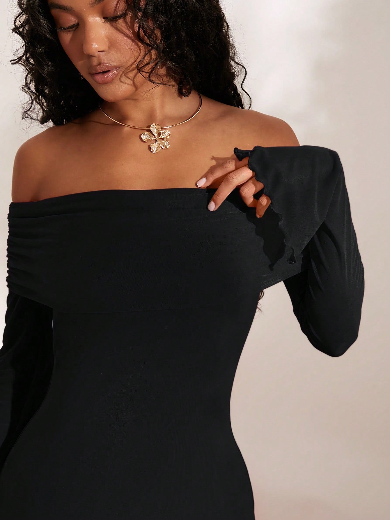 Opulessa Women's Elegant Romantic Minimalist Off-Shoulder, Slit, Bell Sleeve Dress