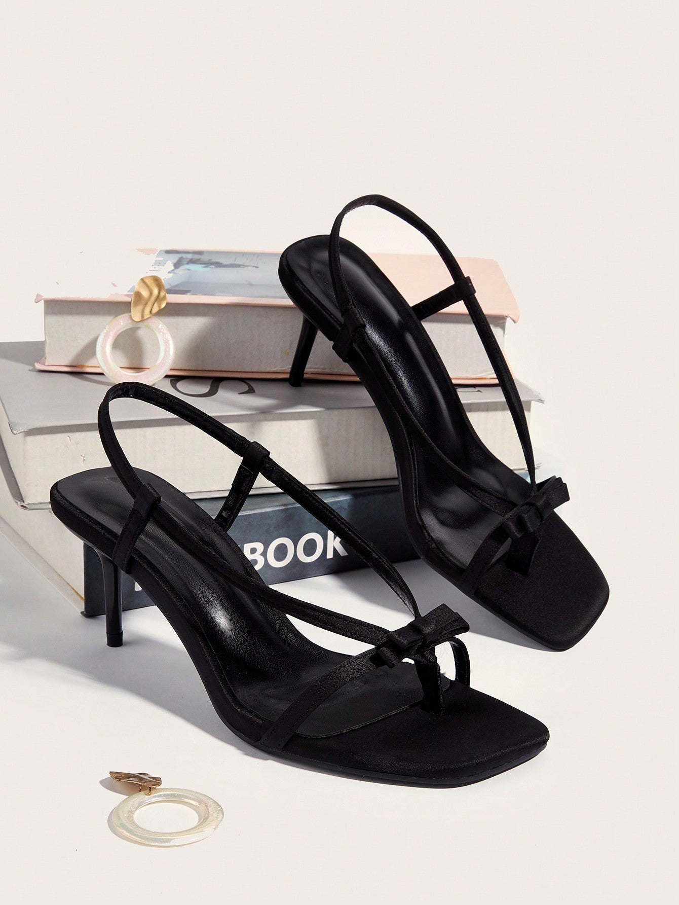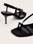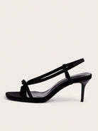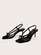 صندل أسود بكعب عالٍ مزين بفيونكة، مناسب للحفلات والإجازات