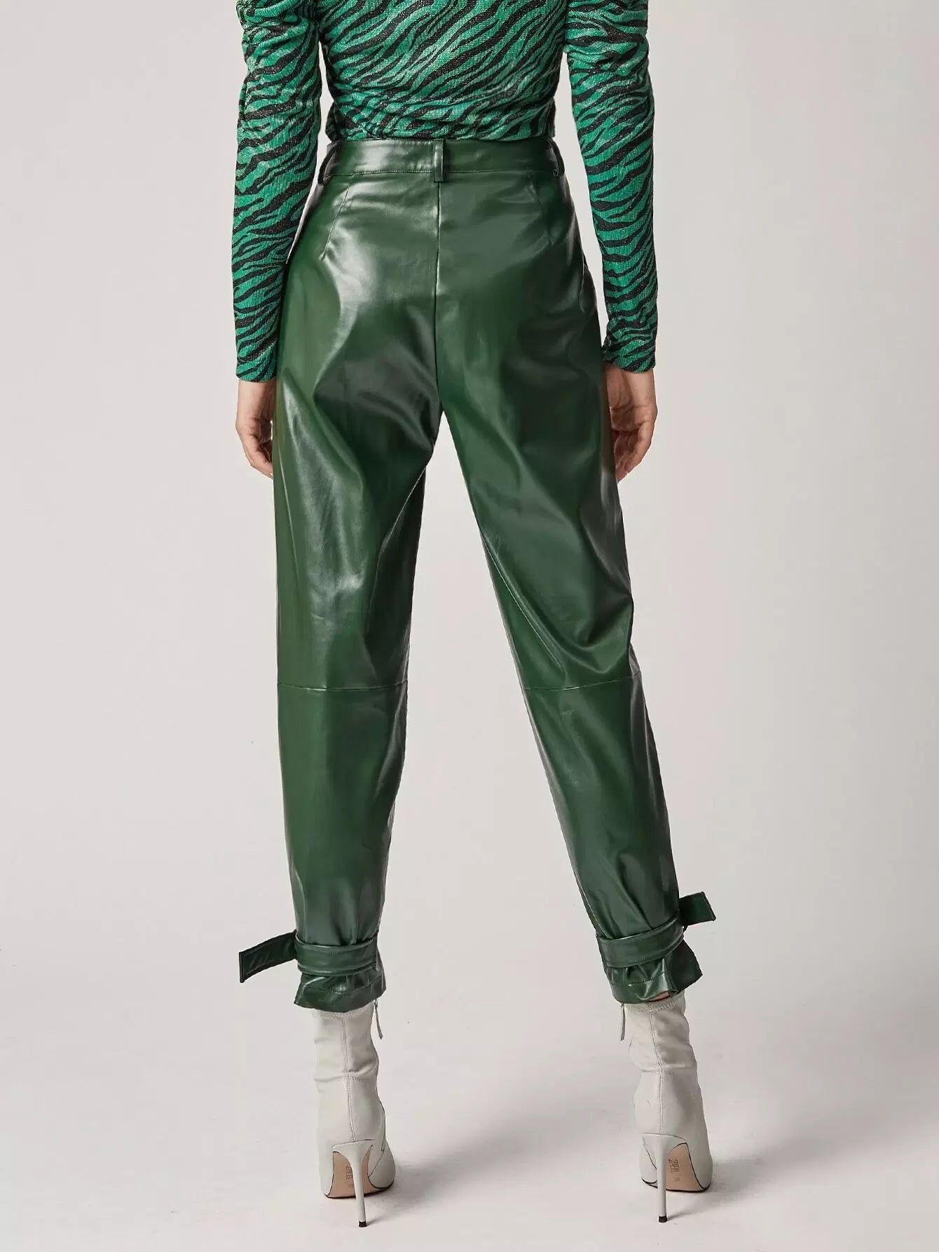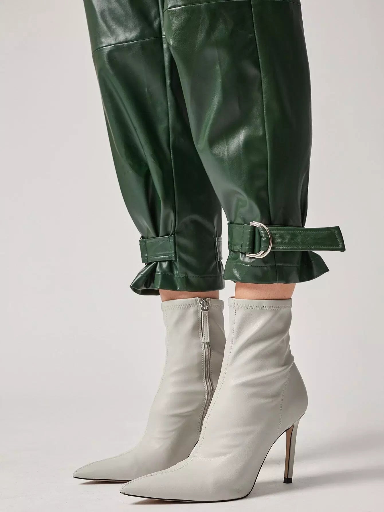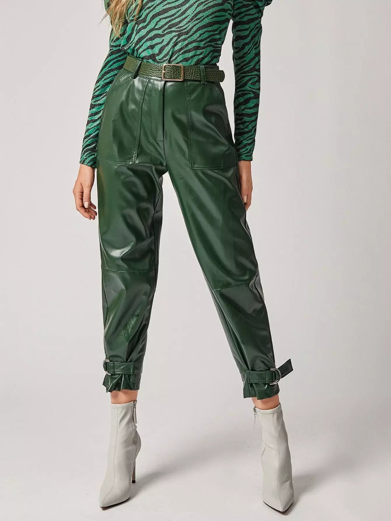 بنطال من الجلد الصناعي مزود بحزام وحلقة على شكل حرف D وجيب رقعة