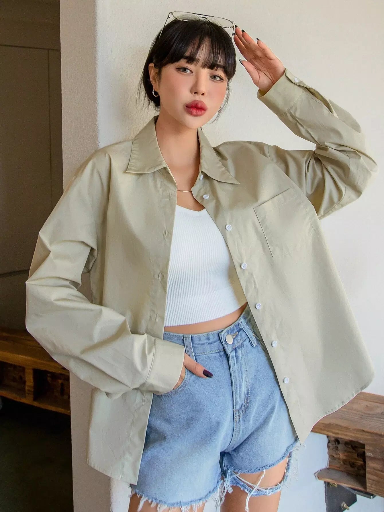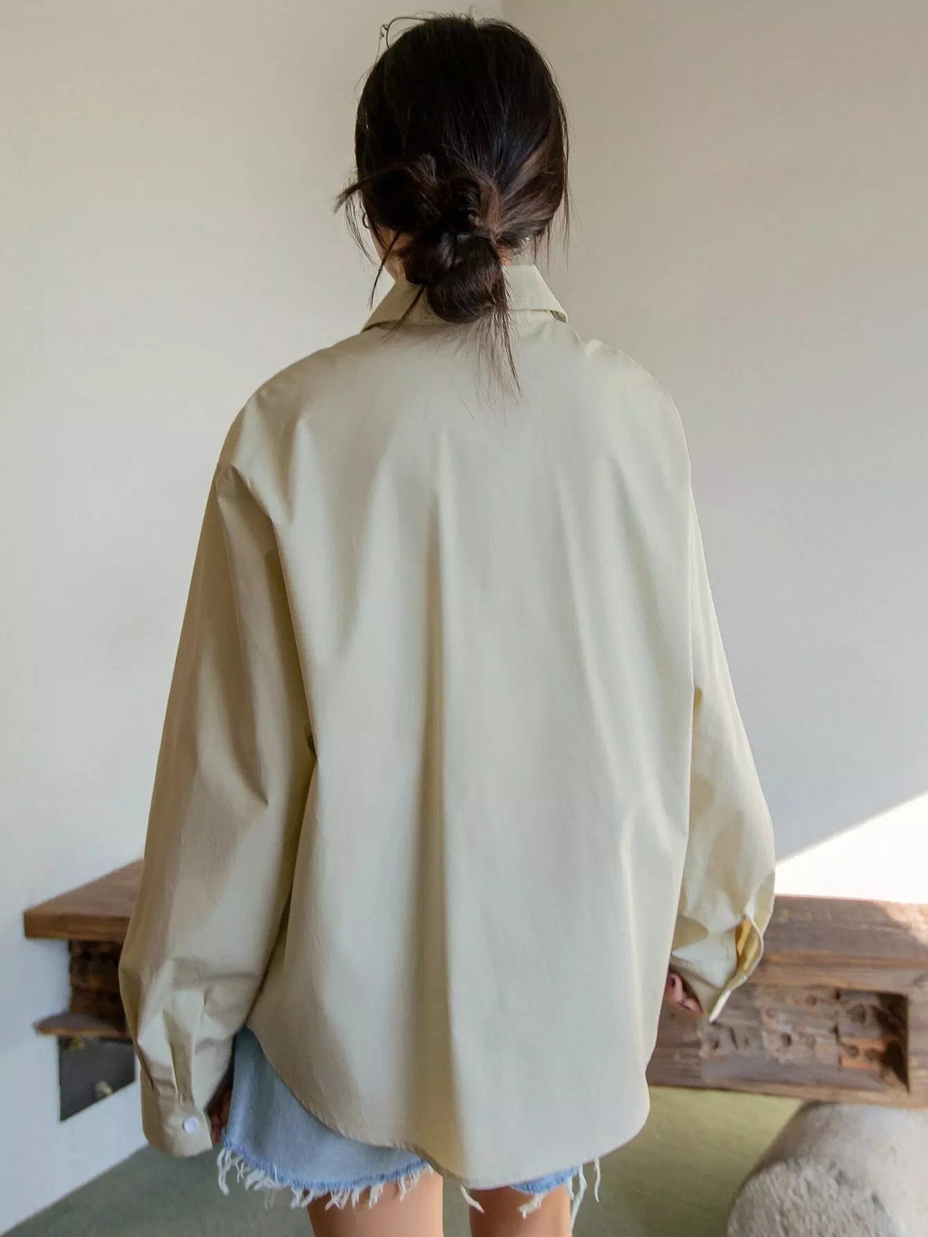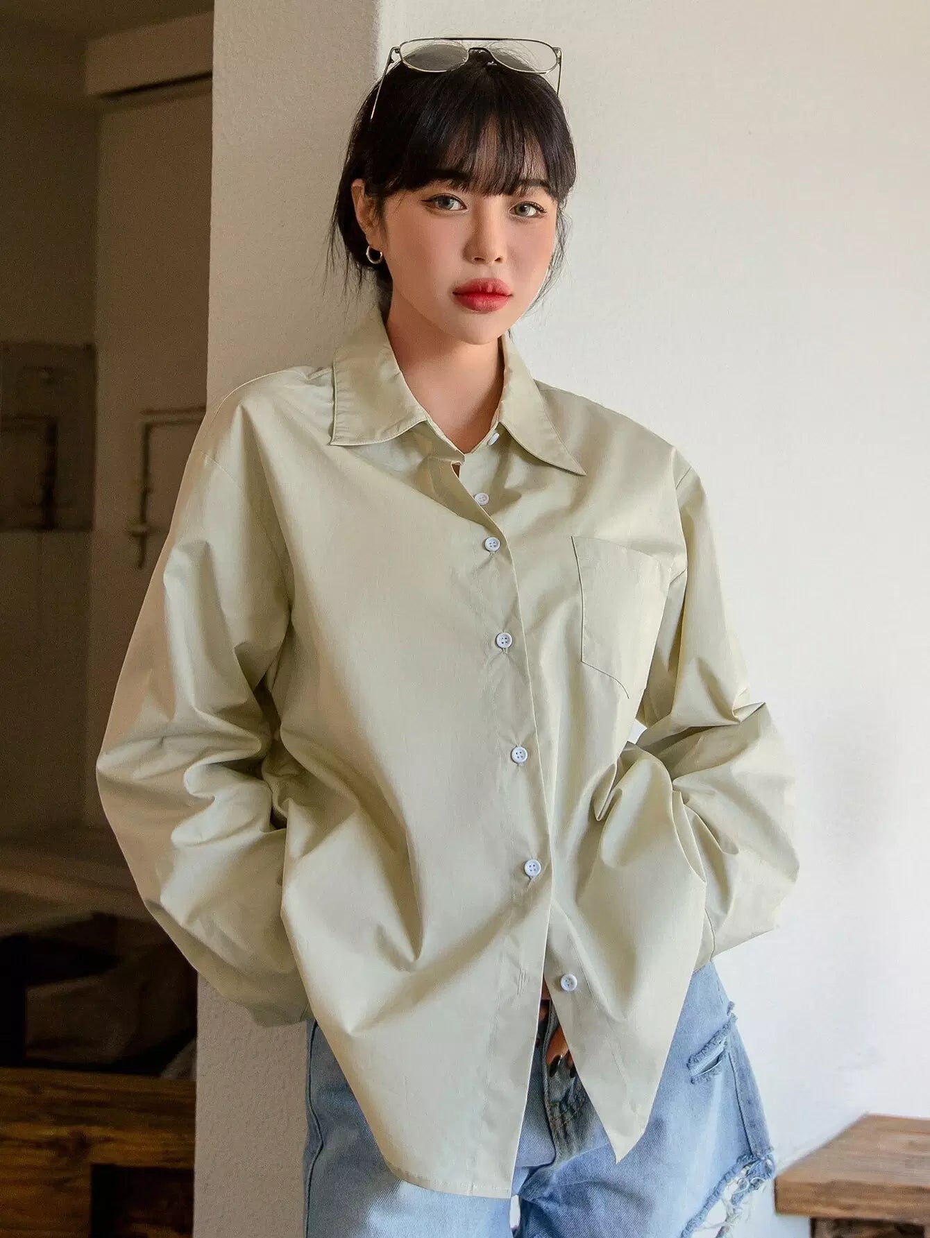 بلوزة منسدلة الكتفين ذات جيب مرقع