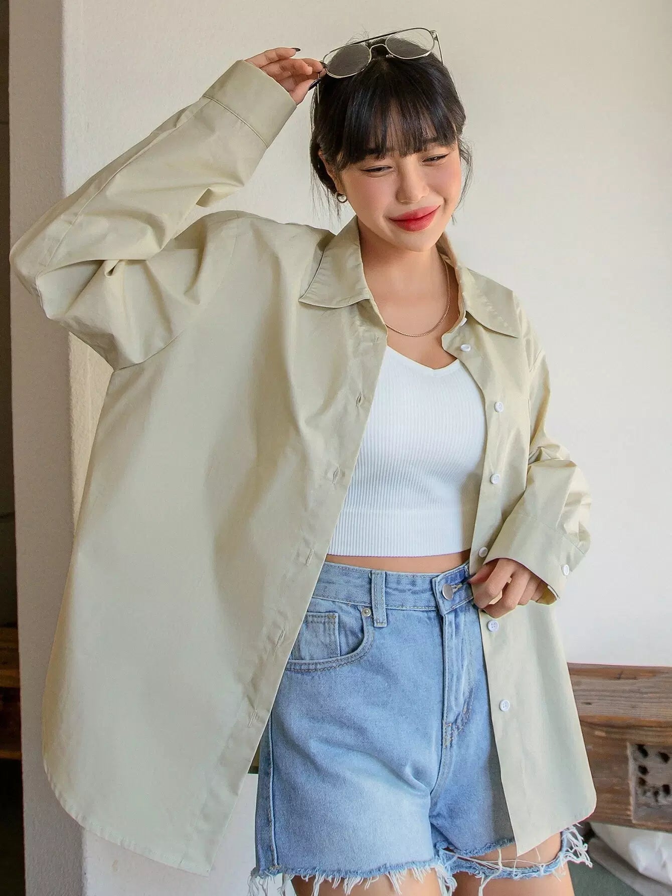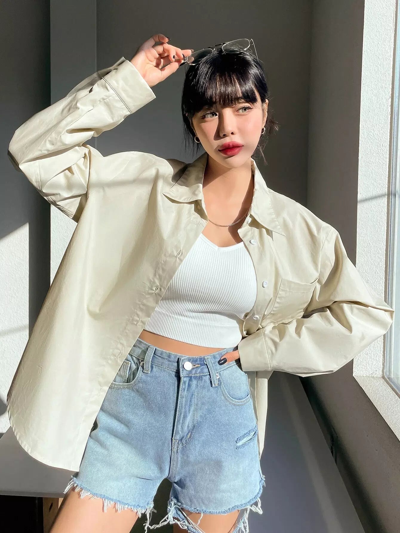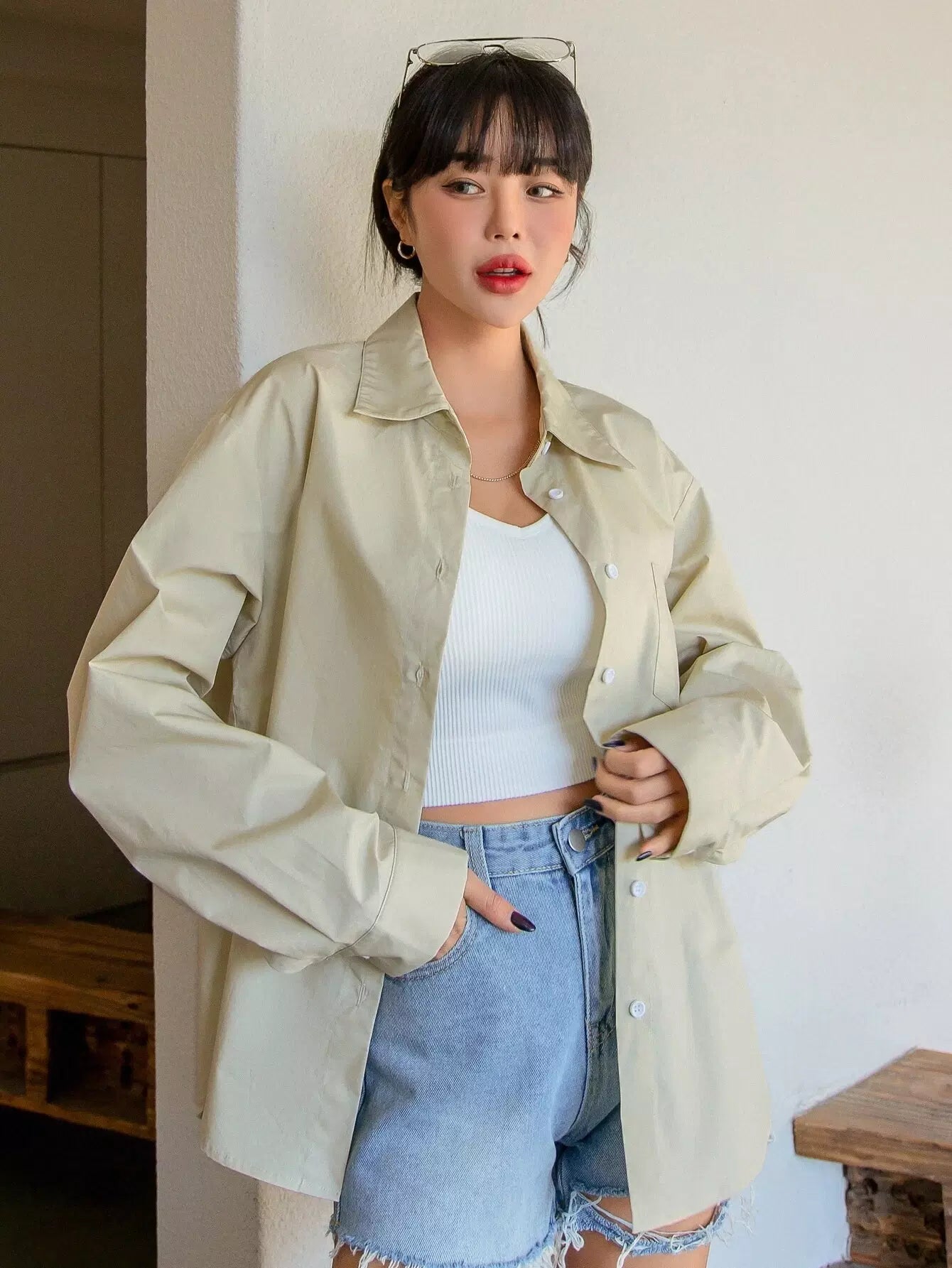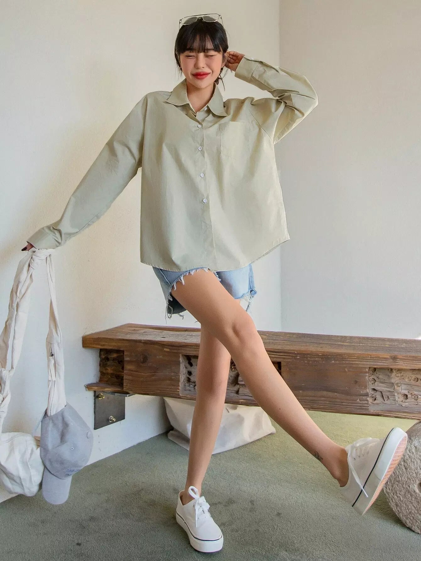 بلوزة منسدلة الكتفين ذات جيب مرقع
