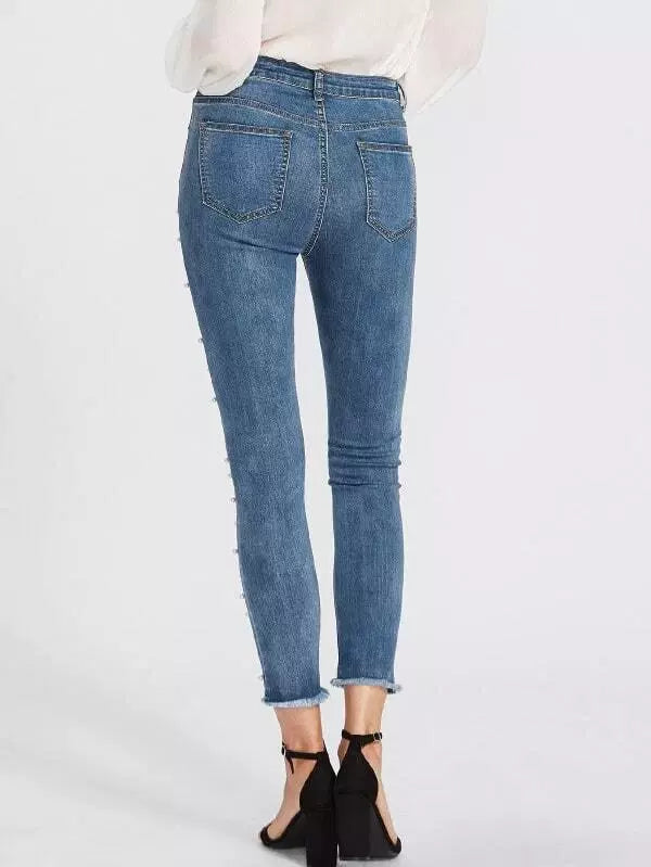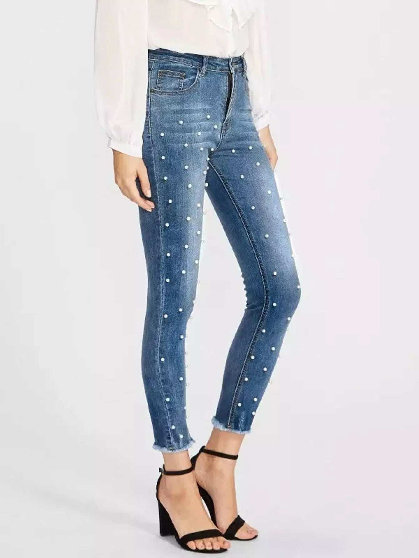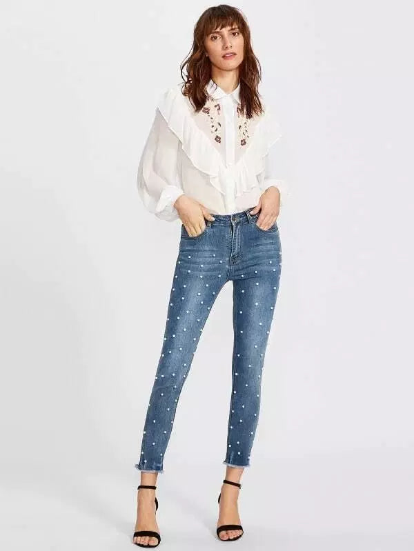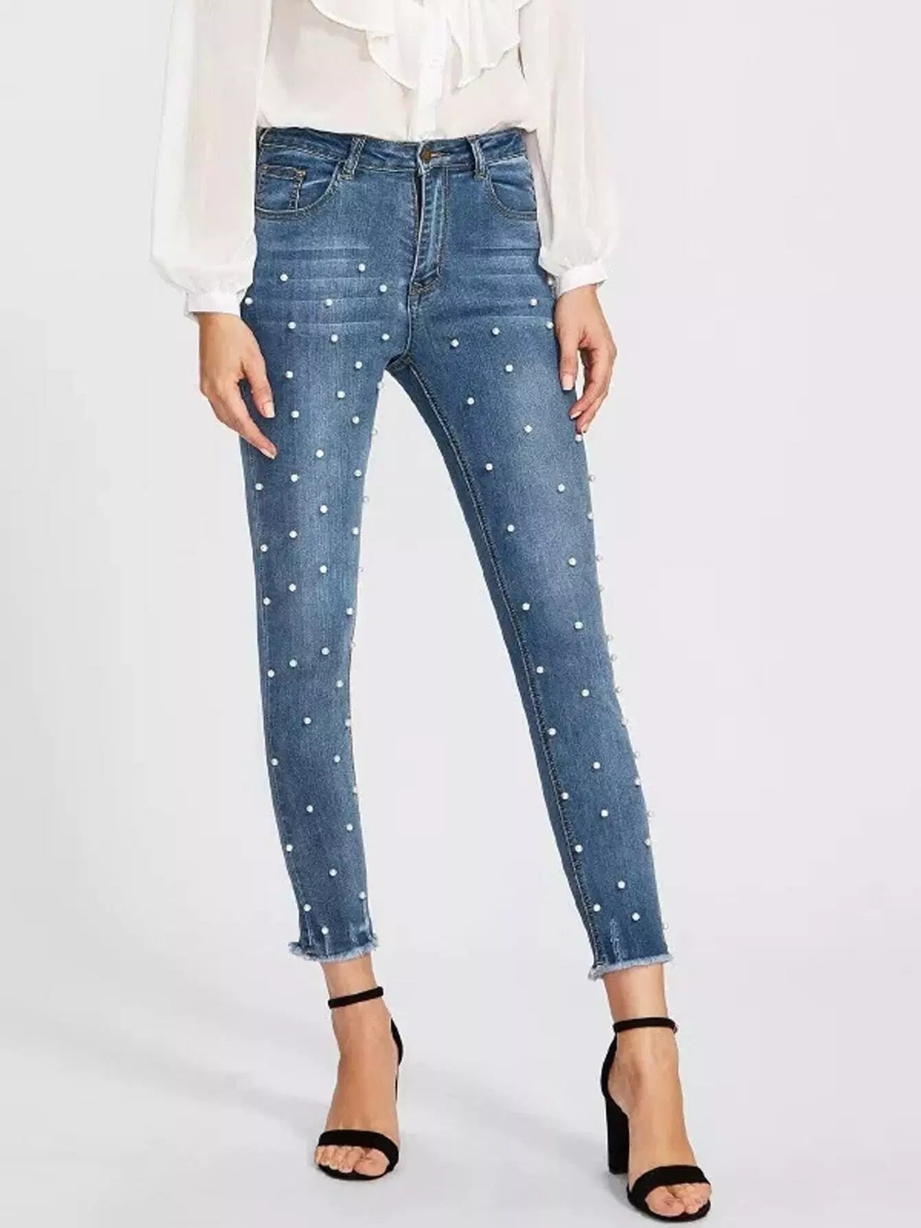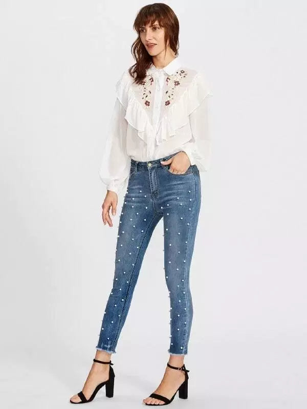 بنطلون جينز بحاشية مطرزة بالخرز اللؤلؤي
