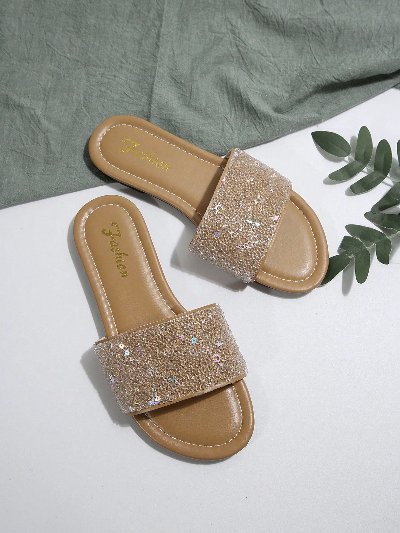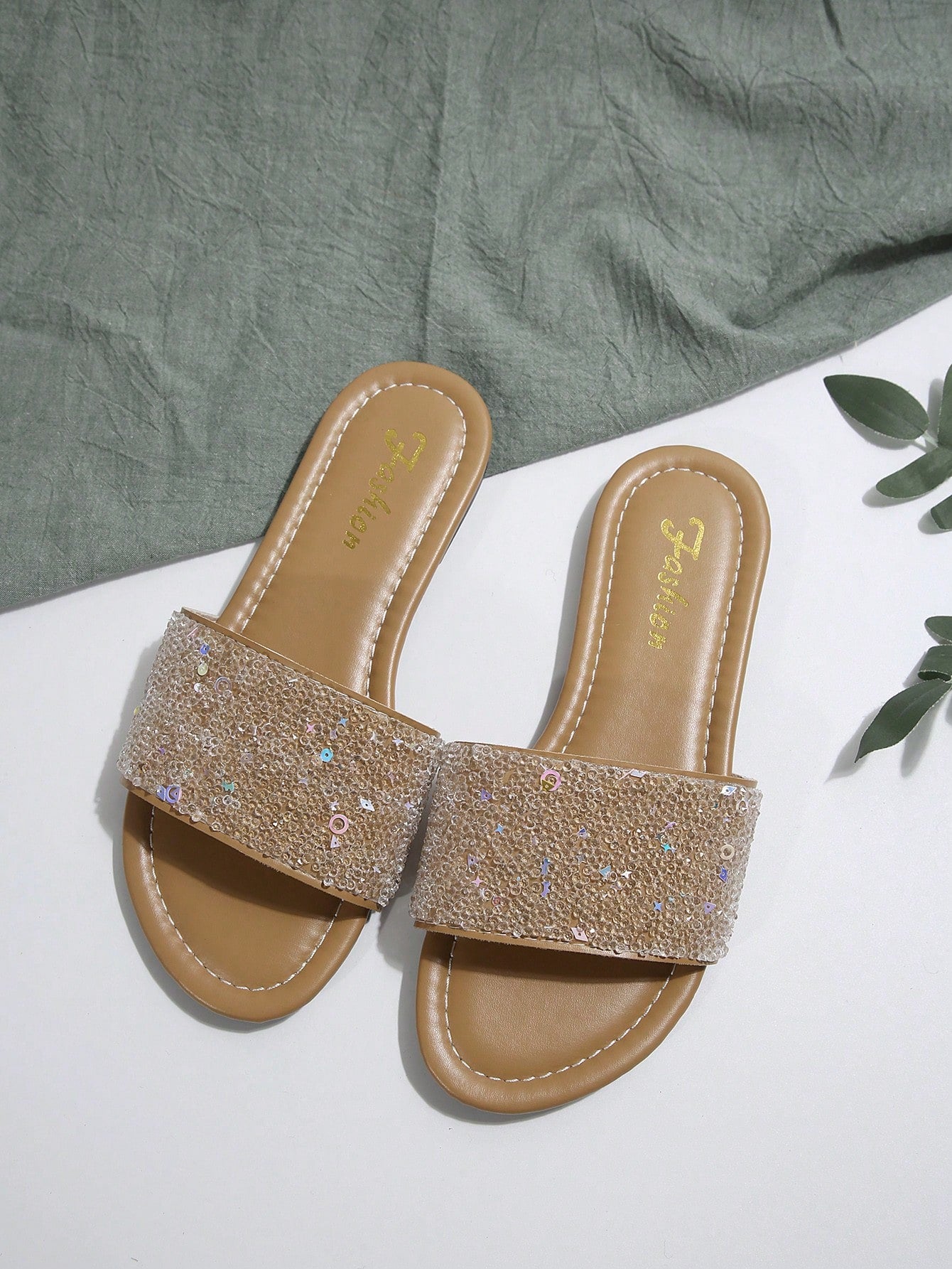 women Pearl & Rhinestone Embellished French Style Open Toe Flatform Slippers