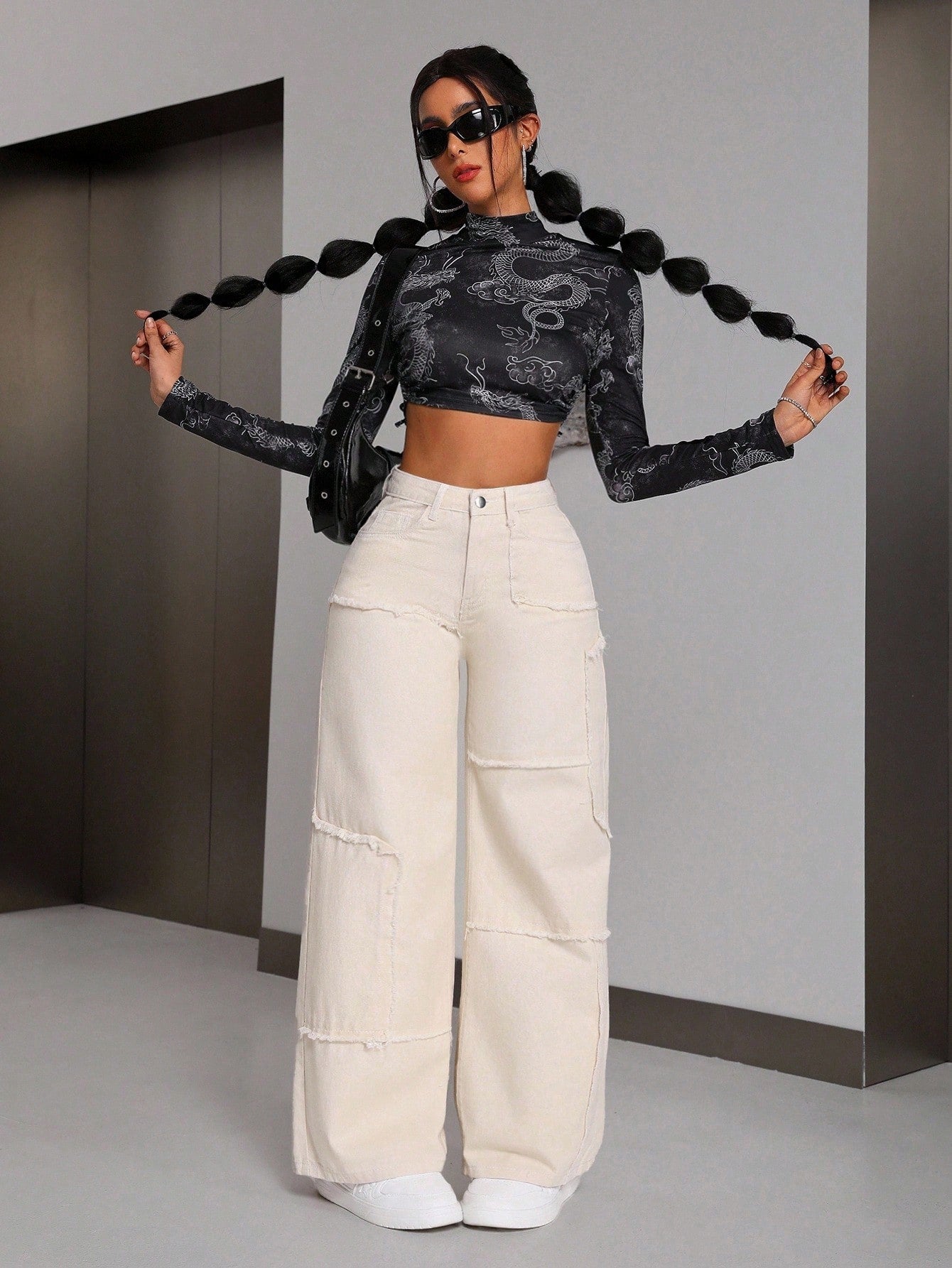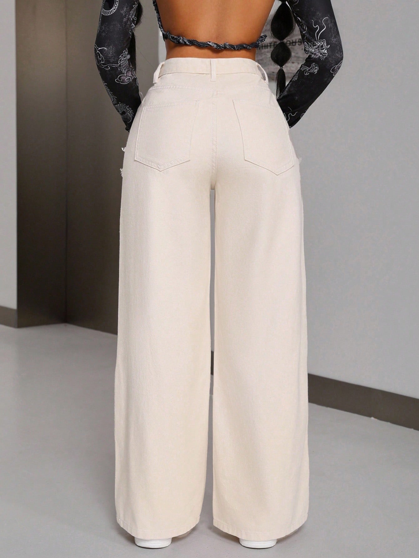 بنطلون جينز فضفاض بقصة قصيرة للنساء ذوات القامة القصيرة، مزين بتطريزات من الصوف.