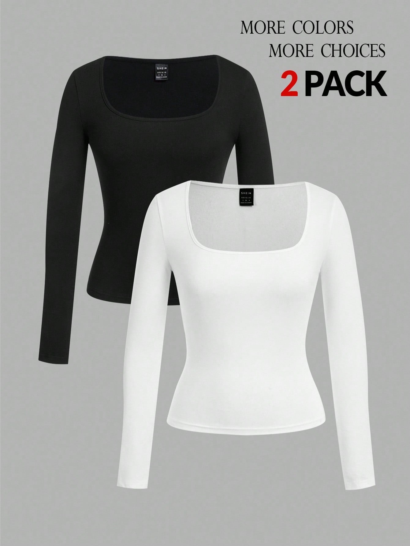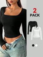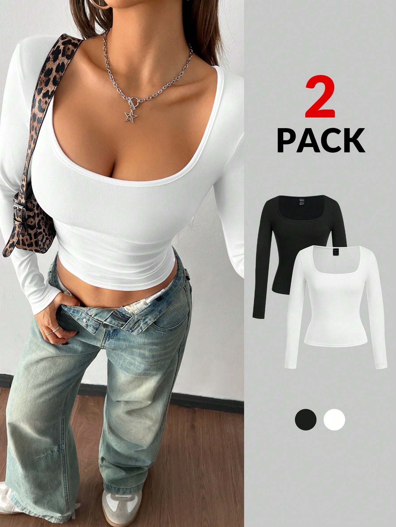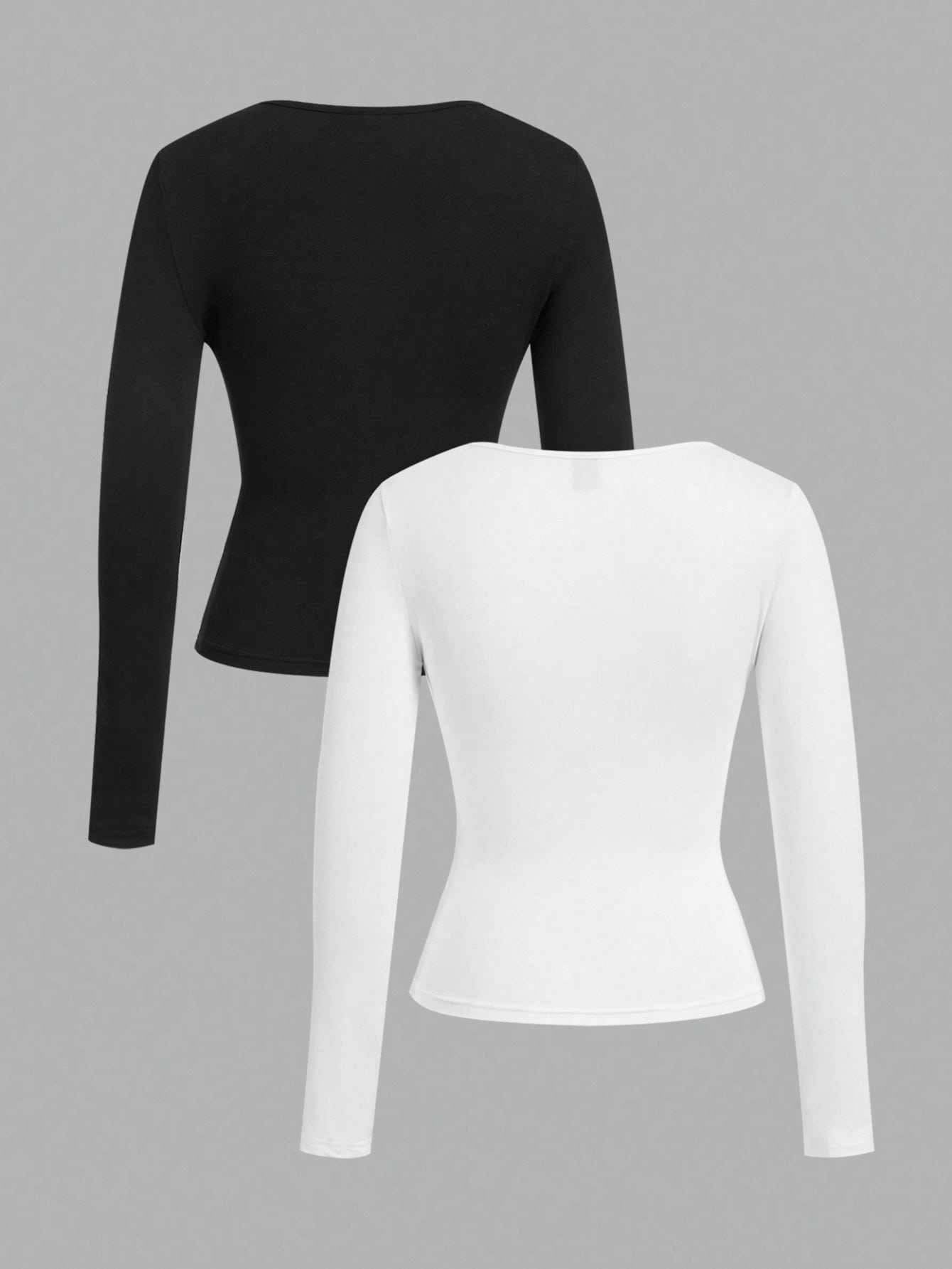 تيشيرت نسائي ضيق بأكمام طويلة، أسود وأبيض، عبوة من قطعتين، مناسب للمقاسات الصغيرة