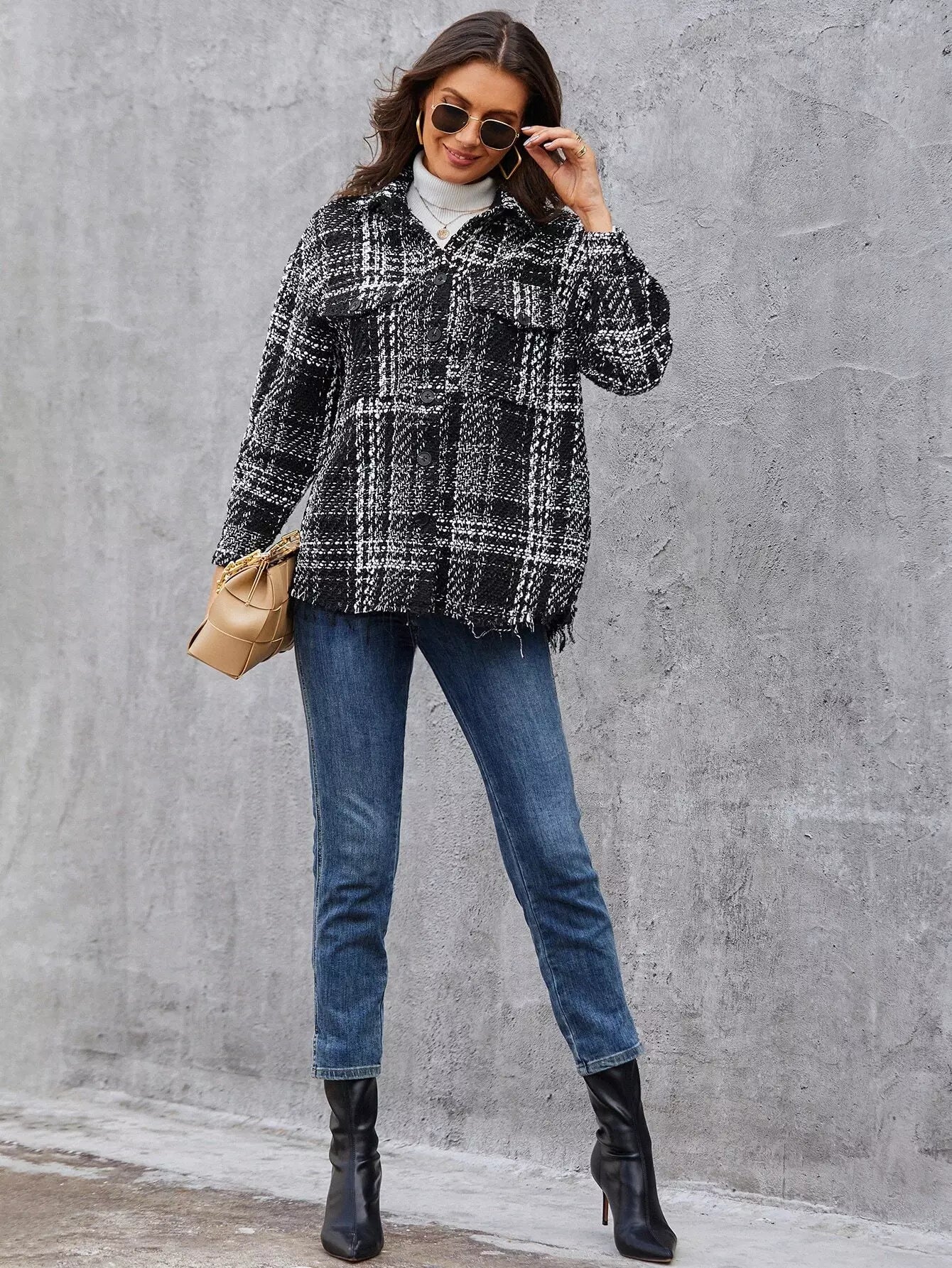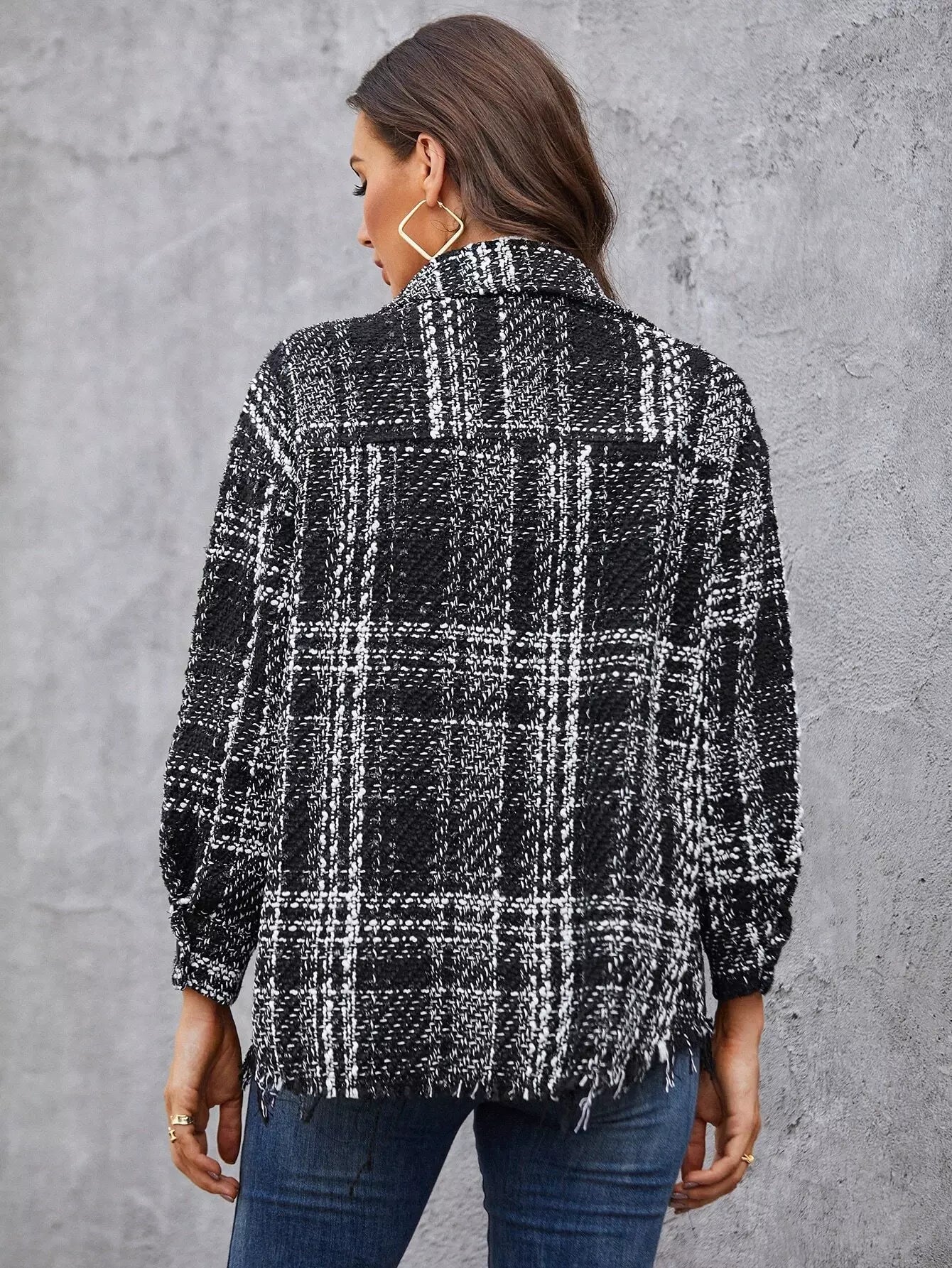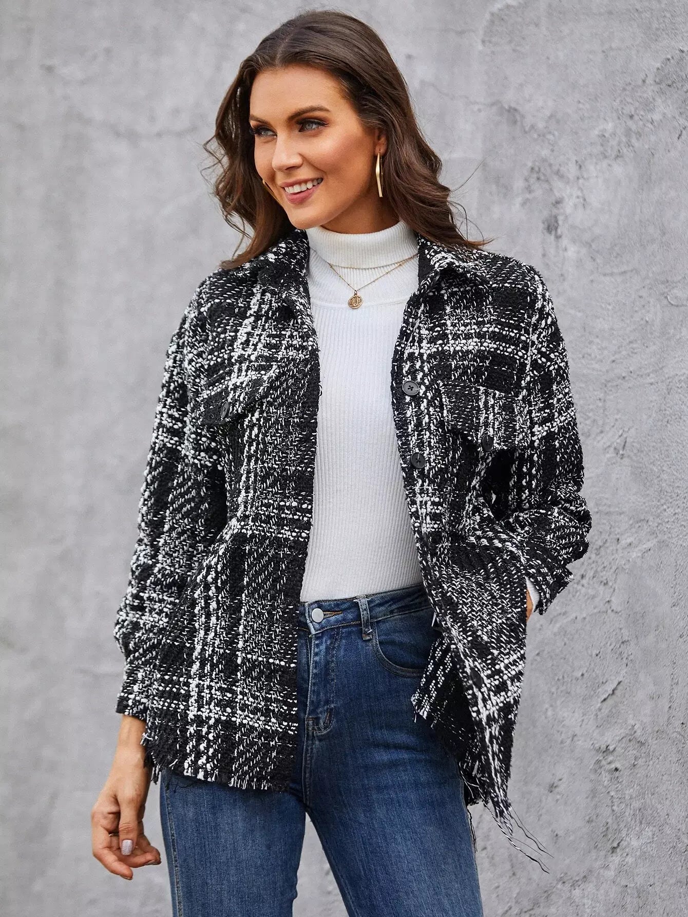 للنساء - سترة من التويد بطبعة منقوشة وجيب بغطاء قلاب وأزرار لأعلى