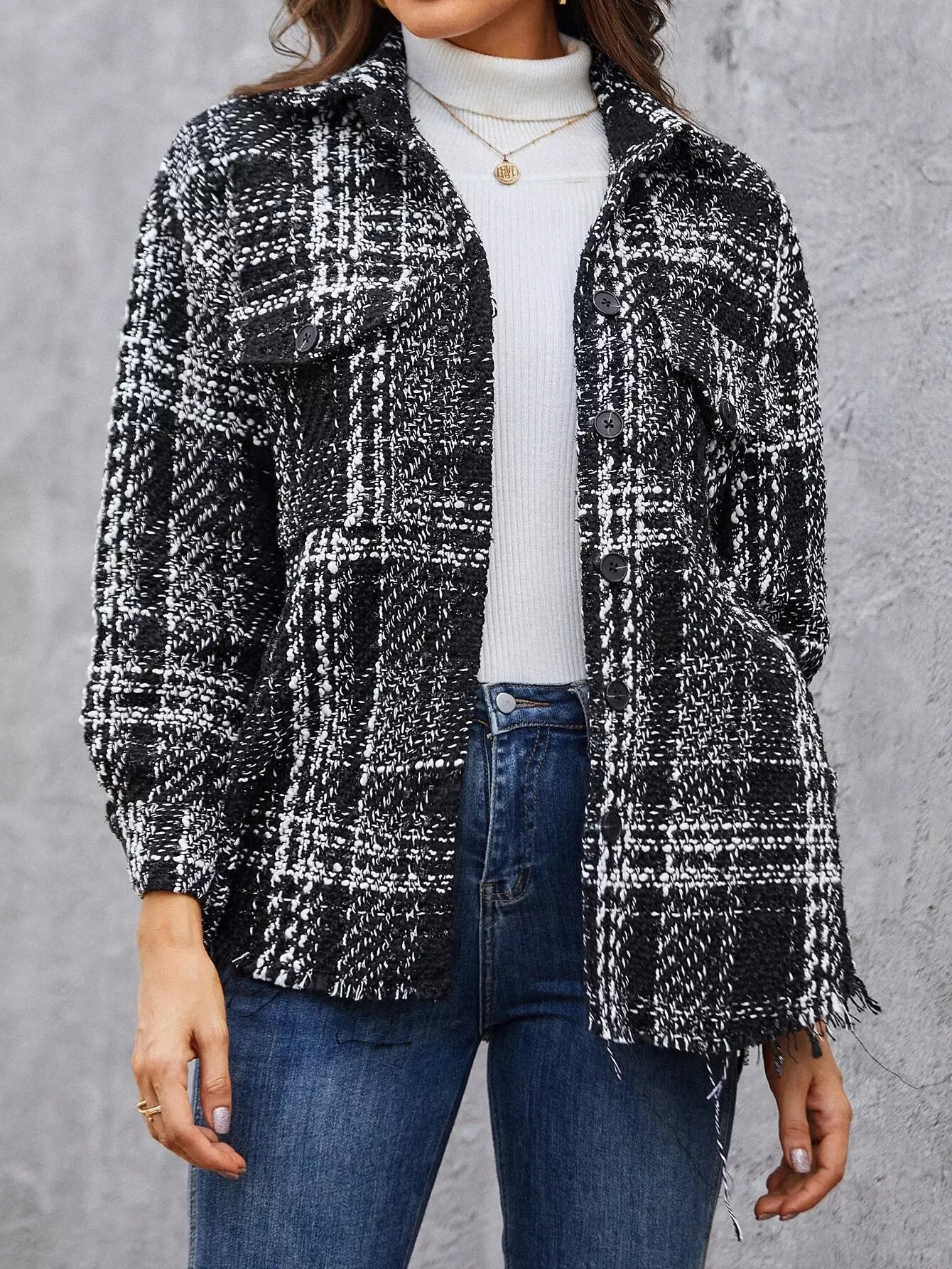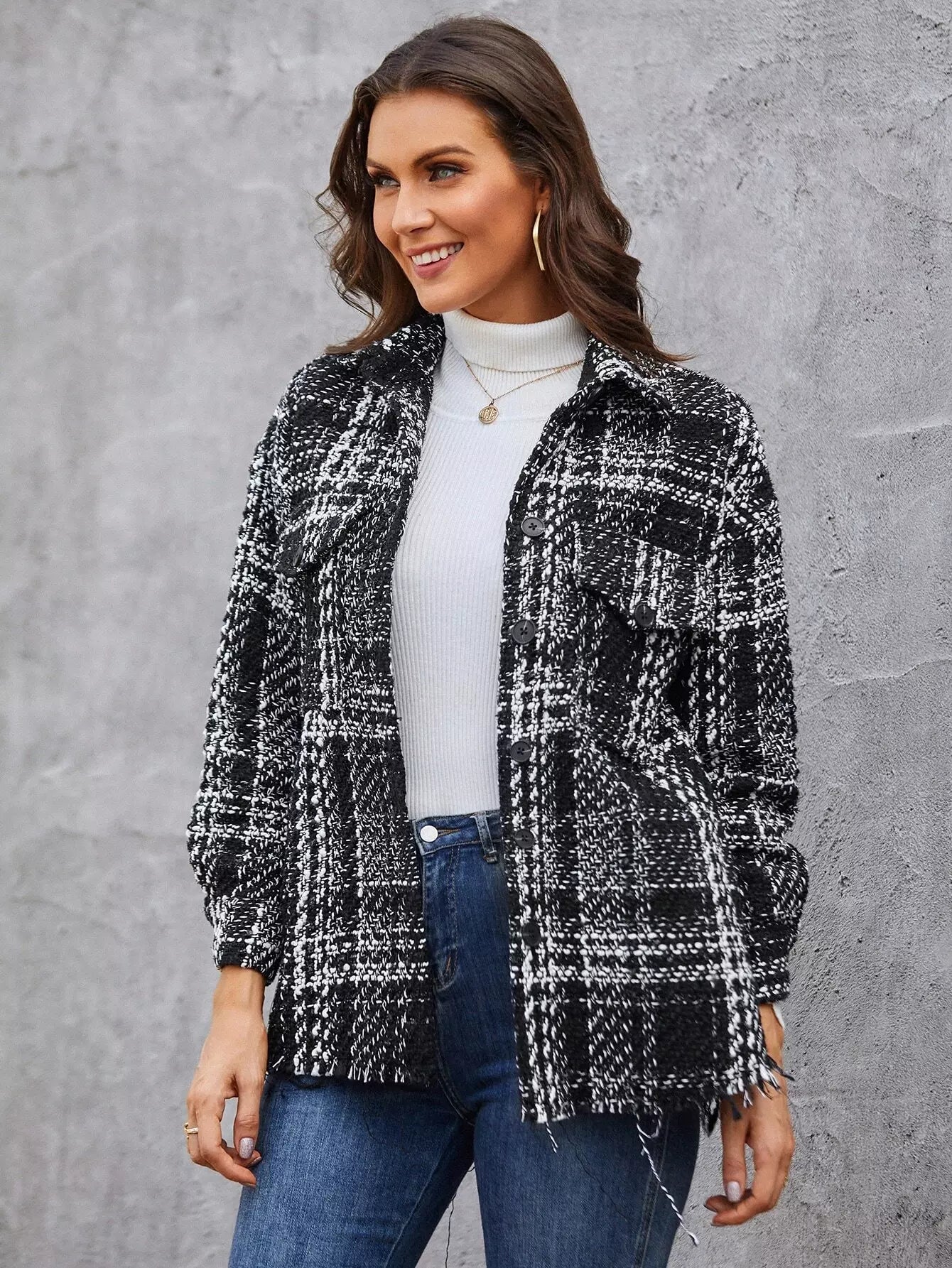 جاكيت تويد مطبوع بطبعة منقوشة بغطاء من الصوف المنقوش بغطاء جيب بغطاء جيب بأزرار