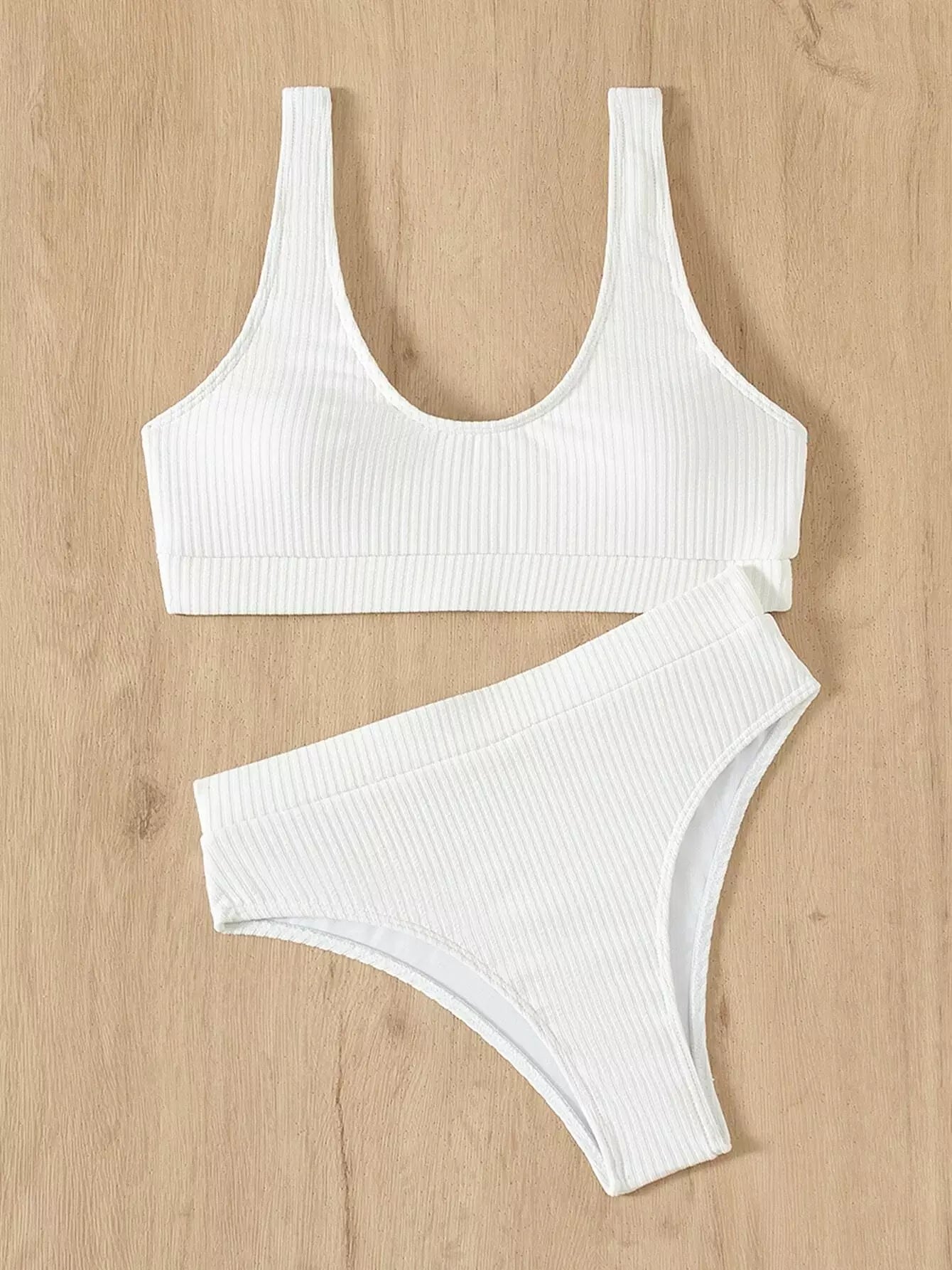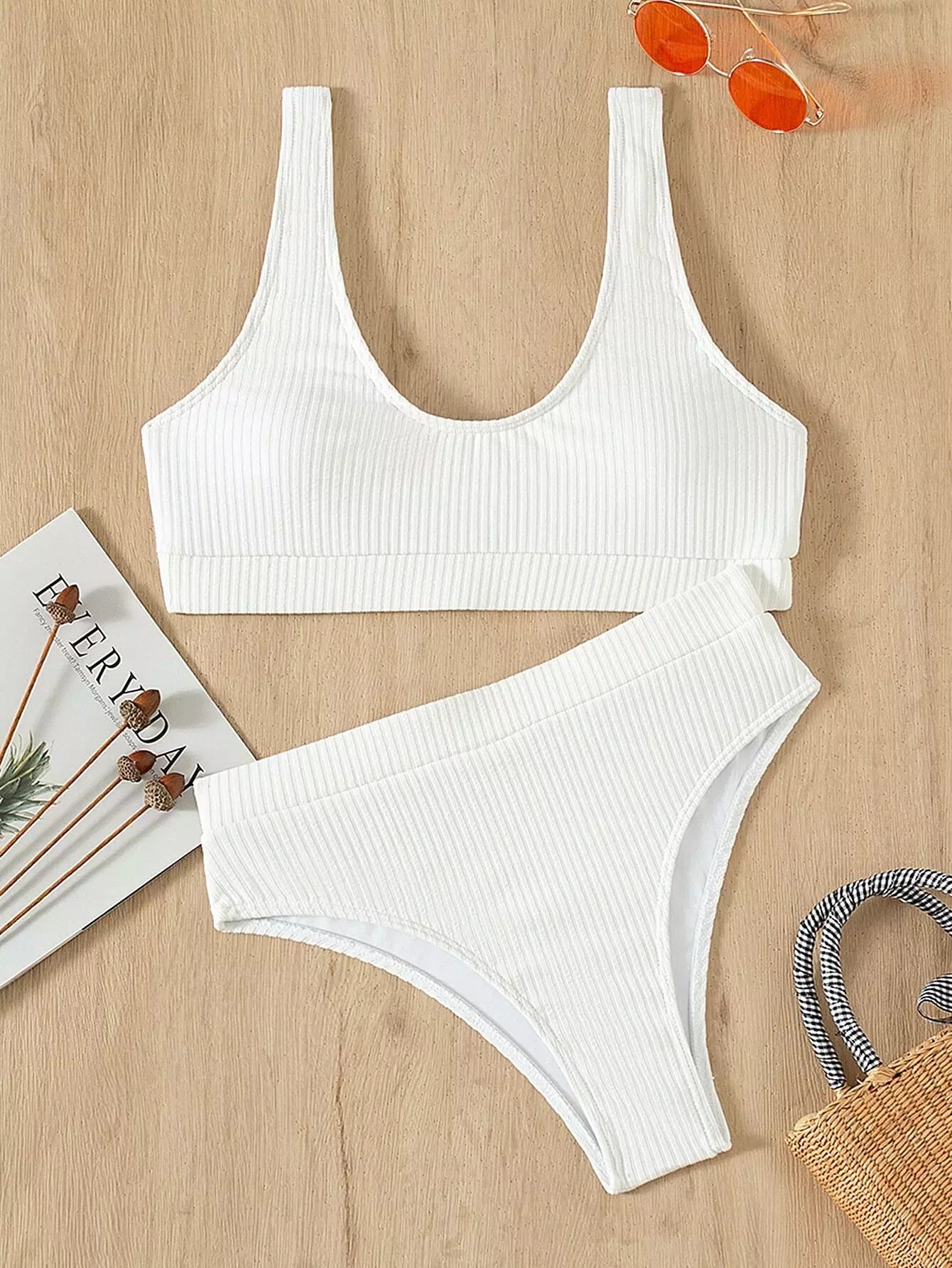 ملابس سباحة بيكيني برقبة دائرية سادة برقبة دائرية