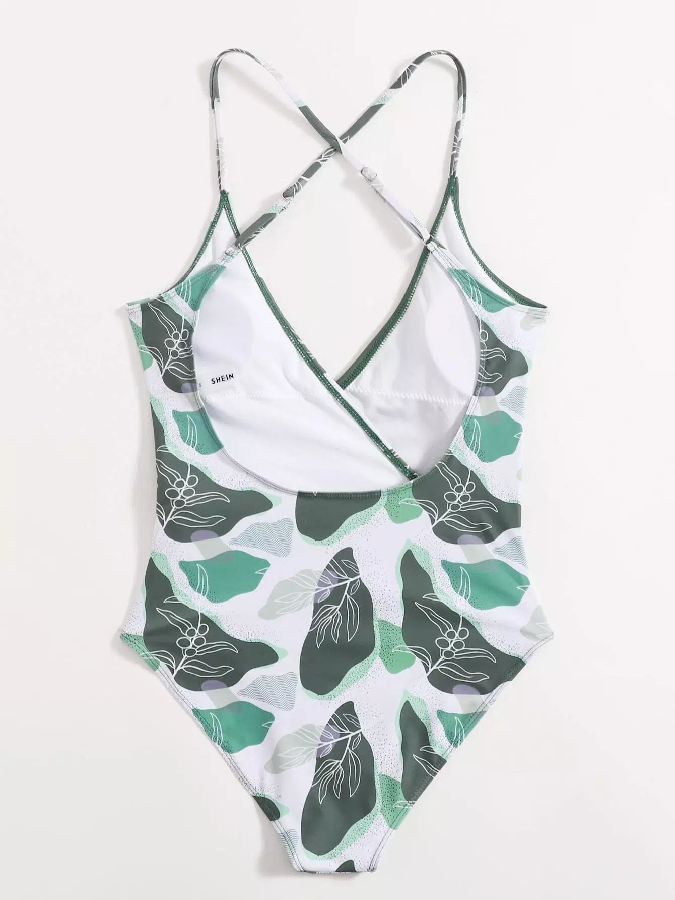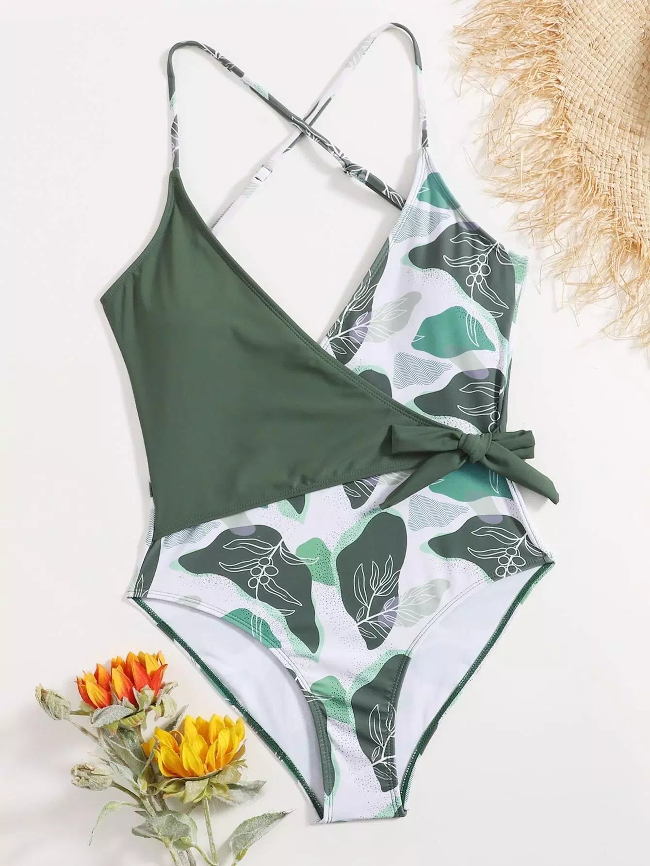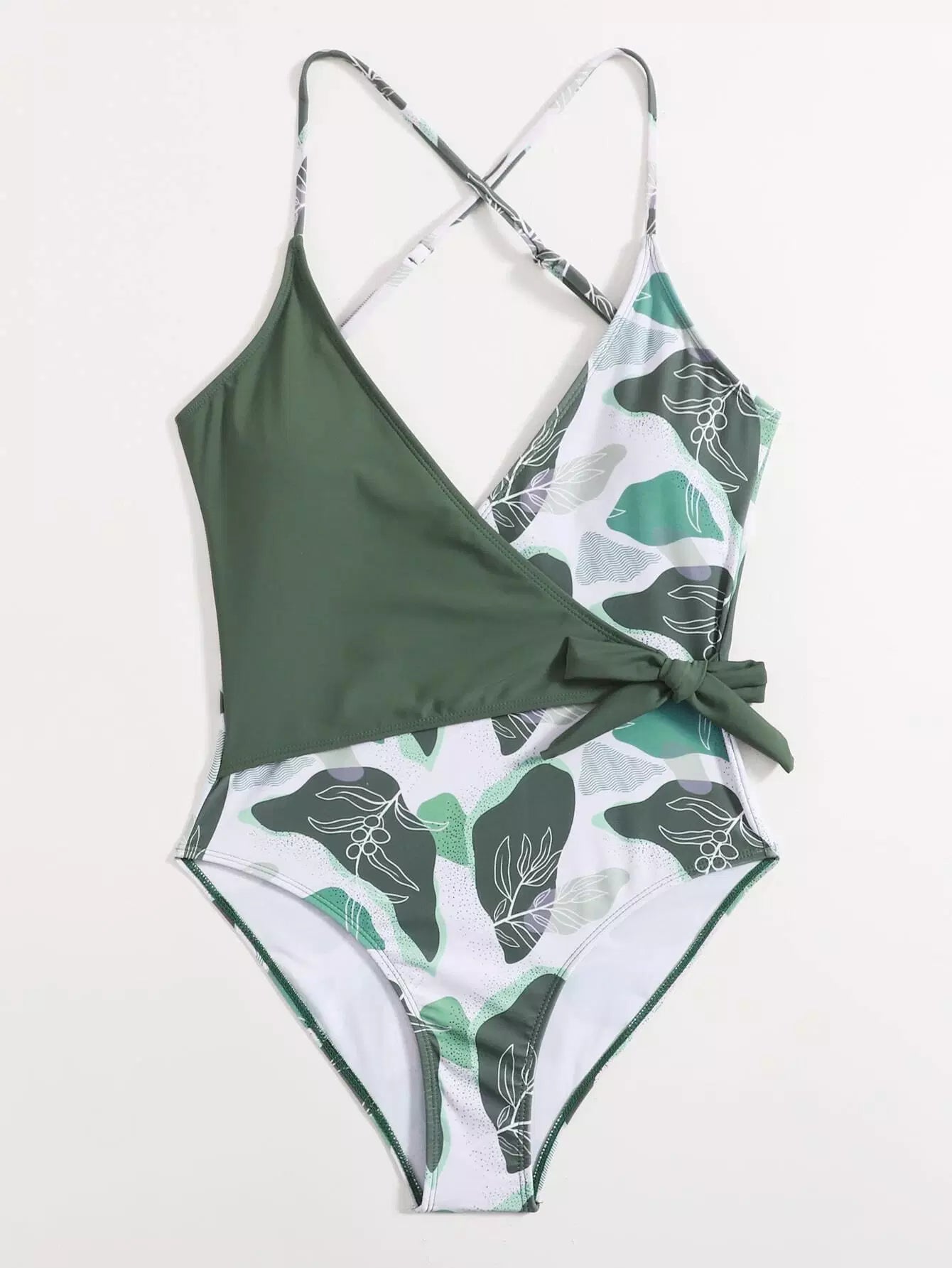 بذلة سباحة من قطعة واحدة بطبعة نباتات مطبوعة على الخصر بعقدة