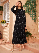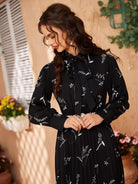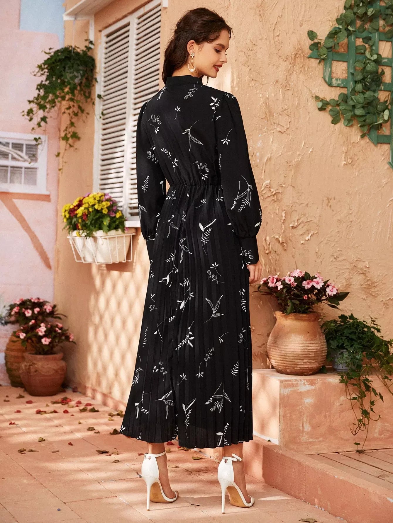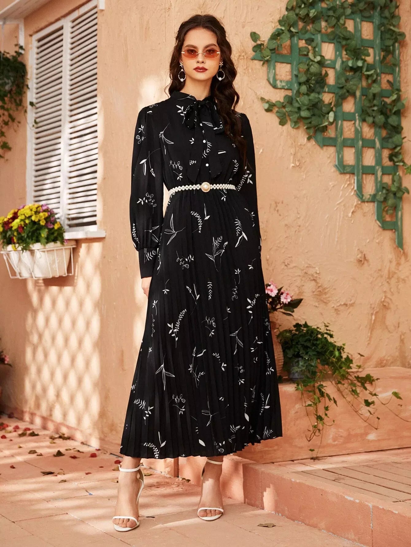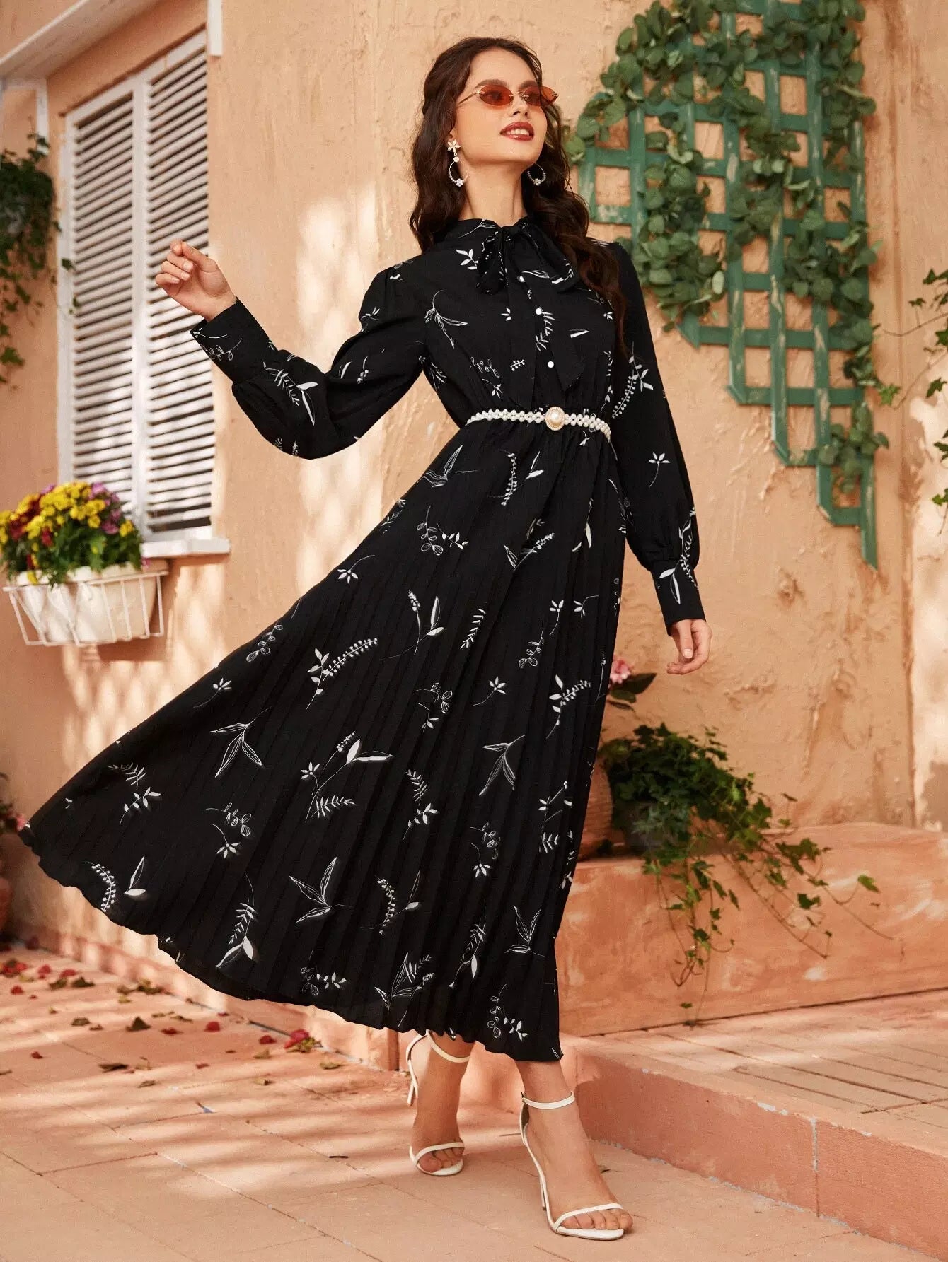 فستان بطبعة نباتات مطبوع بربطة عنق بربطة عنق مطوية الحاشية