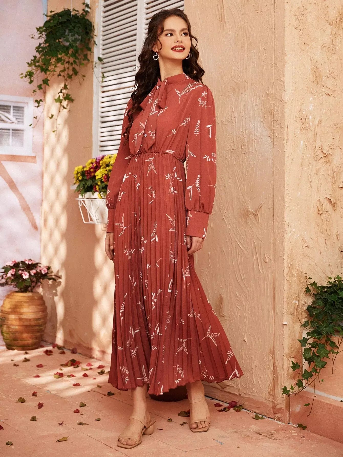 فستان بطبعة نباتات مطبوع بربطة عنق بربطة عنق مطوية الحاشية