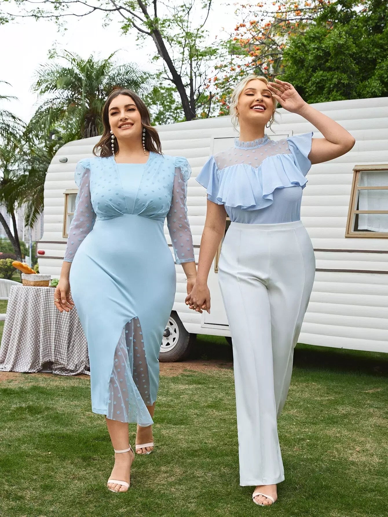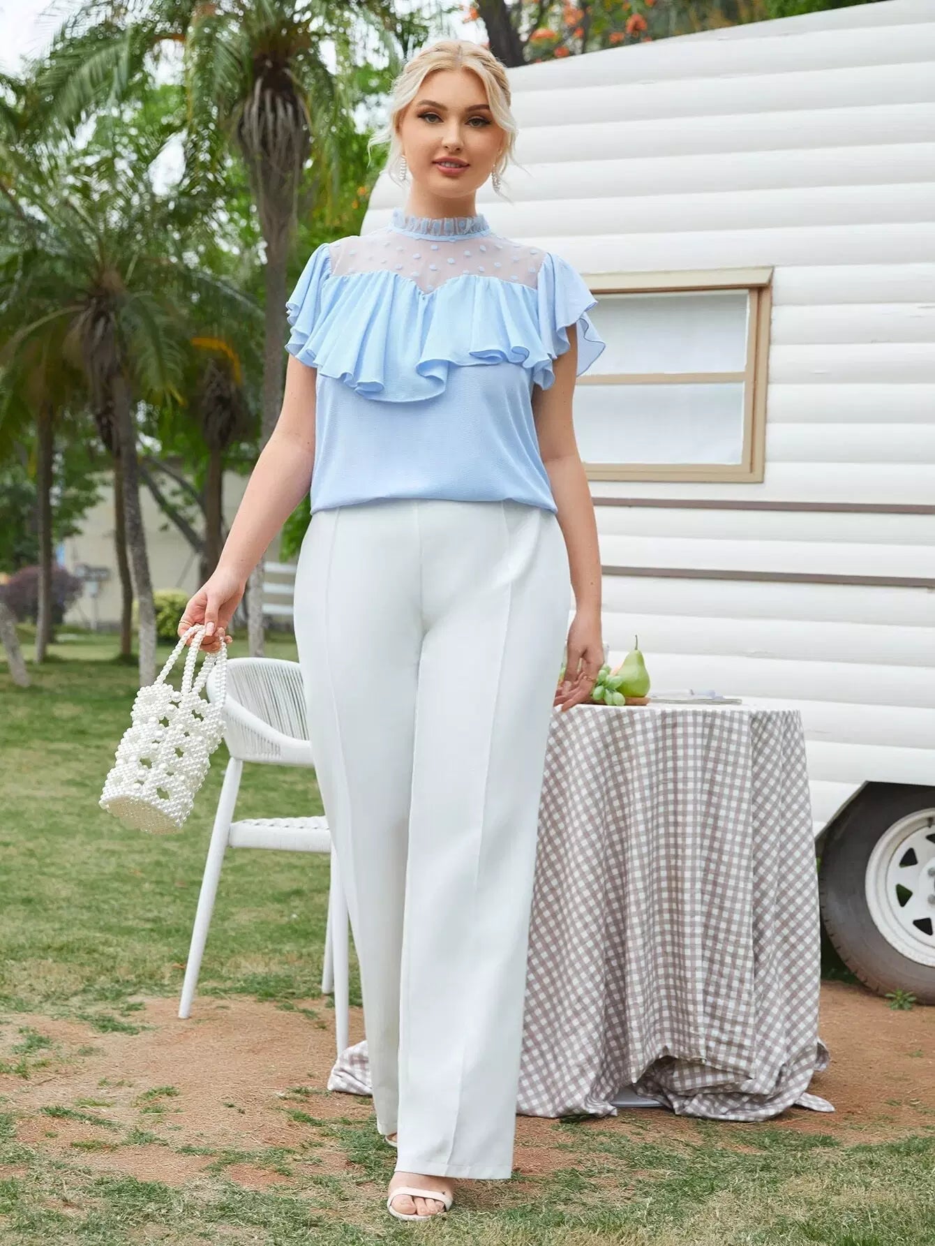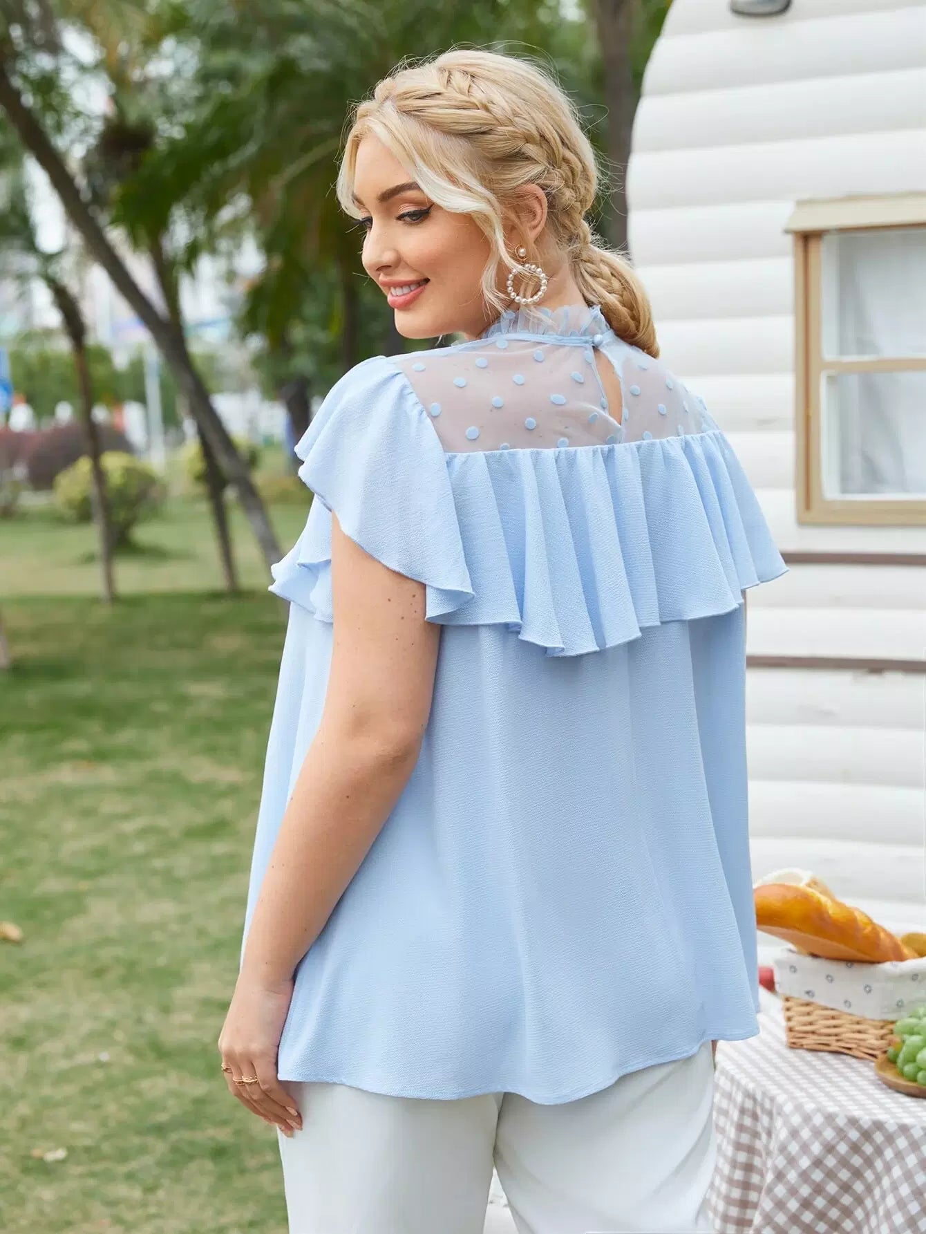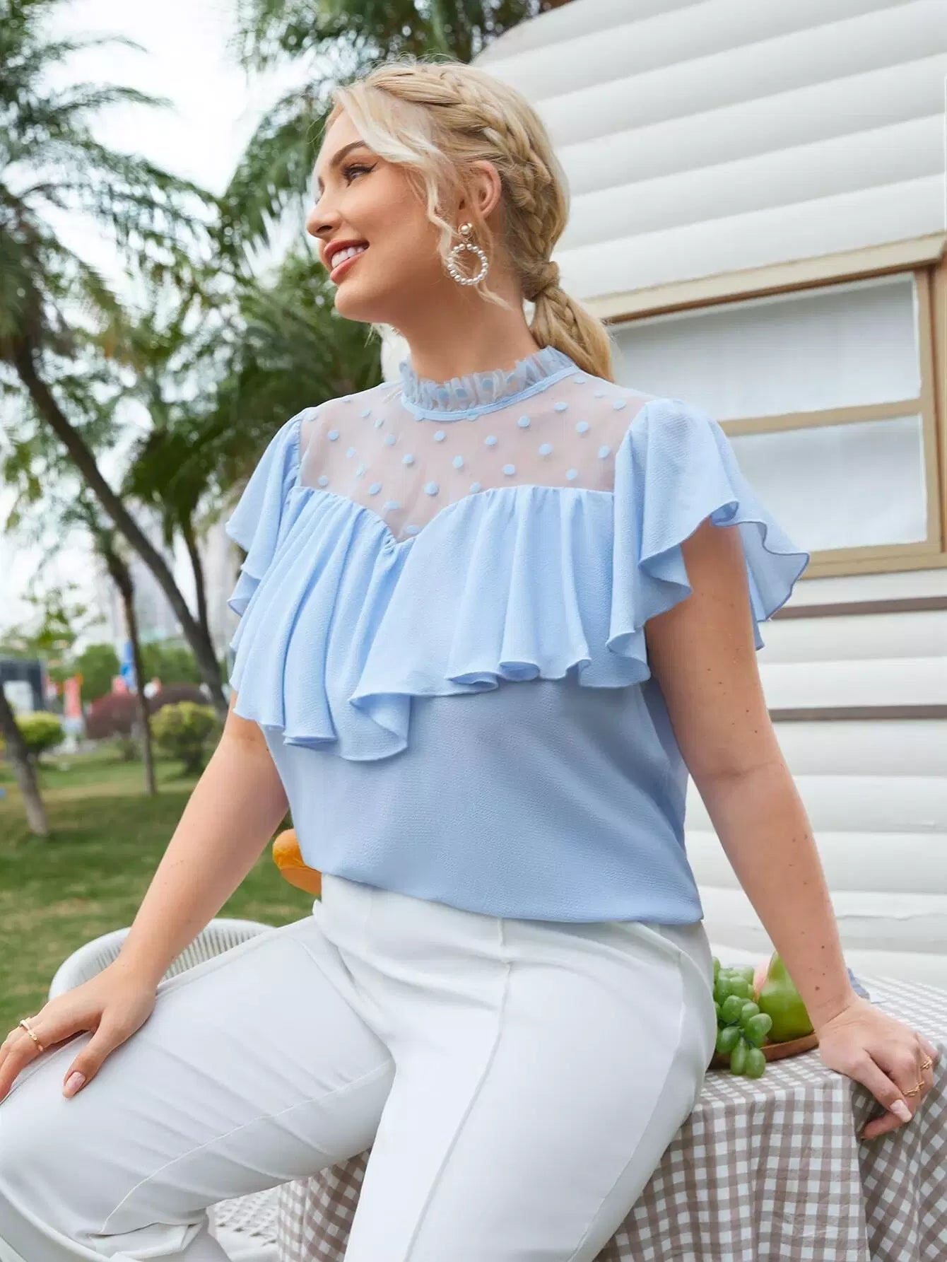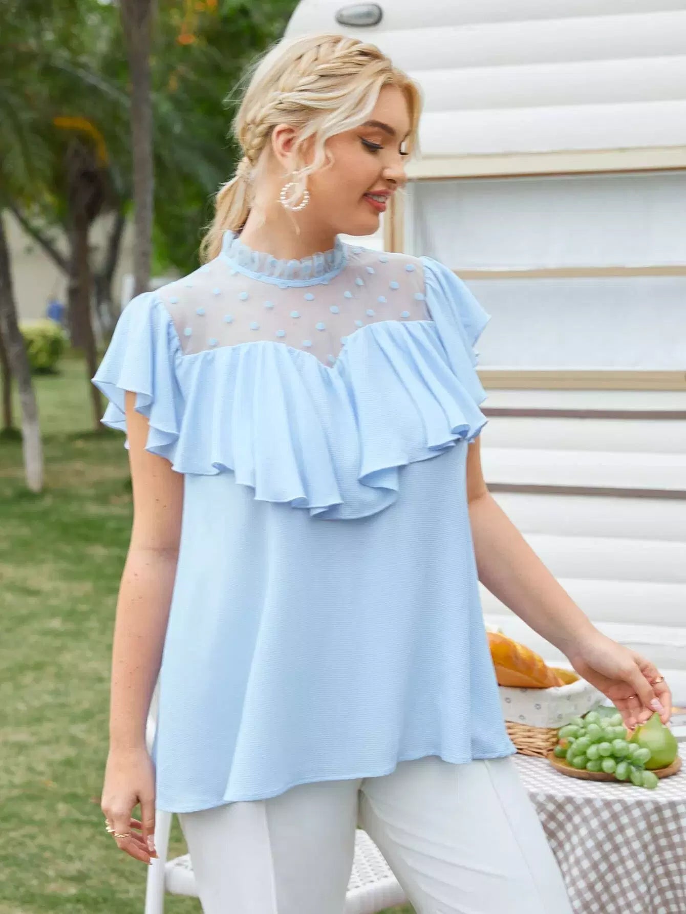 بلوزة مزينة بكشكش برقبة دوبي شبكي مزين بكشكش بقطعة واحدة زائد 1 قطعة