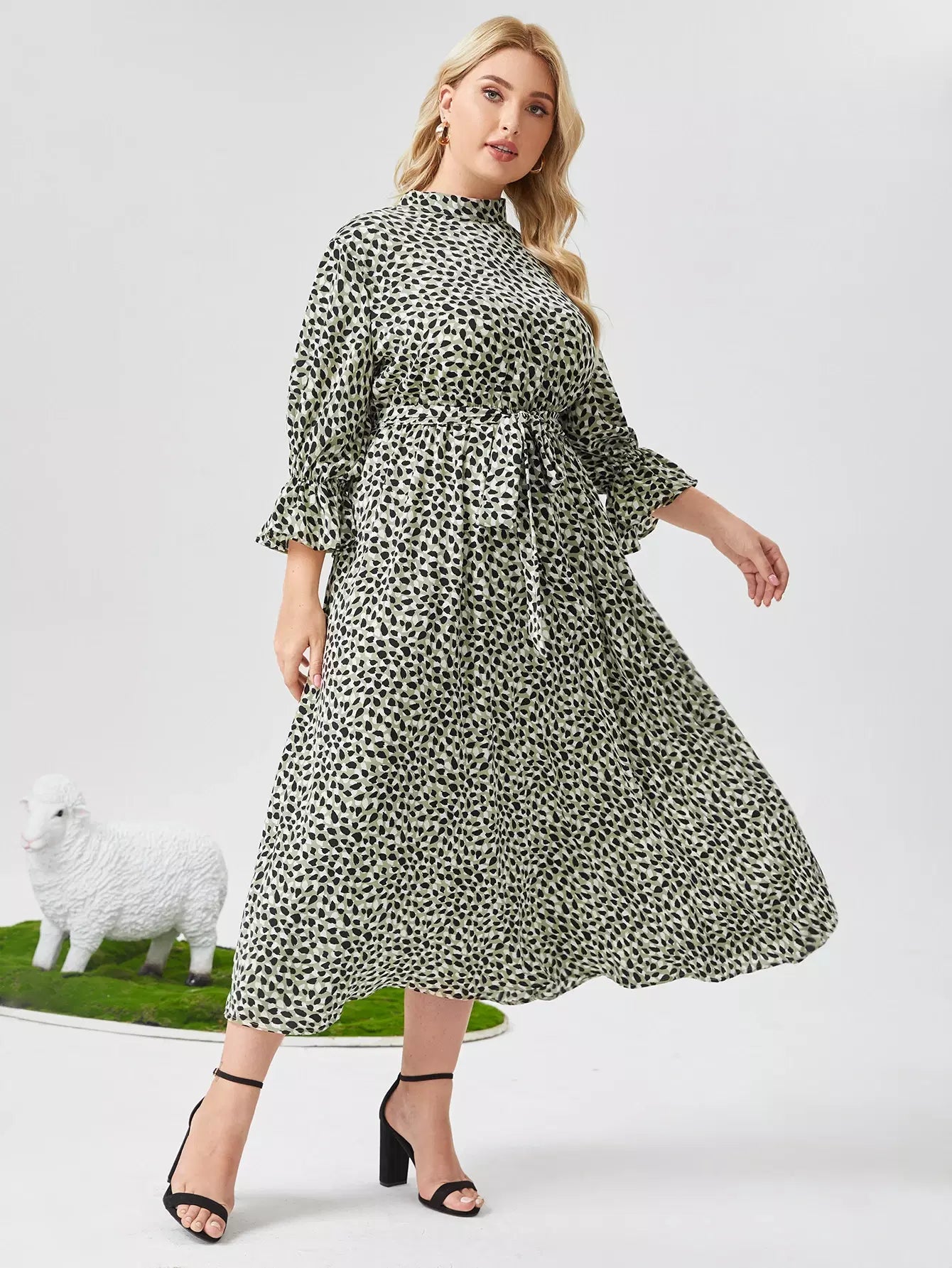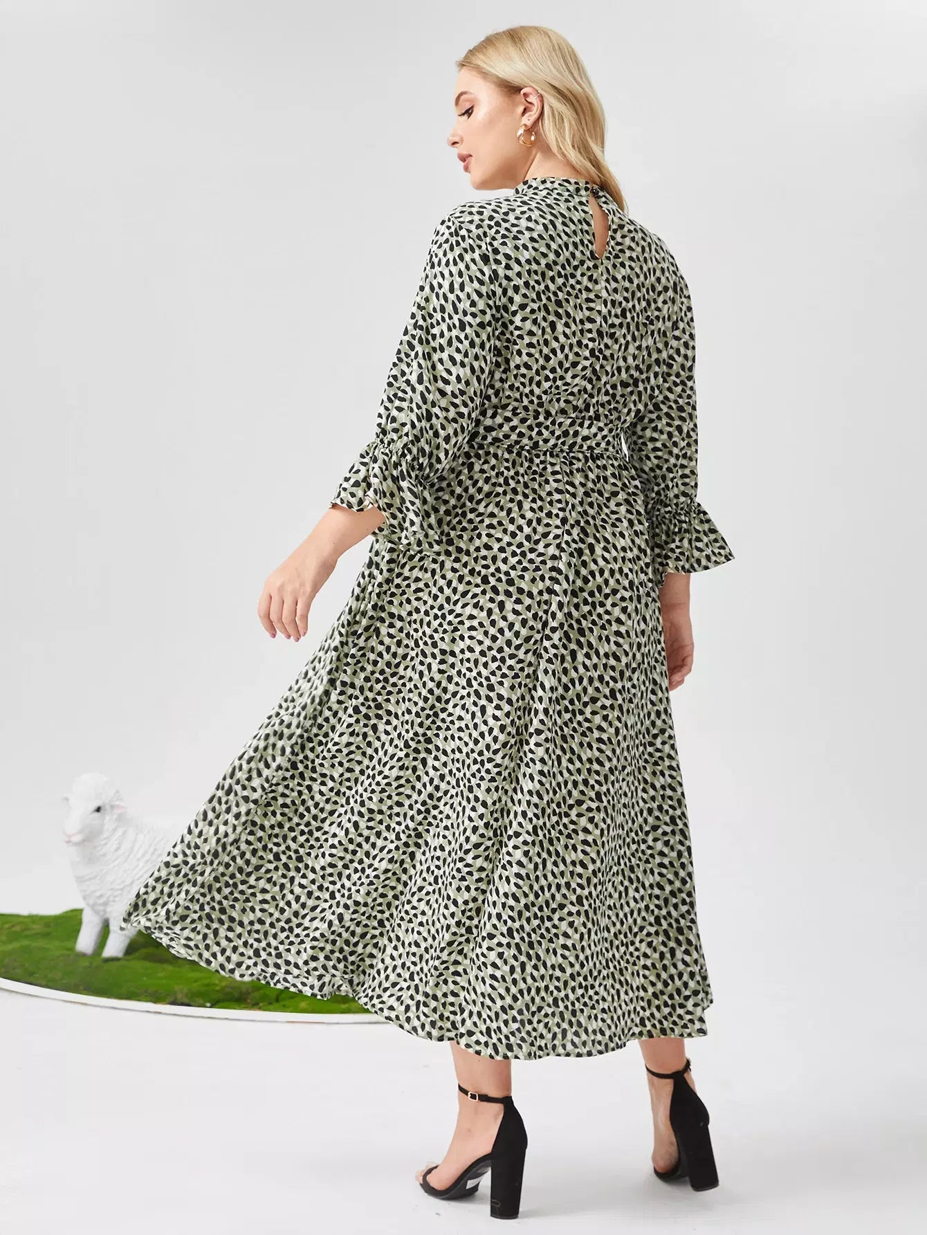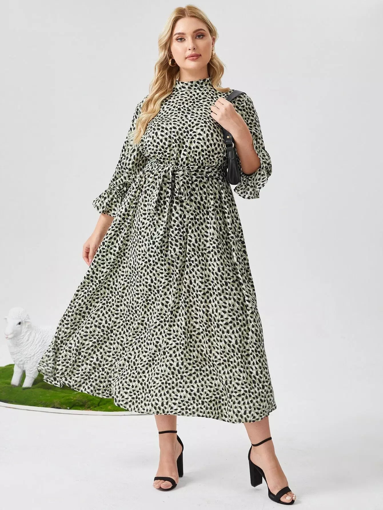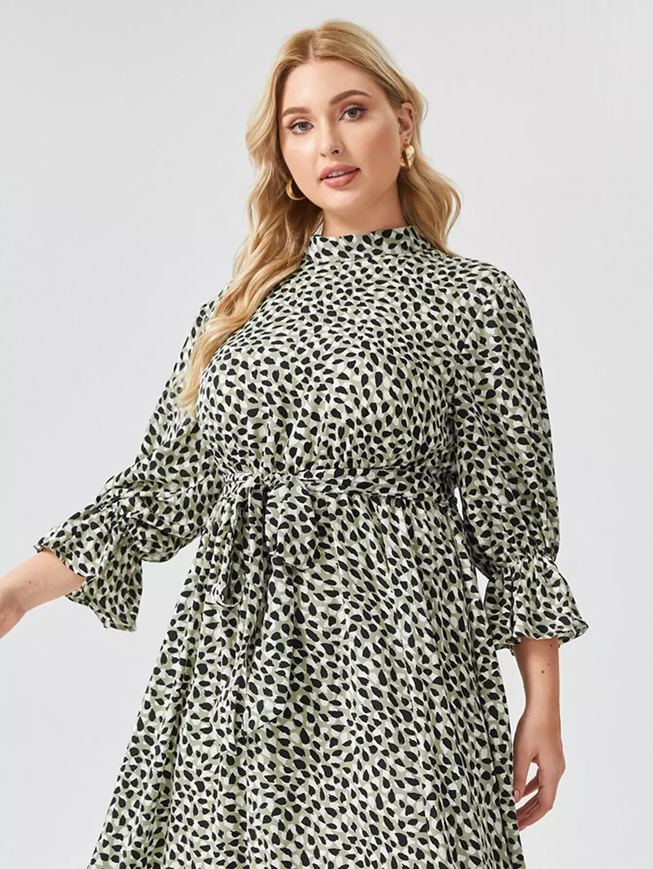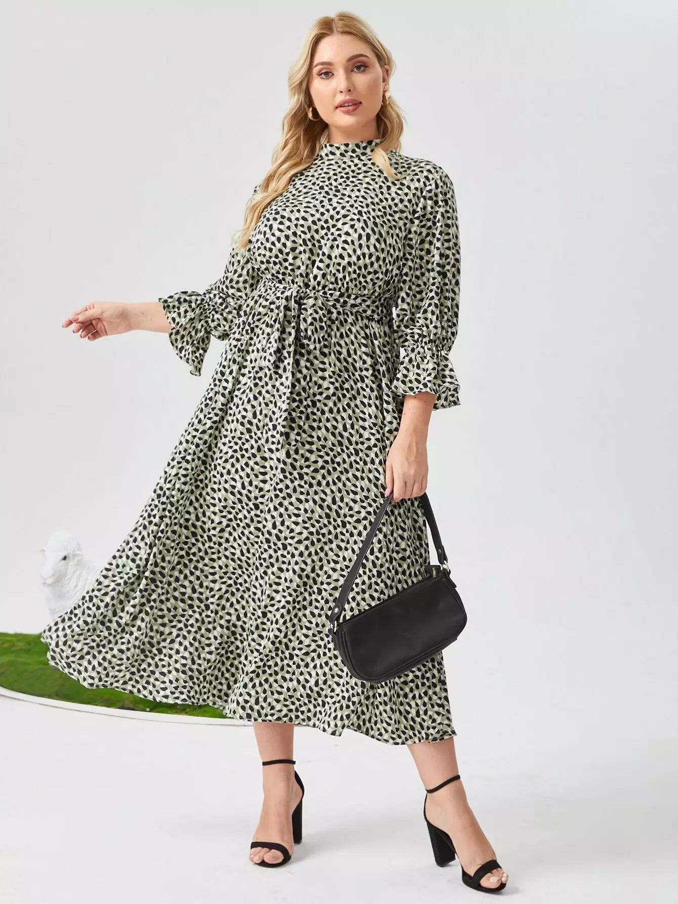 بالإضافة إلى فستان مطبوع بالكامل برقبة وهمية وأكمام واسعة بدون حزام