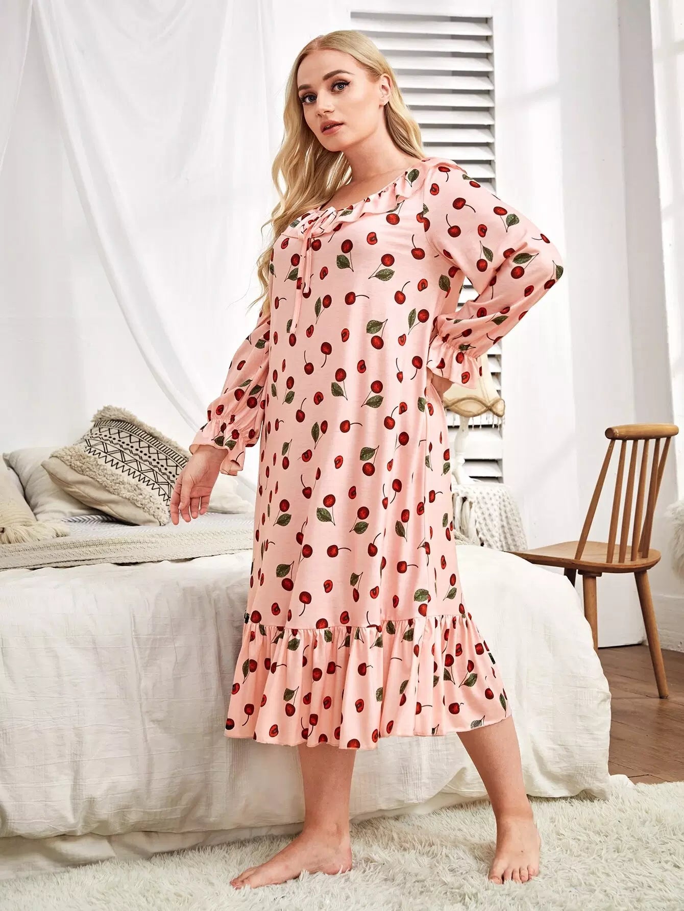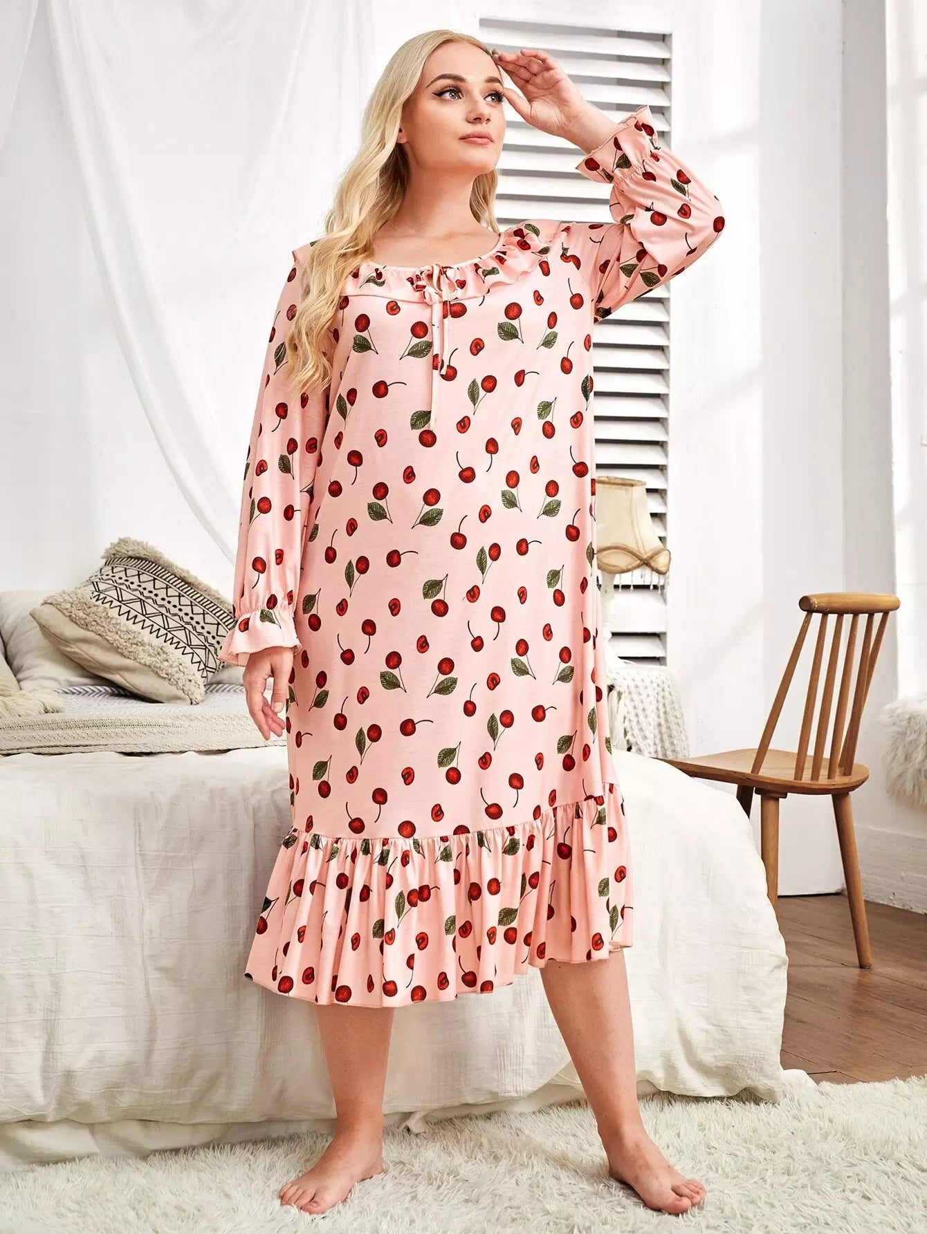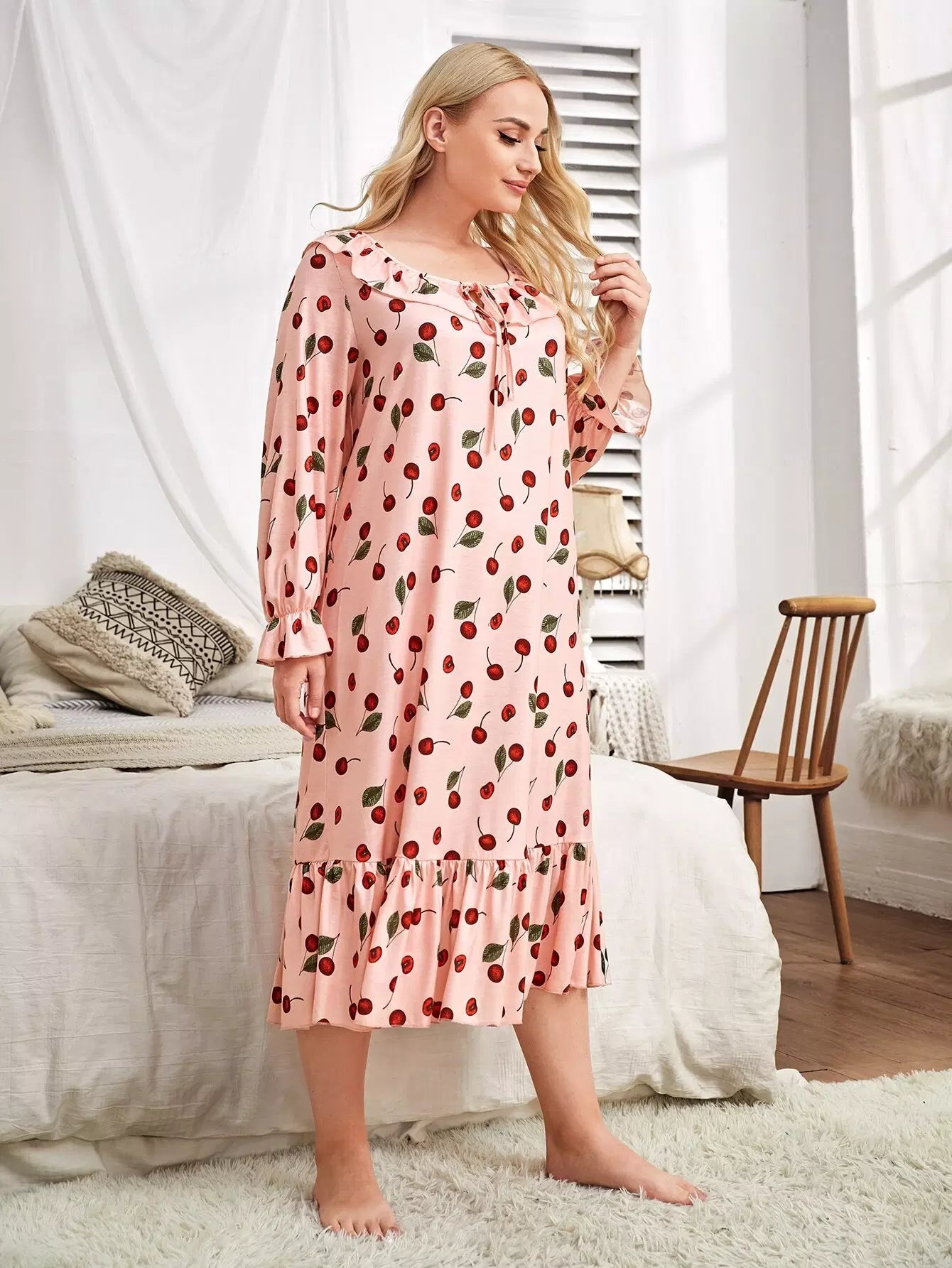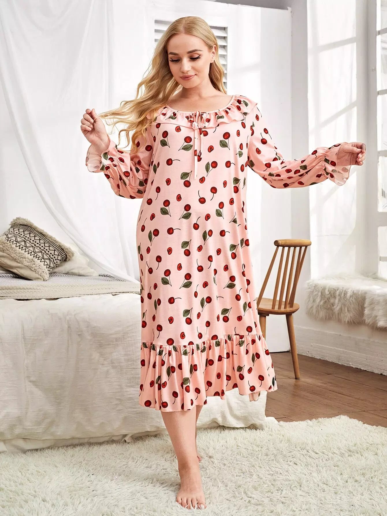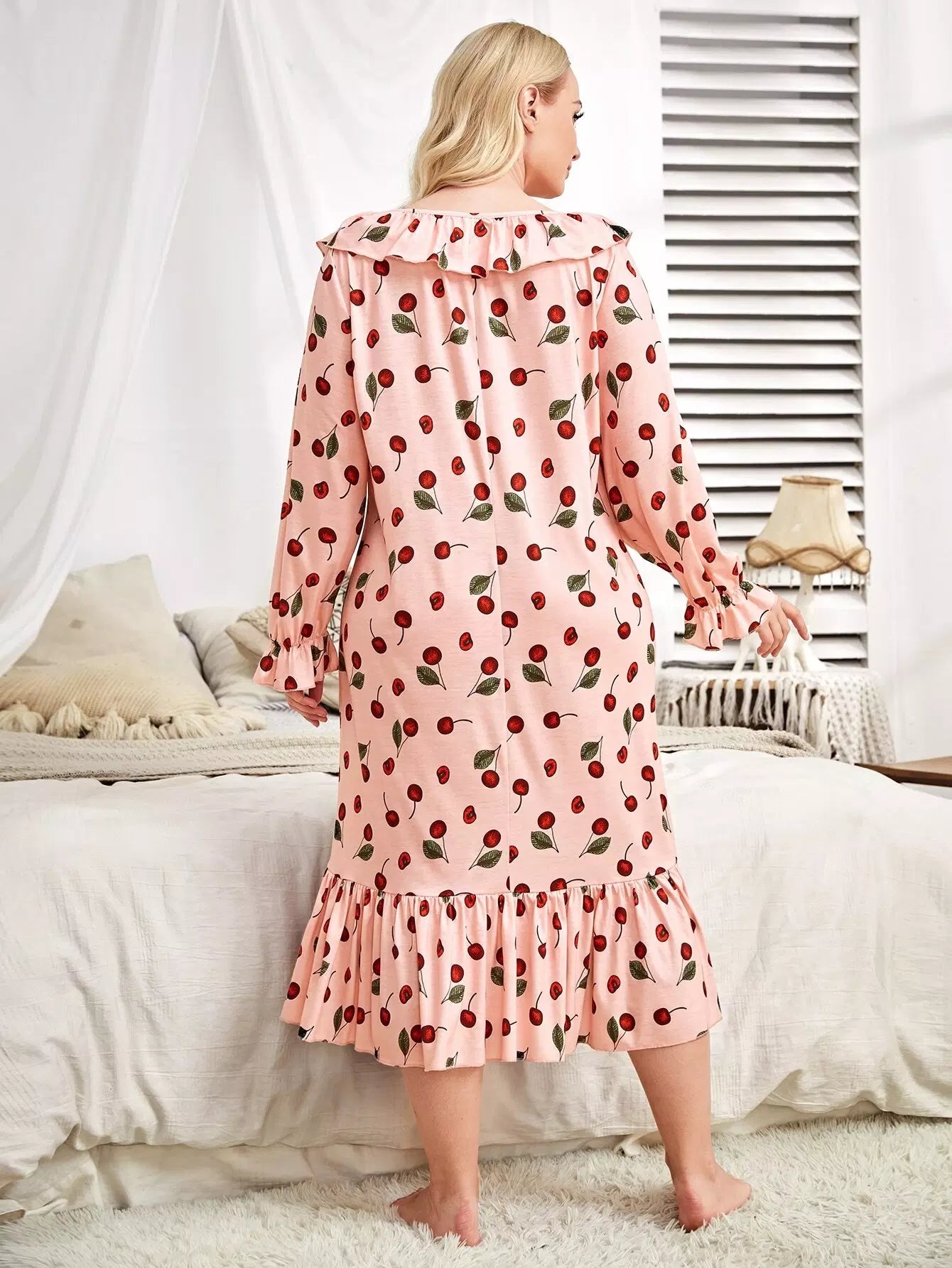 فستان سهرة مزين بطبعة كرز مكشكش بالكامل