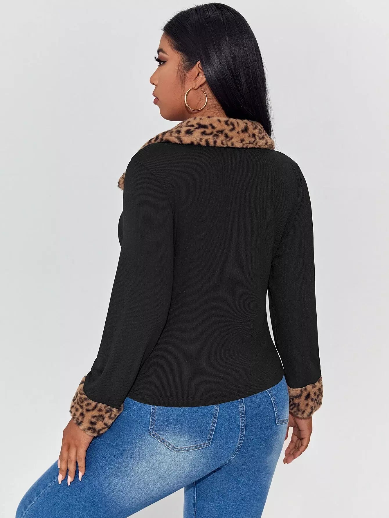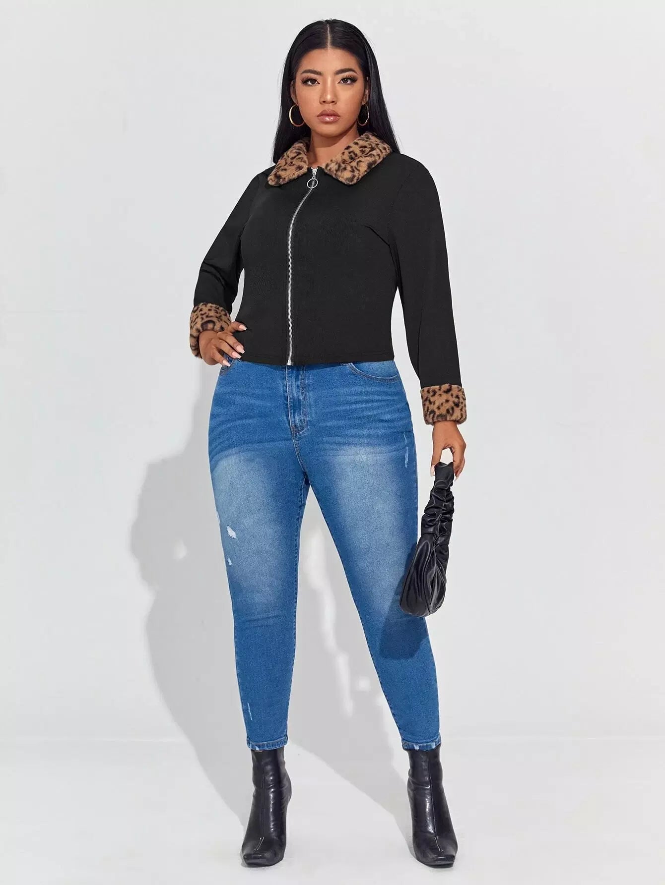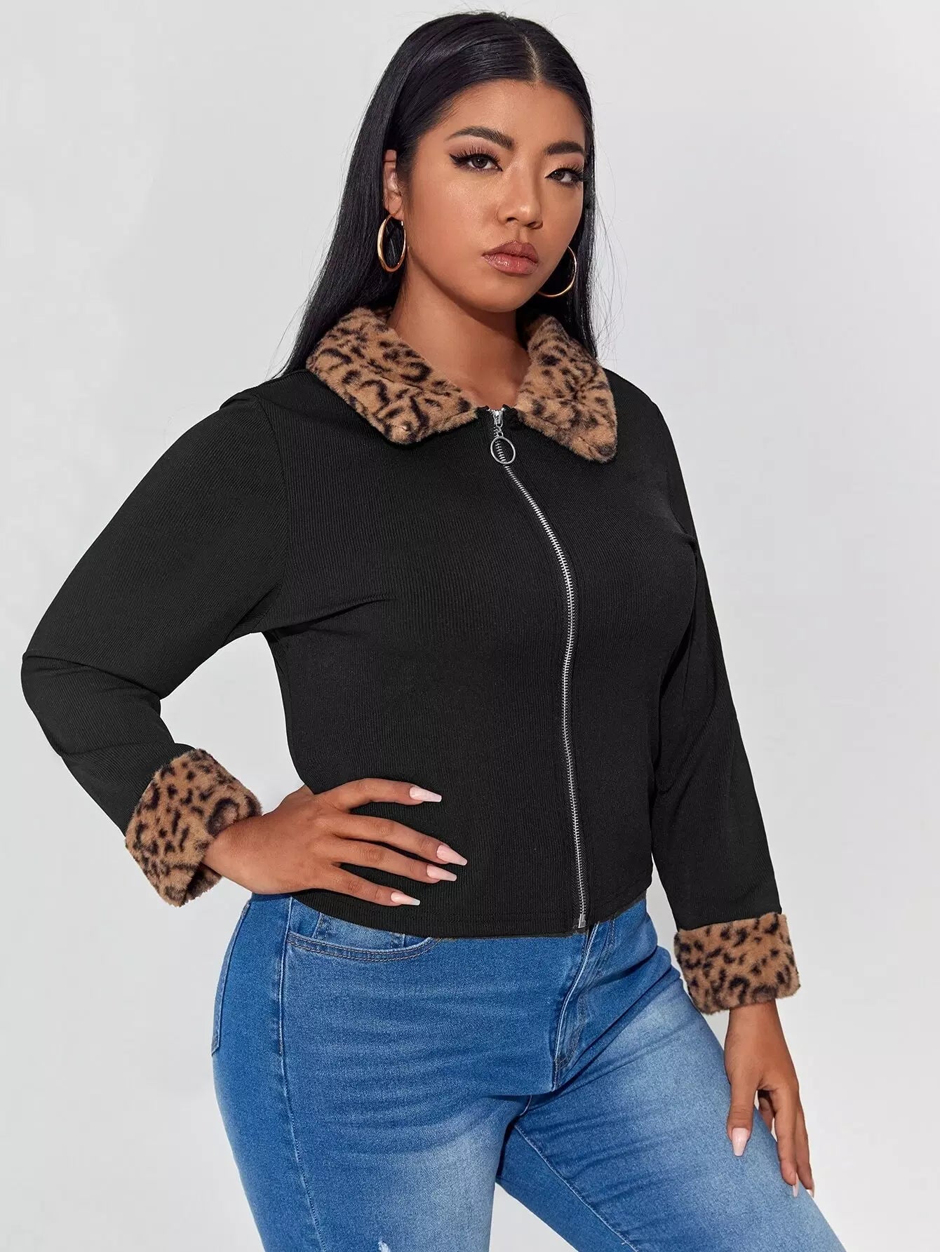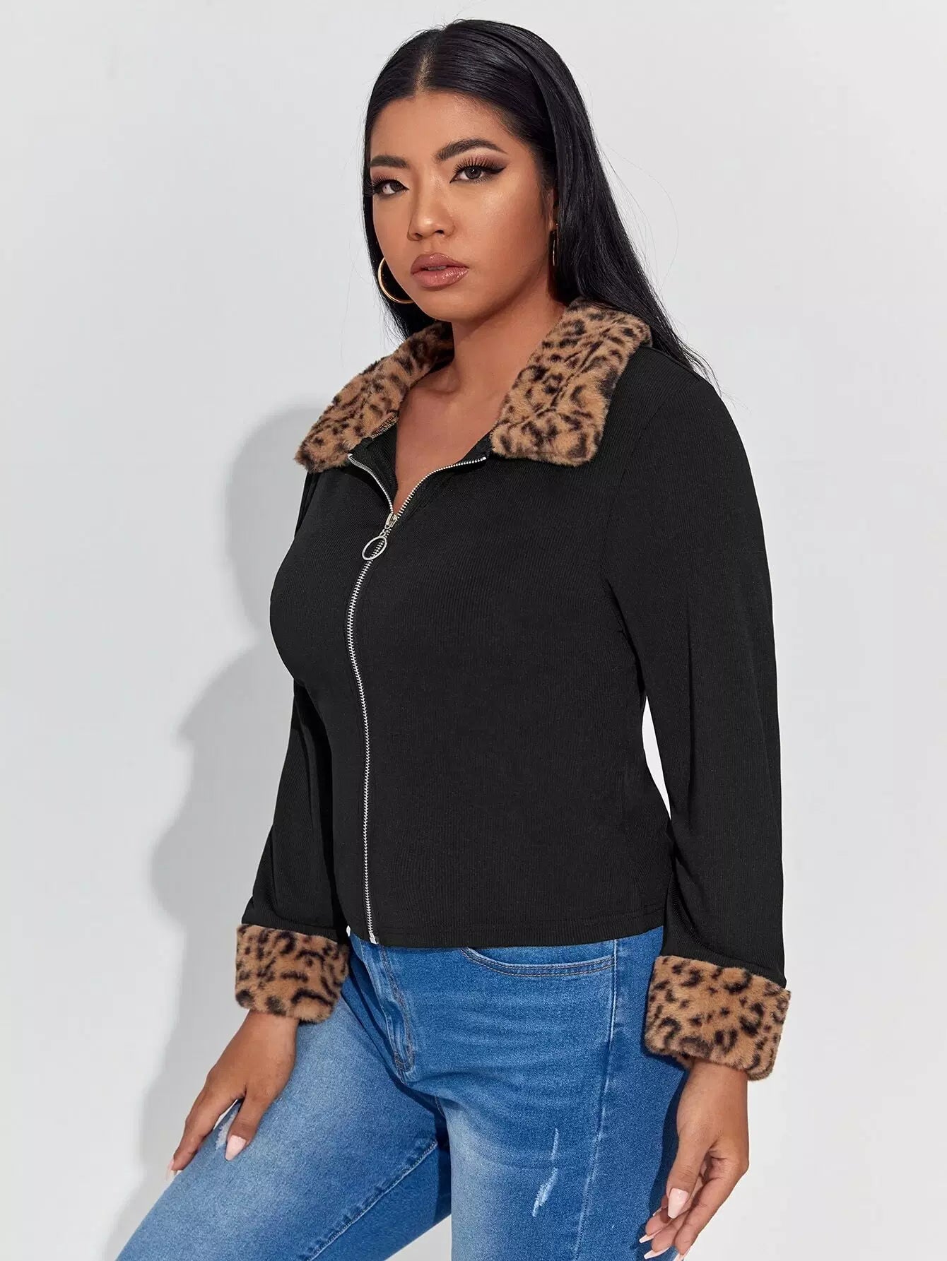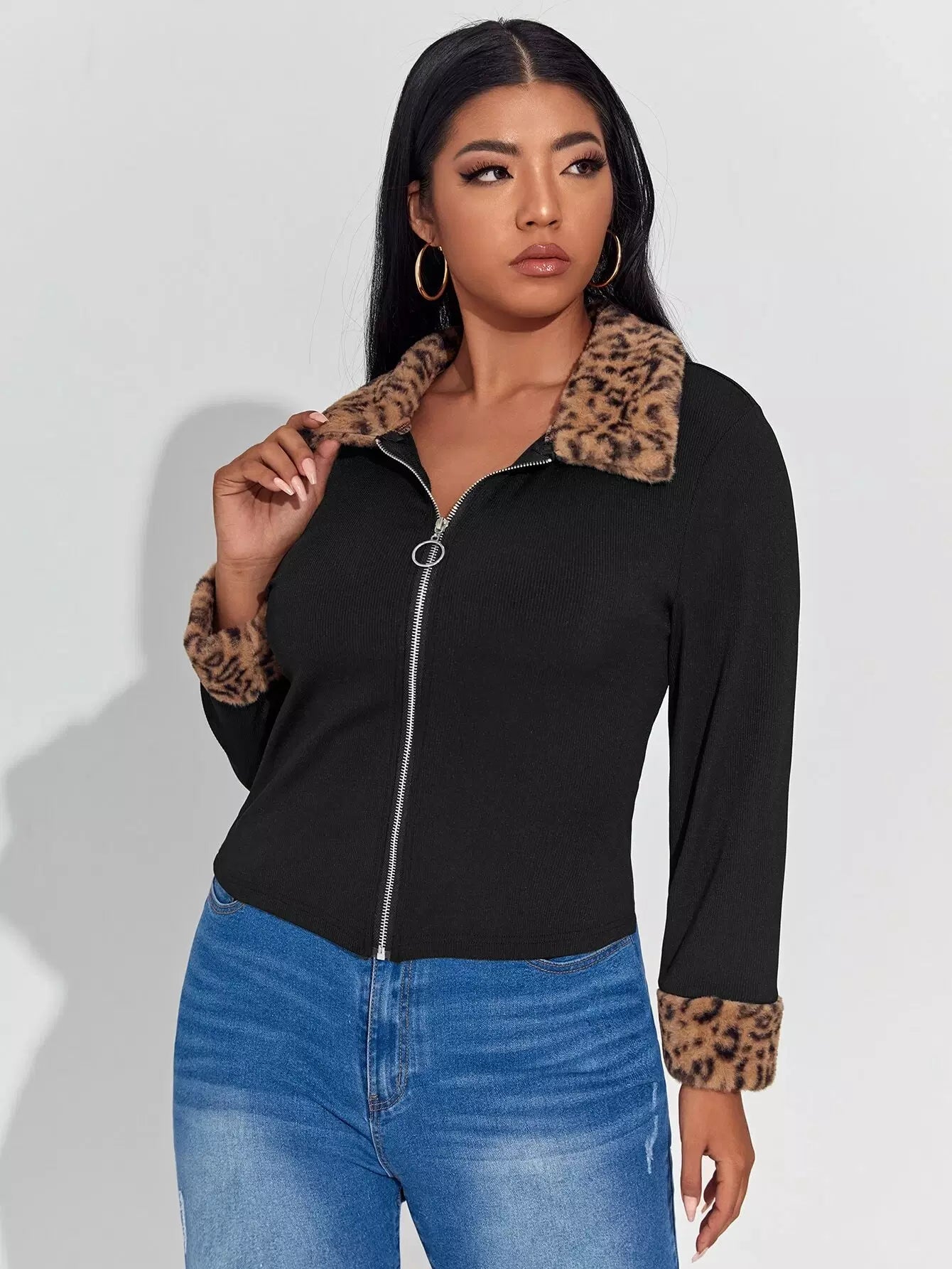 نحيف - مقاس كبير سترة بسحاب على شكل جلد الفهد متباينة