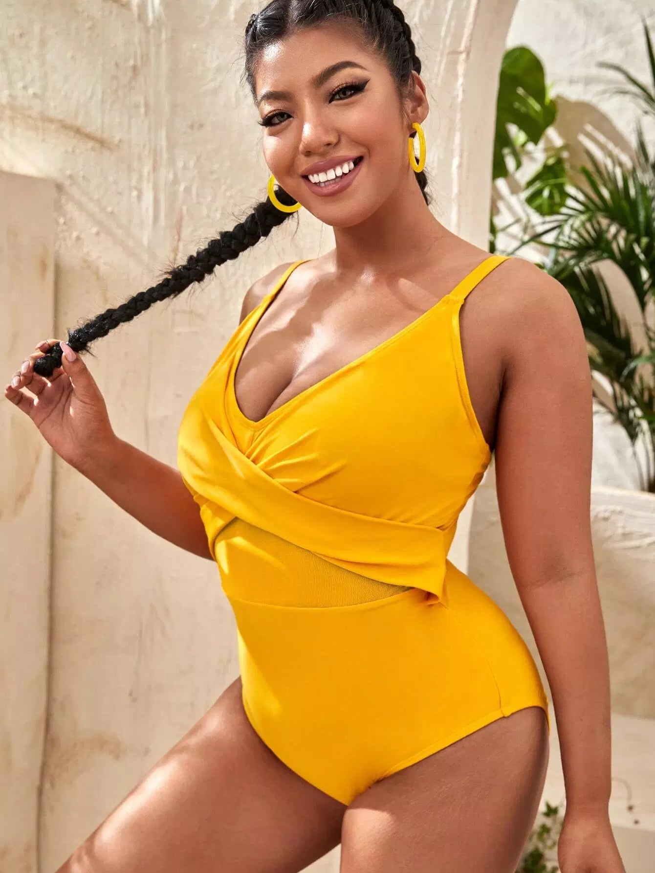 بدلة سباحة بقطعة واحدة شبكية بلون مغاير زائد