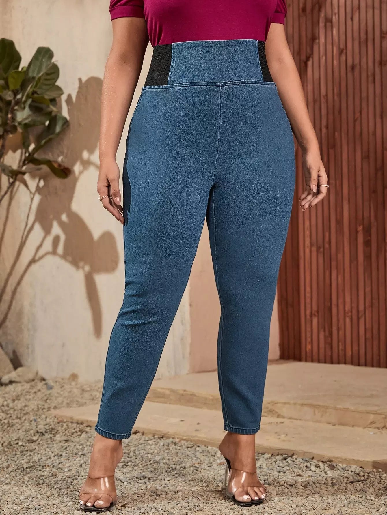بنطلون جينز جينز سكيني ضيق بحزام خصر عريض بلون مغاير