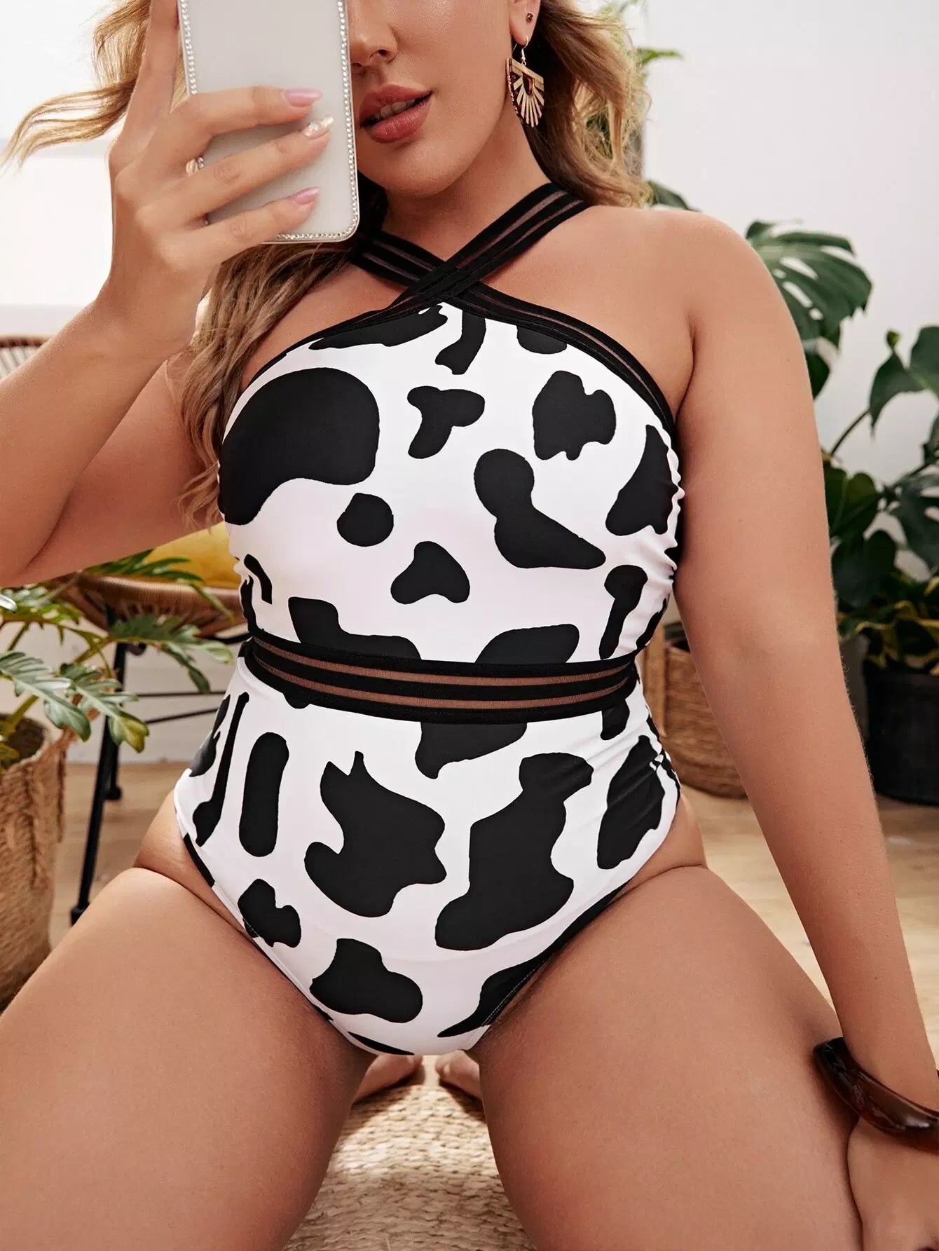 بدلة سباحة من قطعة واحدة شبكية بطبعة بقرة بلس بلس بلس قطعة واحدة شبكية بلون مغاير