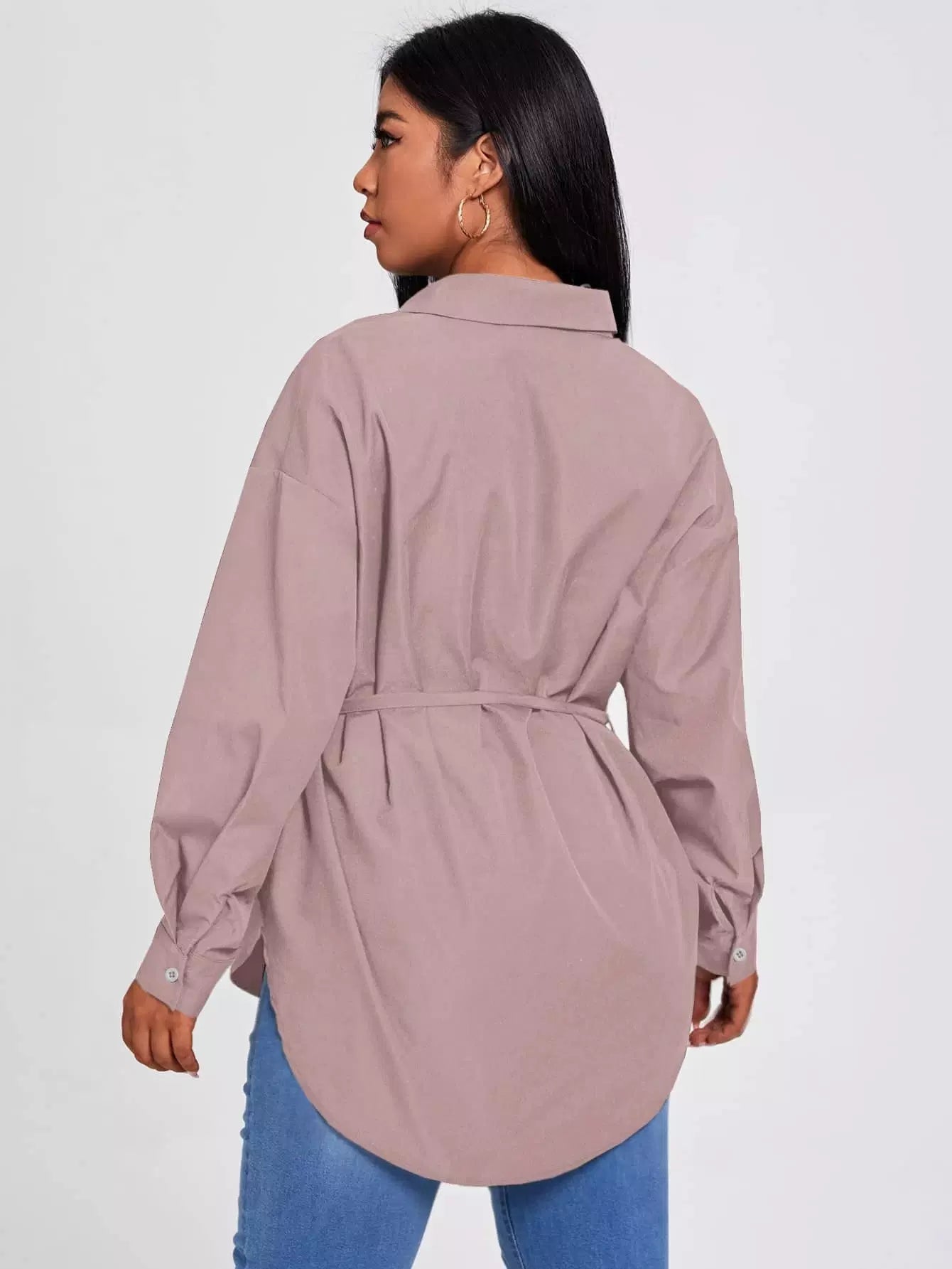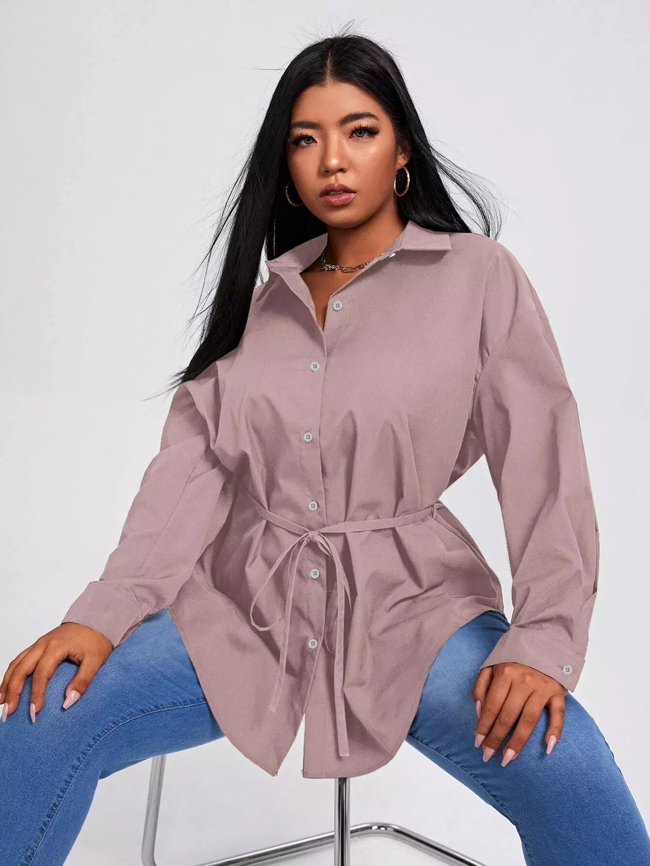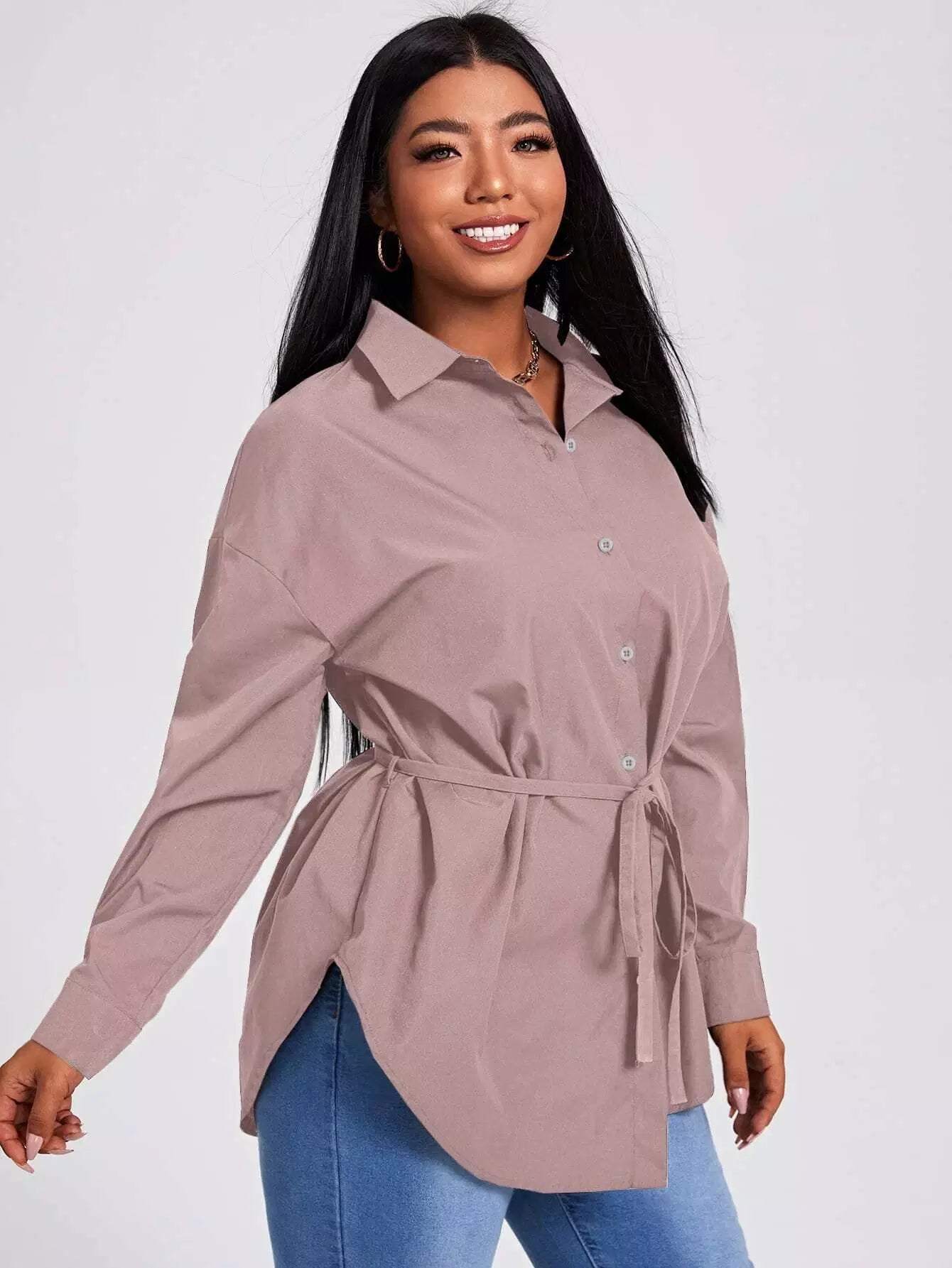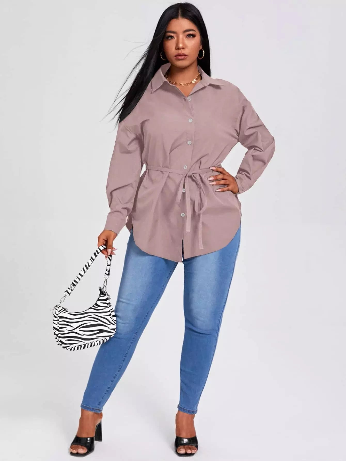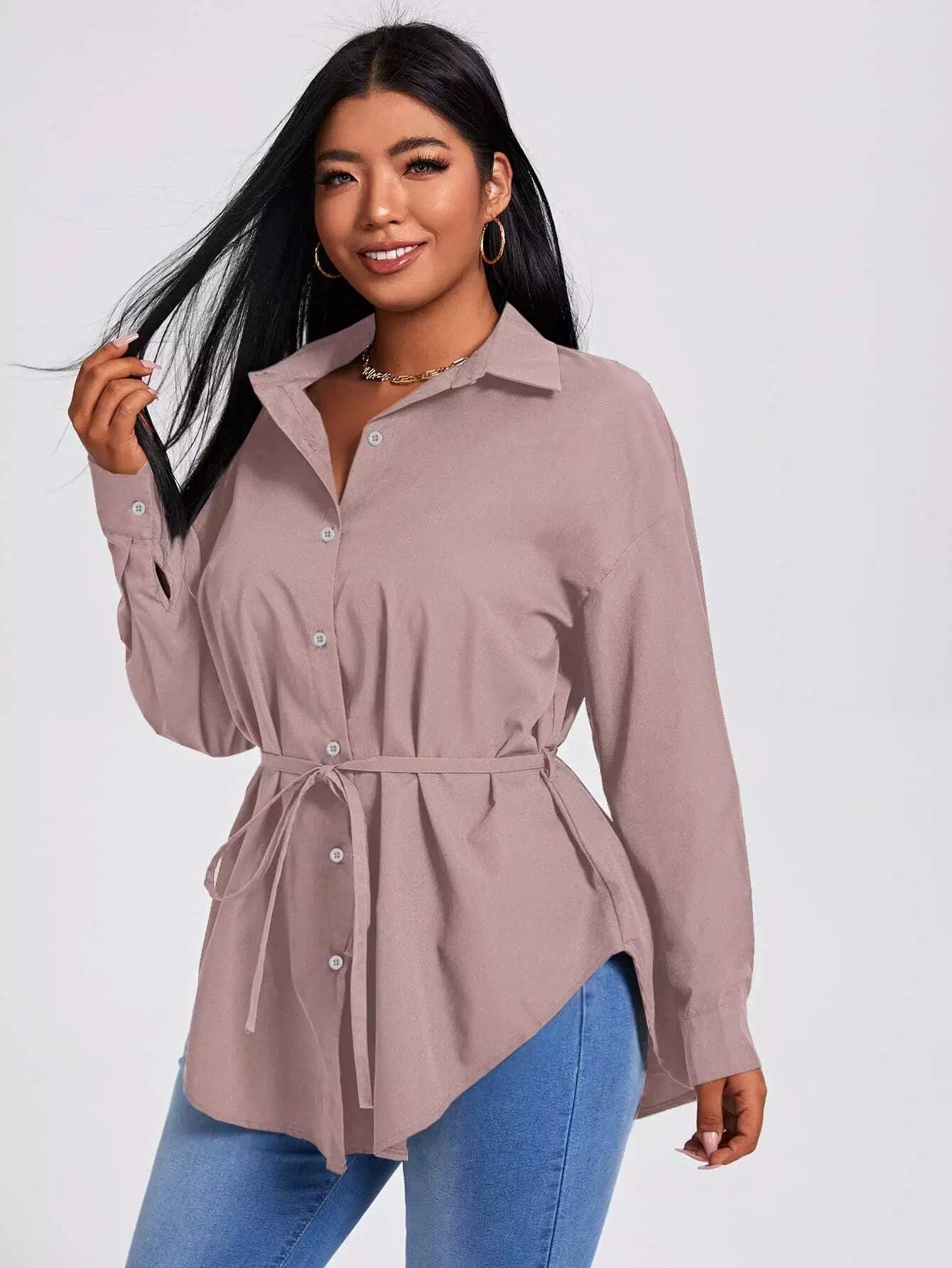 بالإضافة إلى قميص بحاشية منحنية بدون حزام