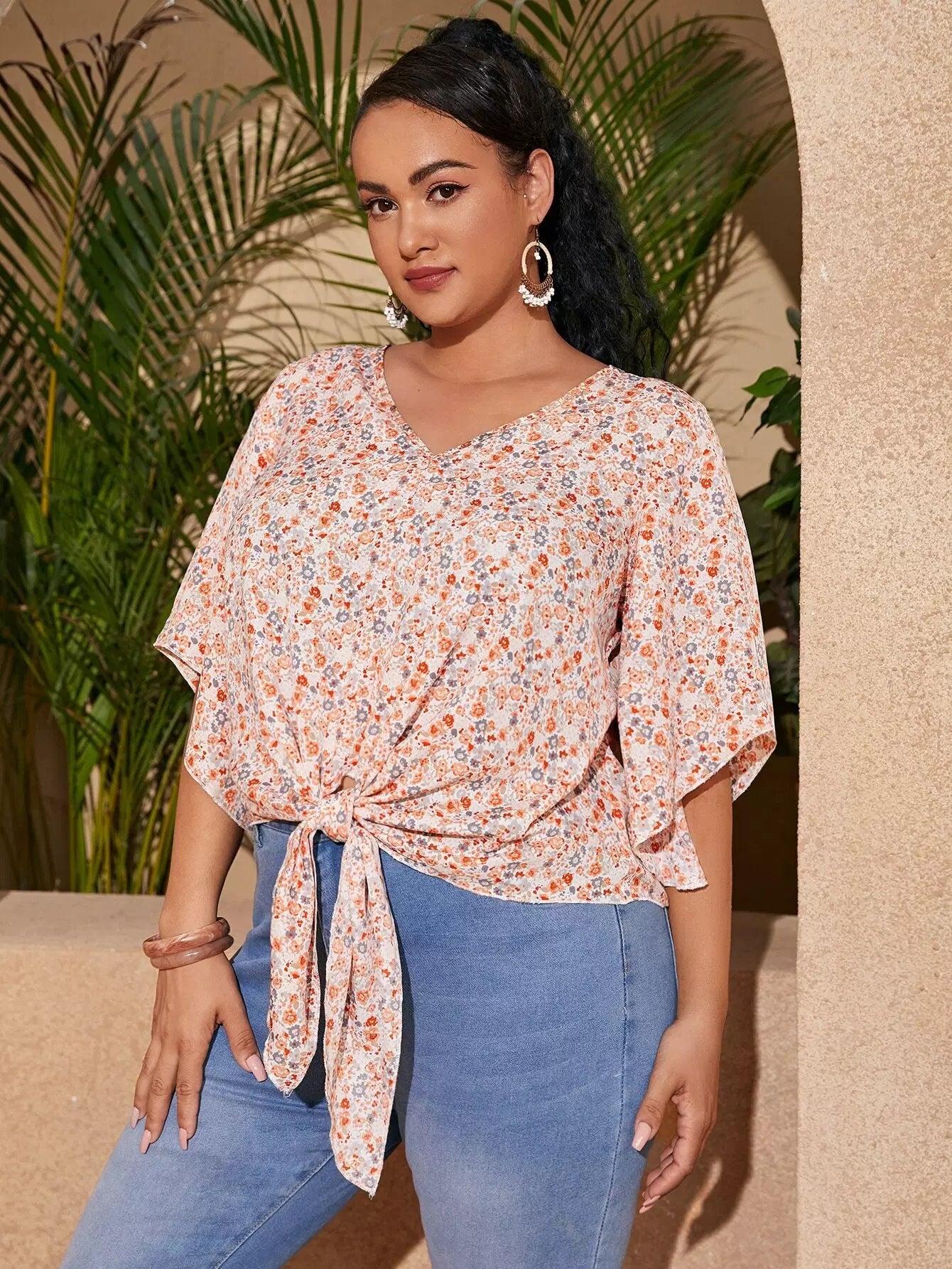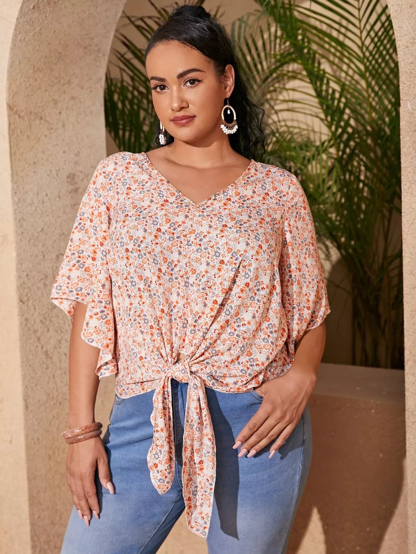 بلوزة بياقة على شكل V بياقة على شكل عقدة زهرية على شكل V