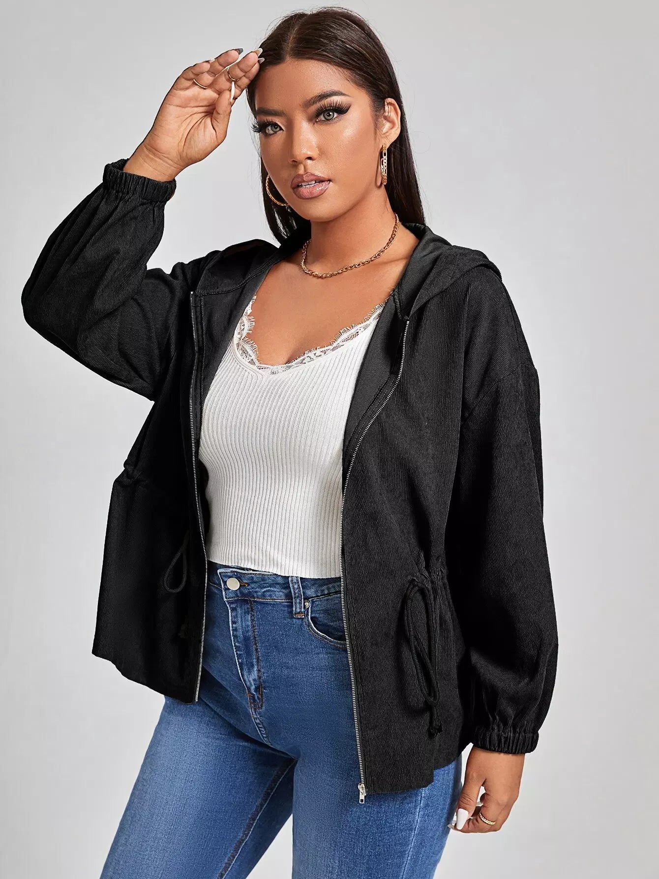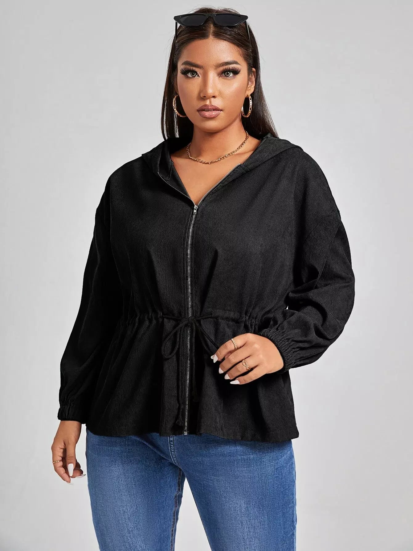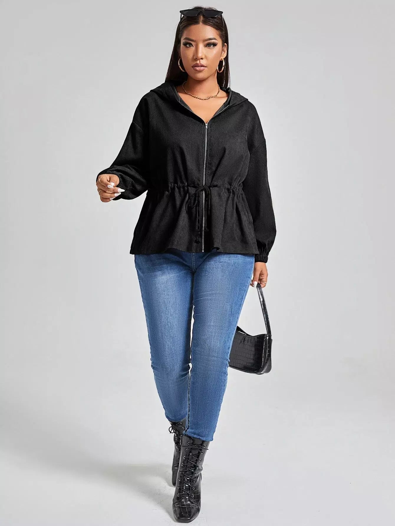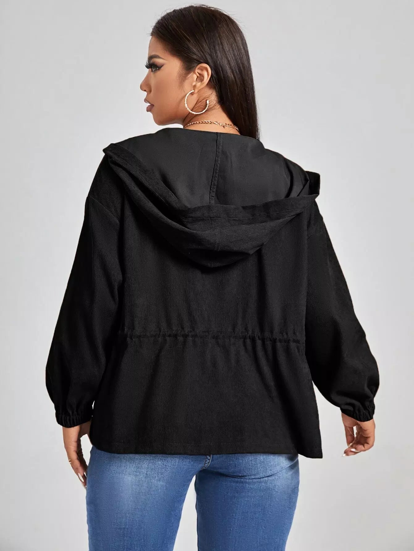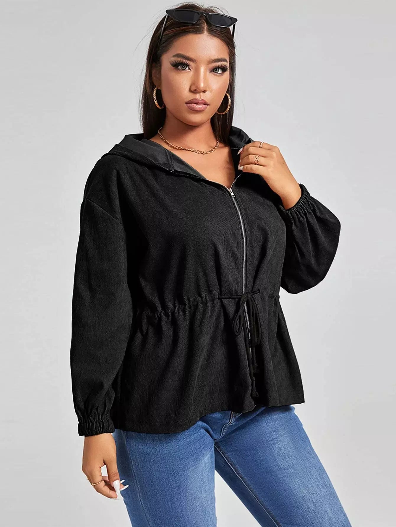 جاكيت بقبعة منسدلة على الكتف برباط خصر منسدل بلاس
