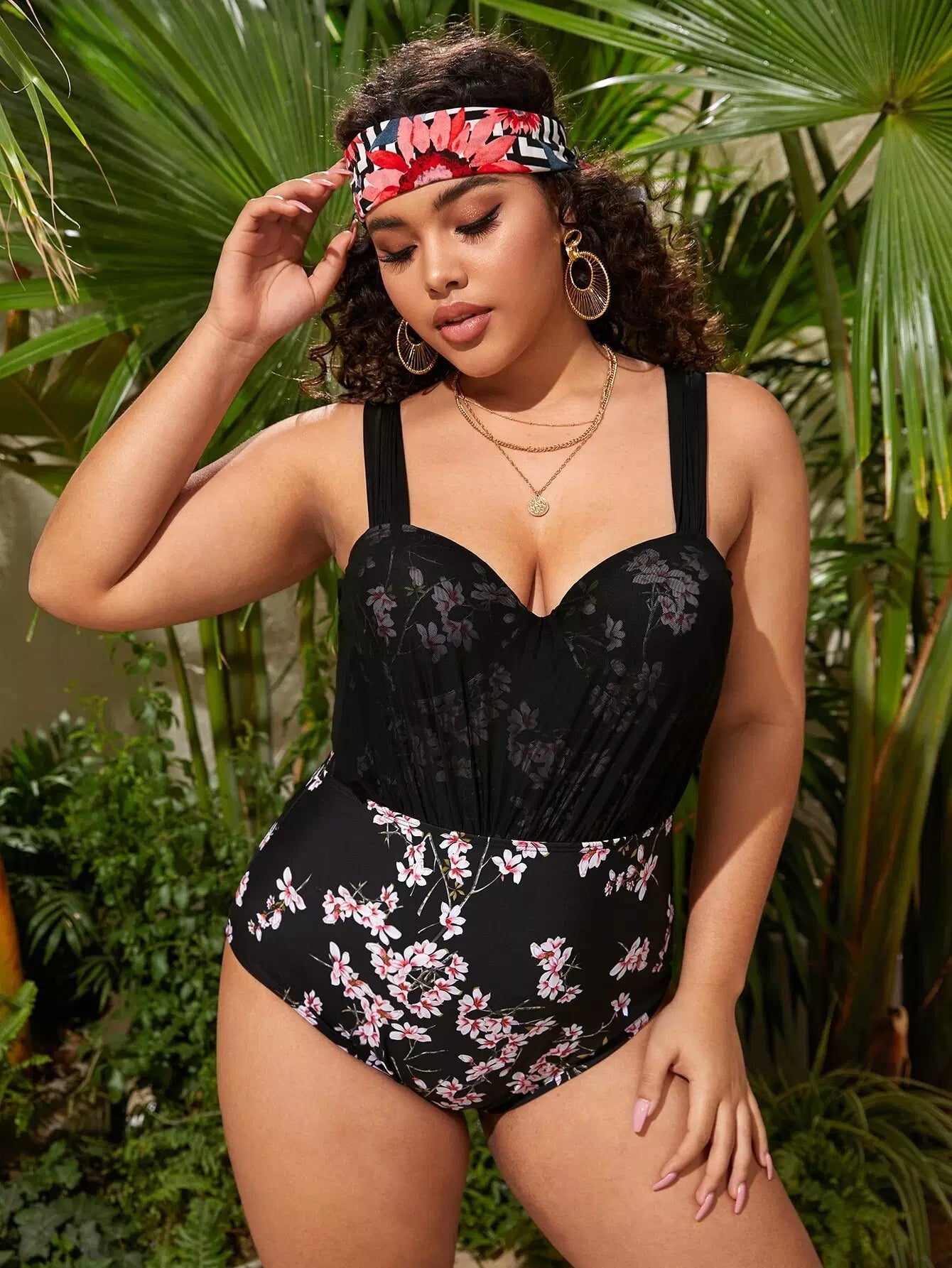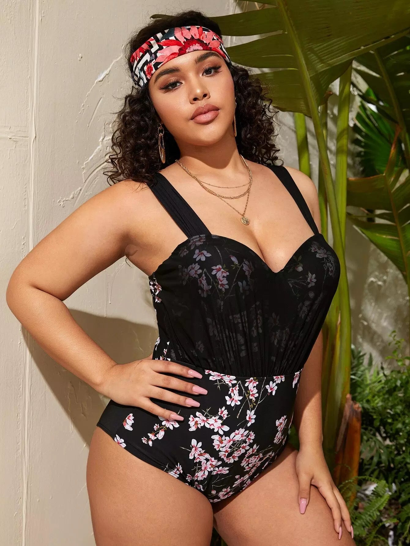 نحيف - مقاس كبير ملابس سباحة من قطعة واحدة شبكية متباينة على شكل زهور