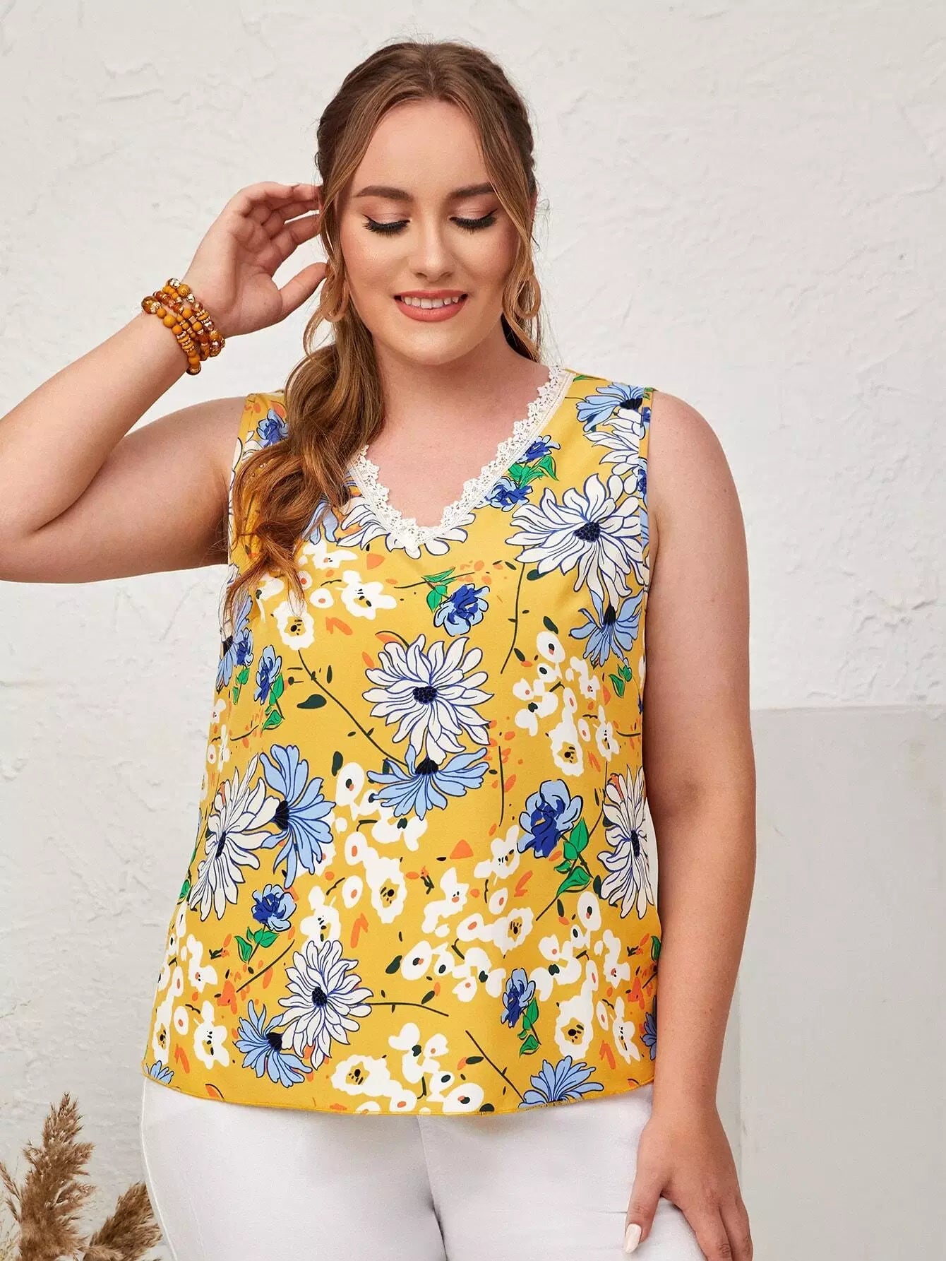 تانك بدون أكمام بطبعة زهور بلون متباين من الدانتيل