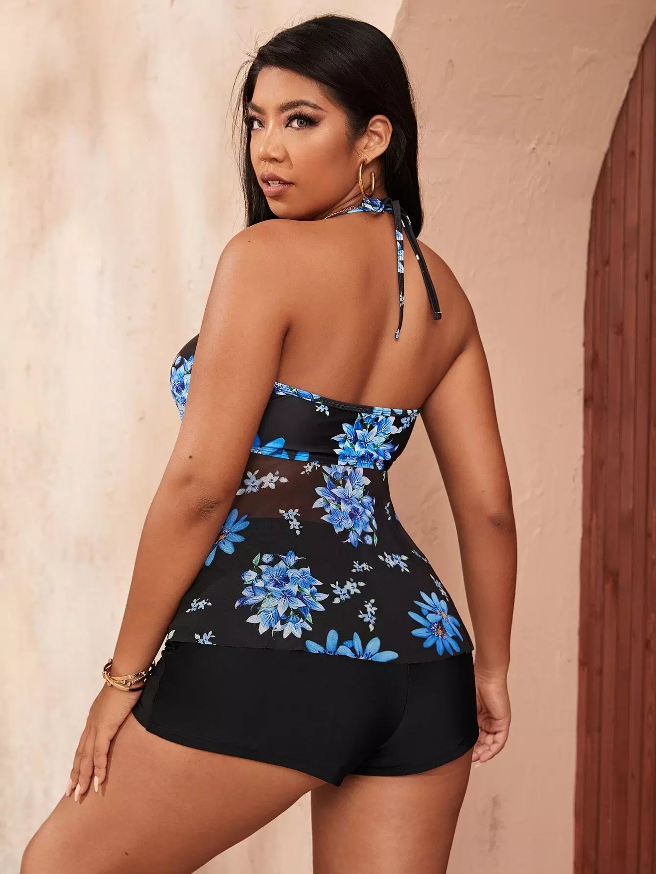 مايوه سباحة بيكيني بيكيني بطبعة زهور بلون متباين على شكل شبكة متباينة