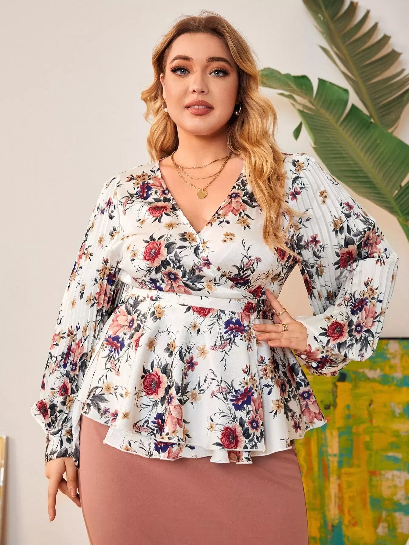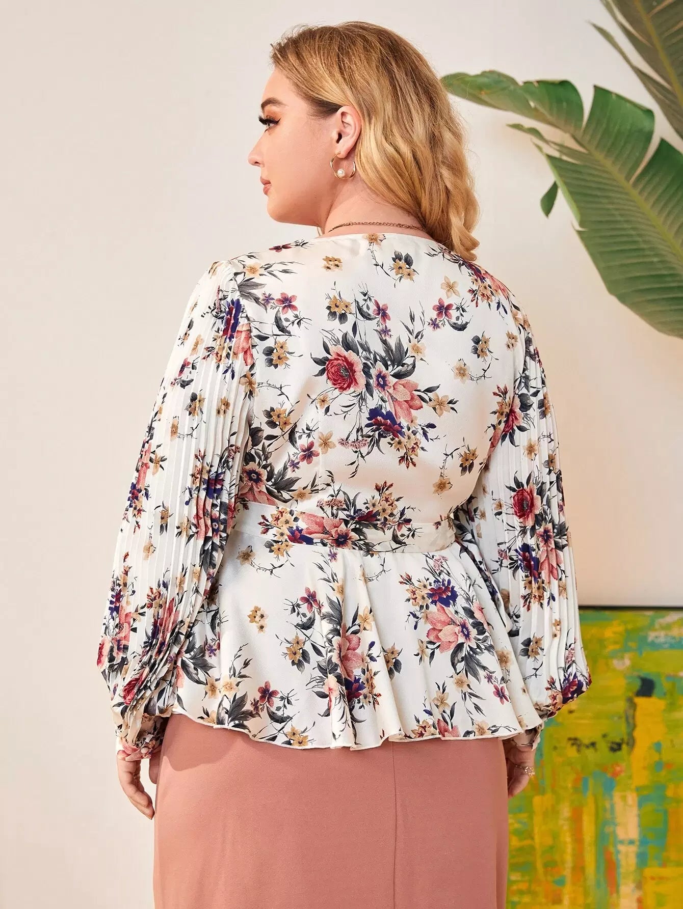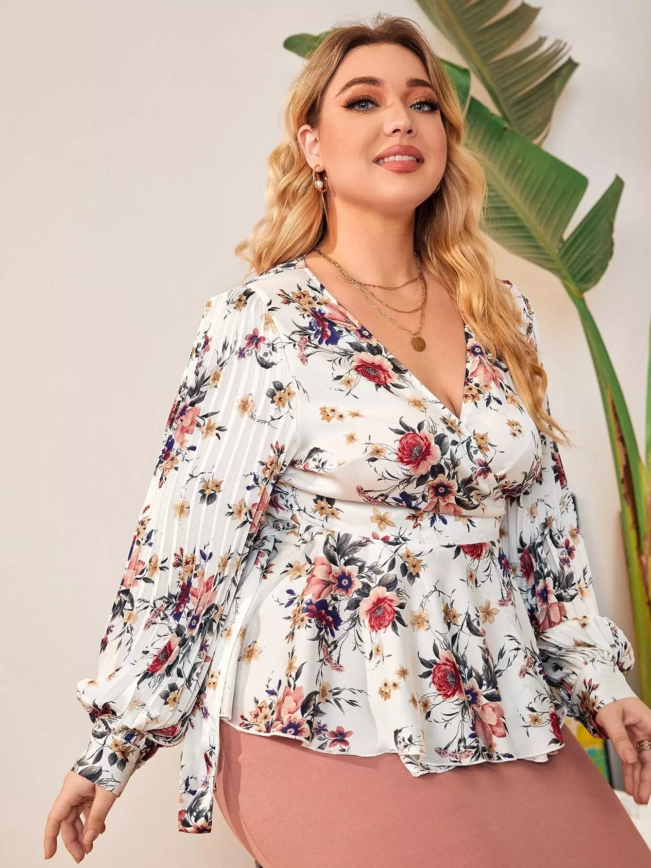بلوزة بطبعة زهور زائدة ذات أكمام فانوسية بأكمام مطوية