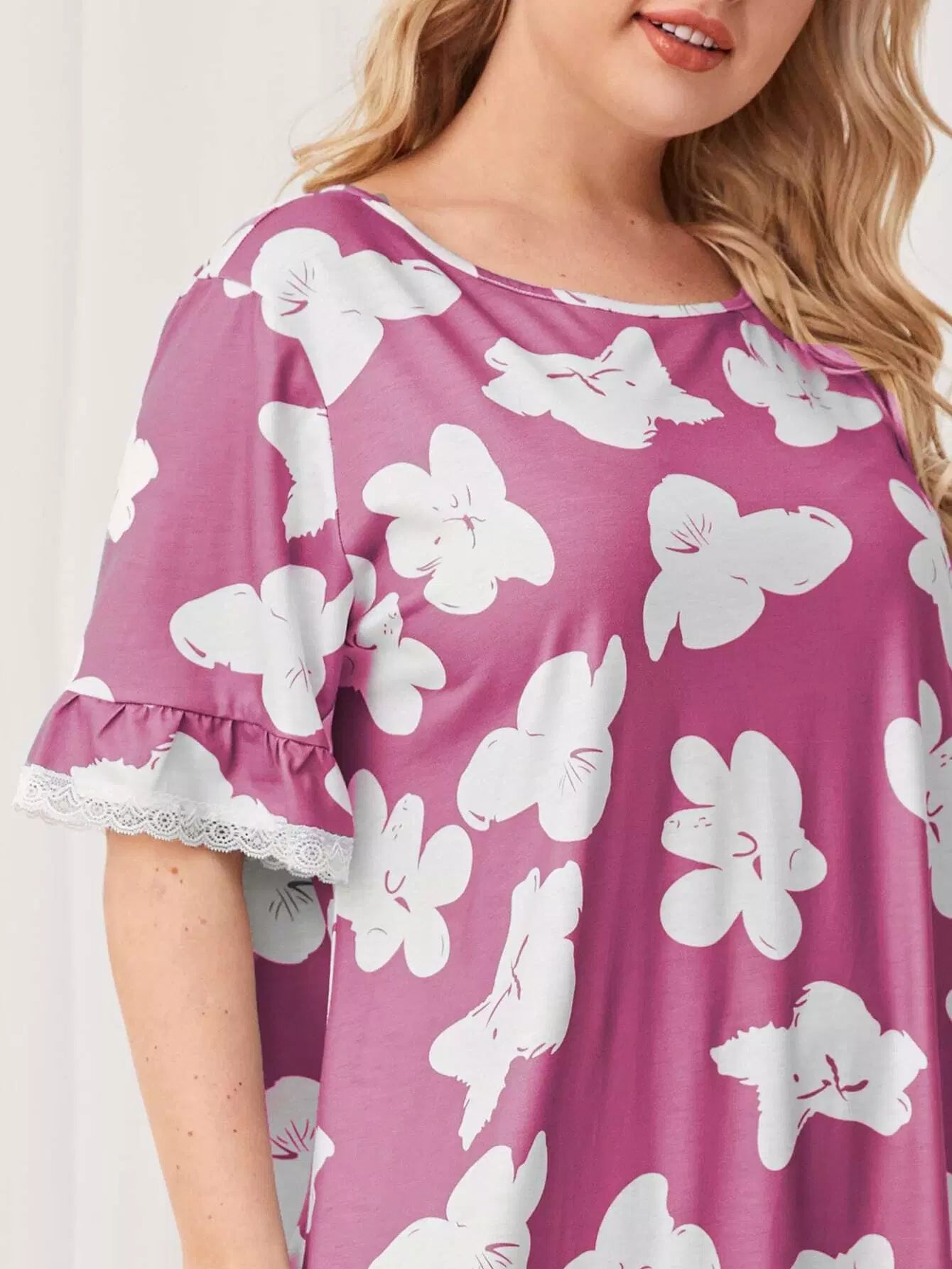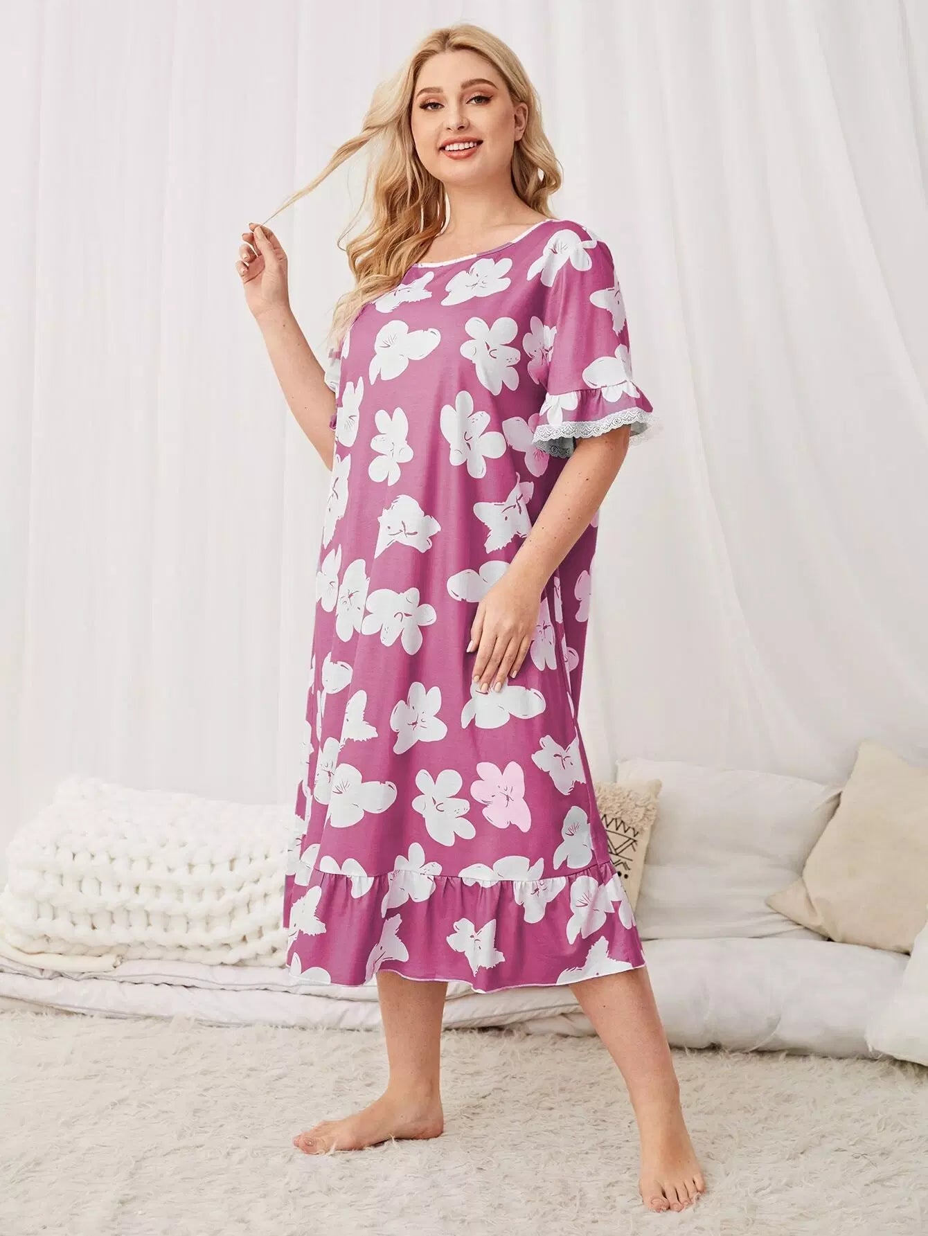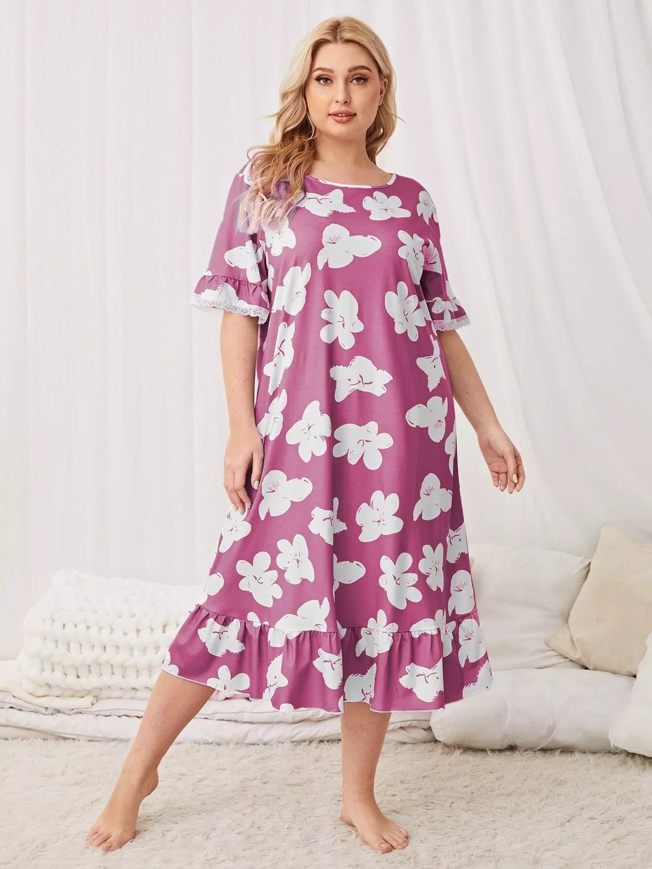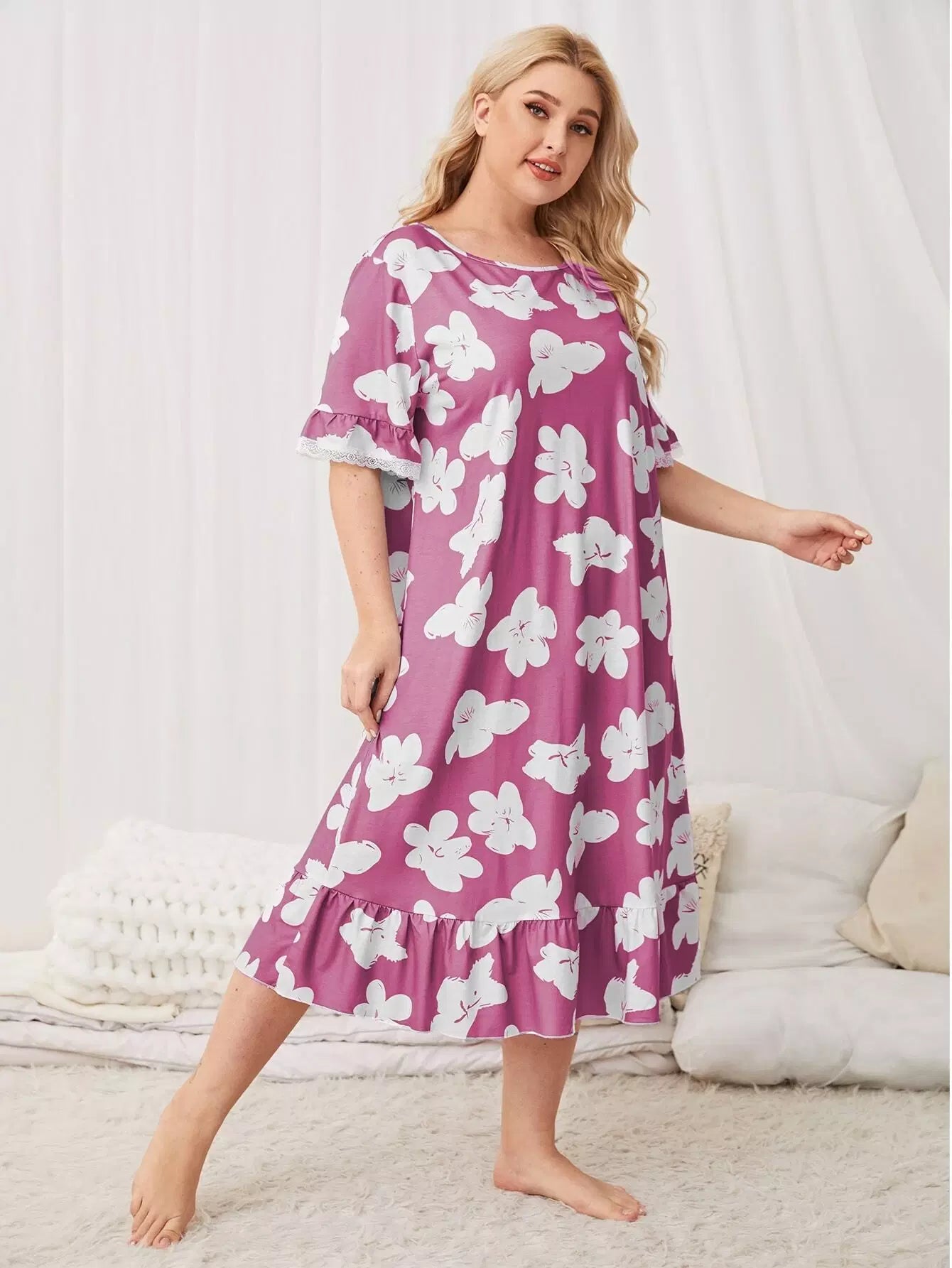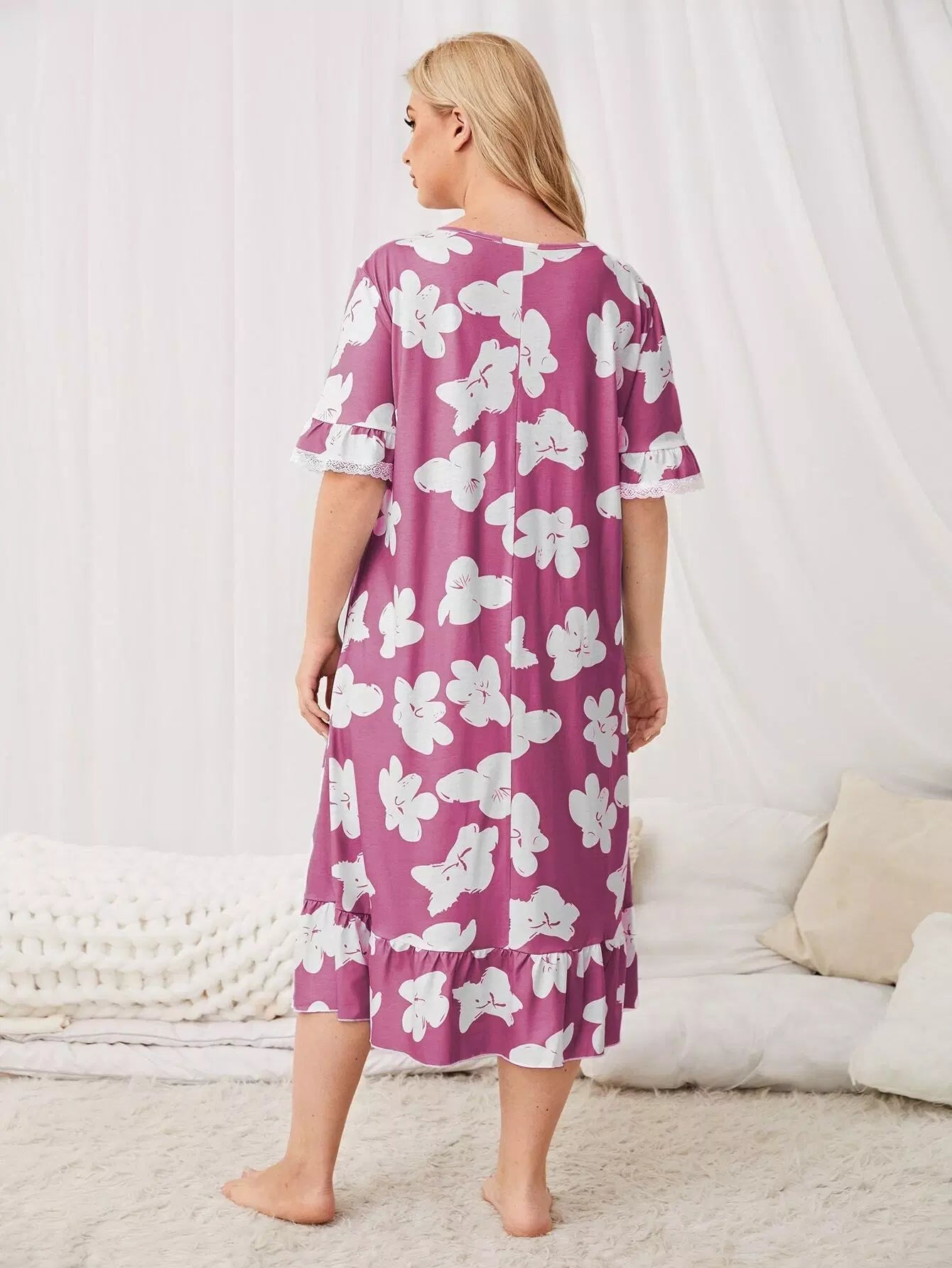 فستان نوم بطبعة زهور مكشكشة بحواف مكشكشة زائد
