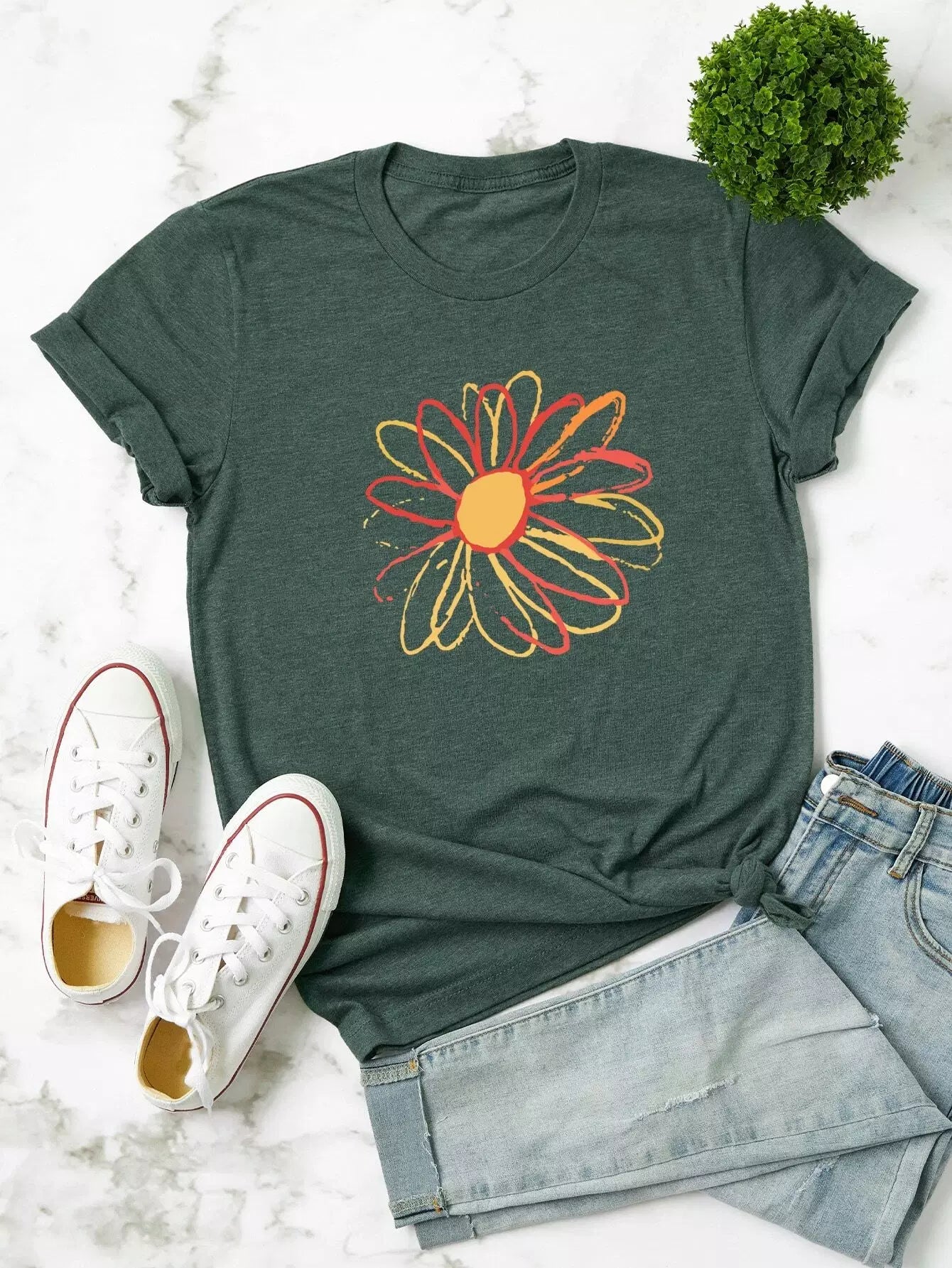 تي شيرت بأكمام قصيرة بنقشة زهور زائد
