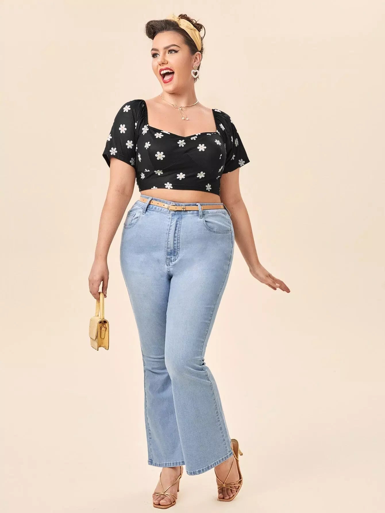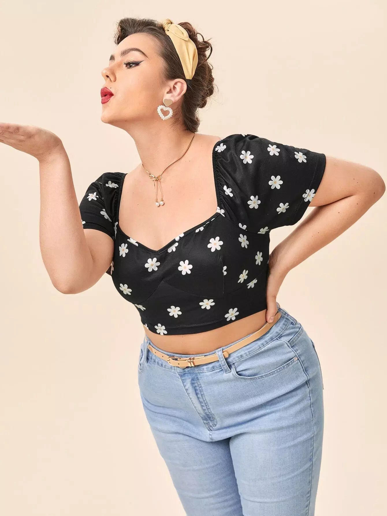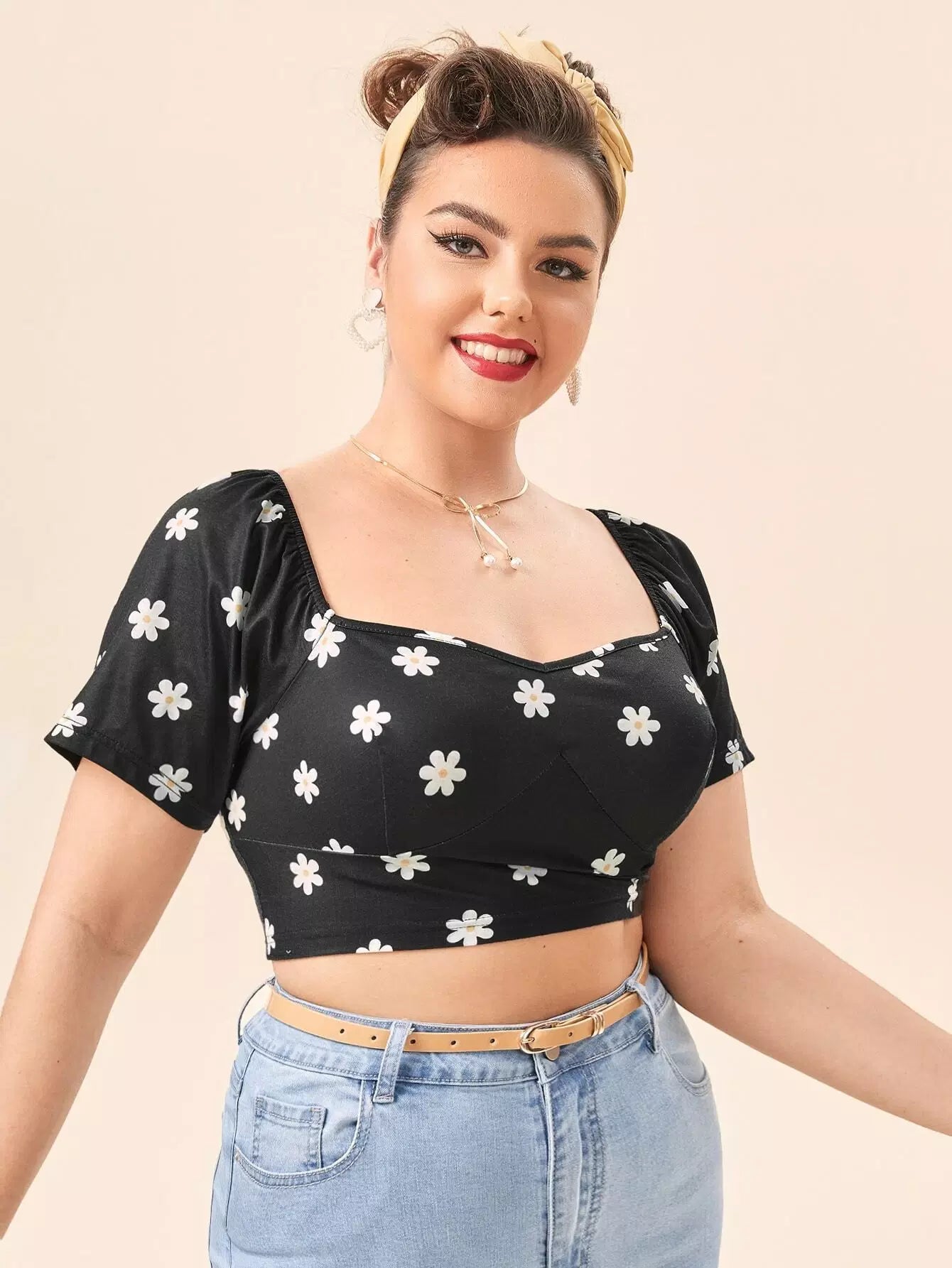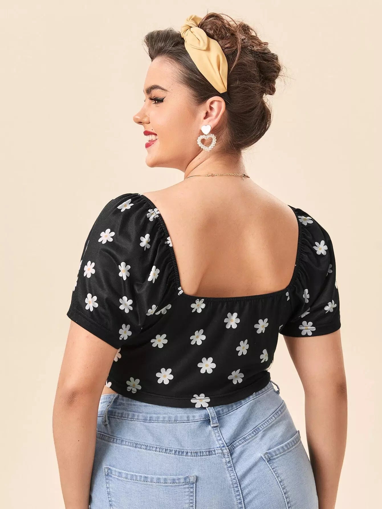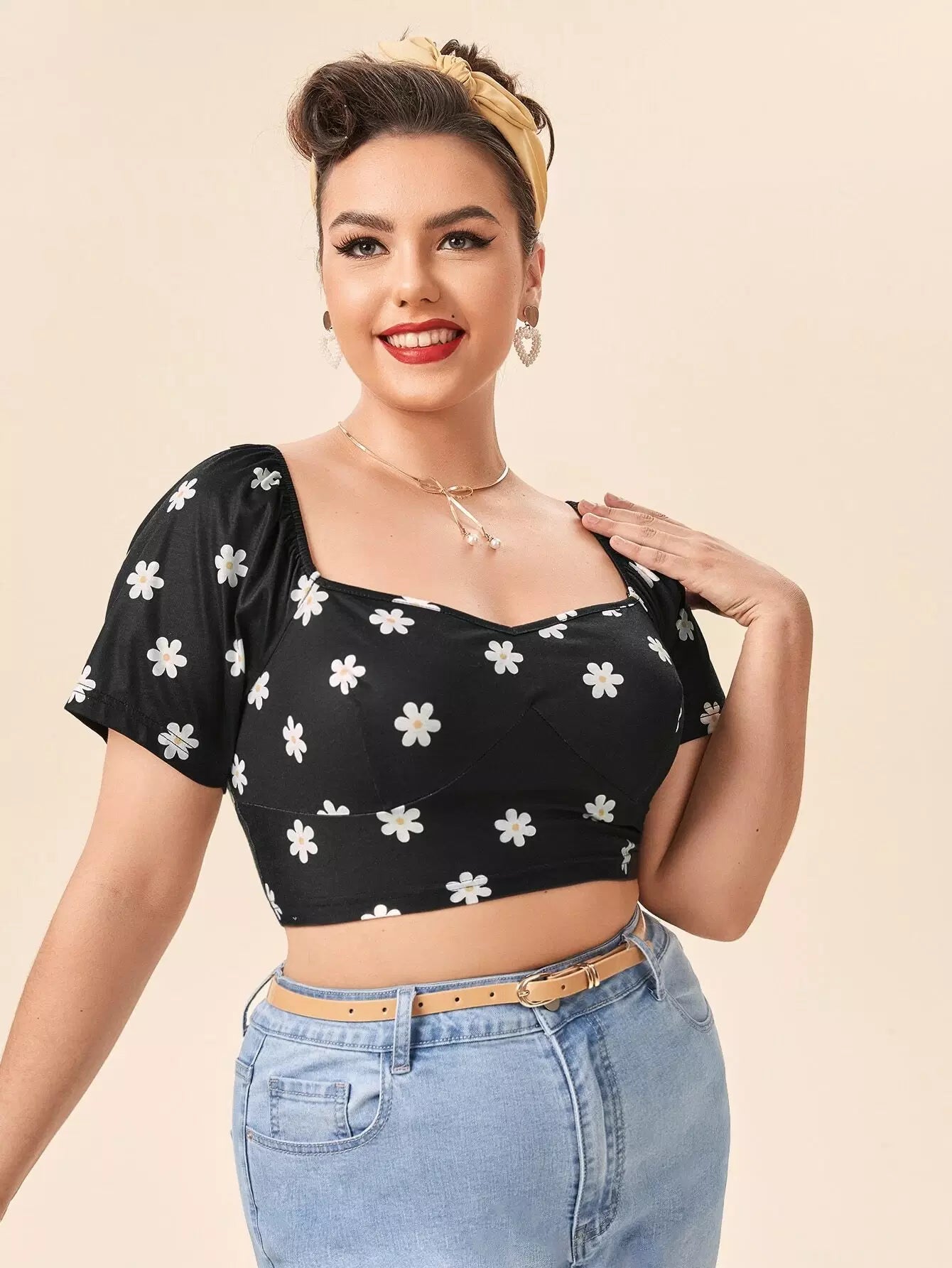 تي شيرت قصير بياقة قصيرة بطبعة زهور برقبة على شكل زائد