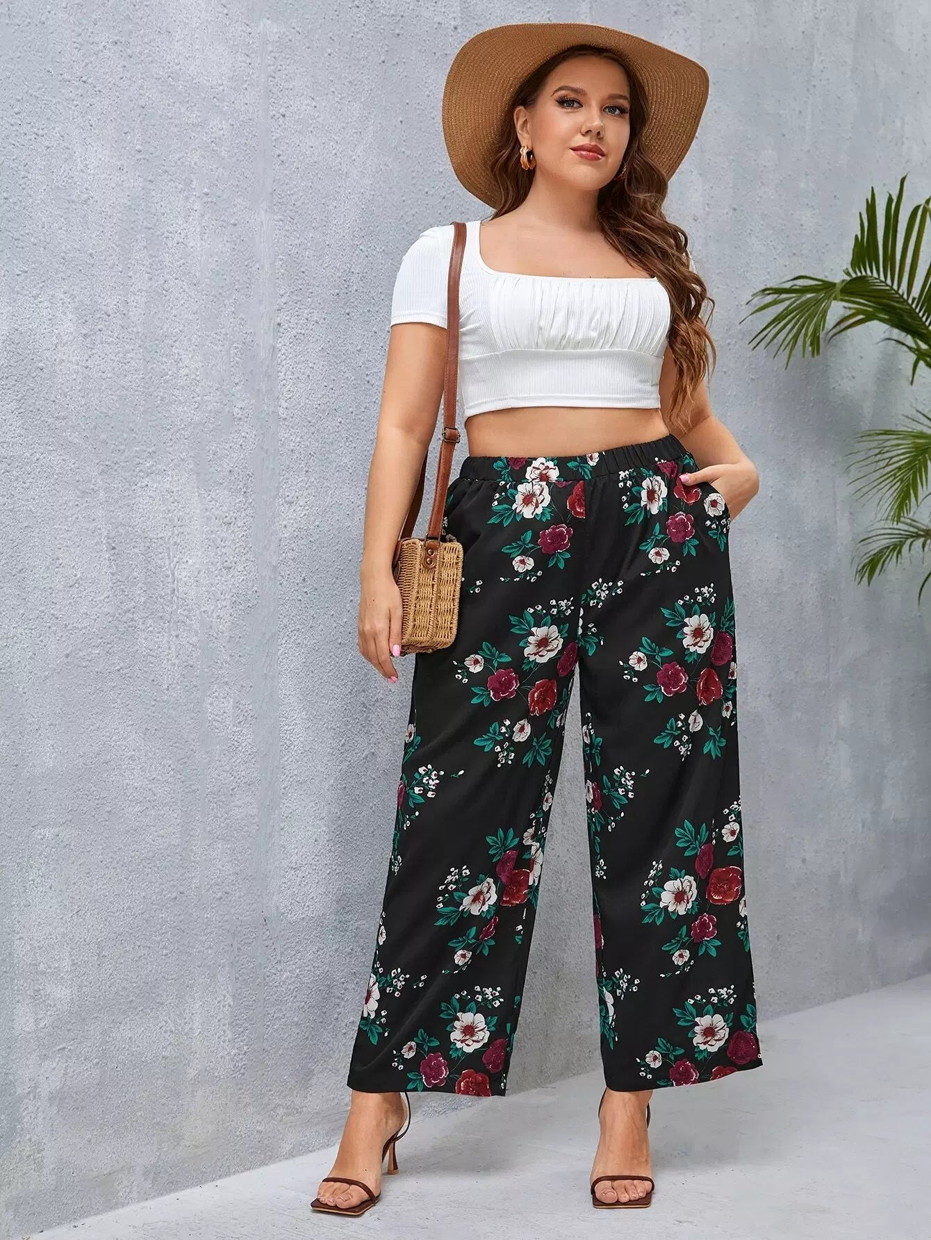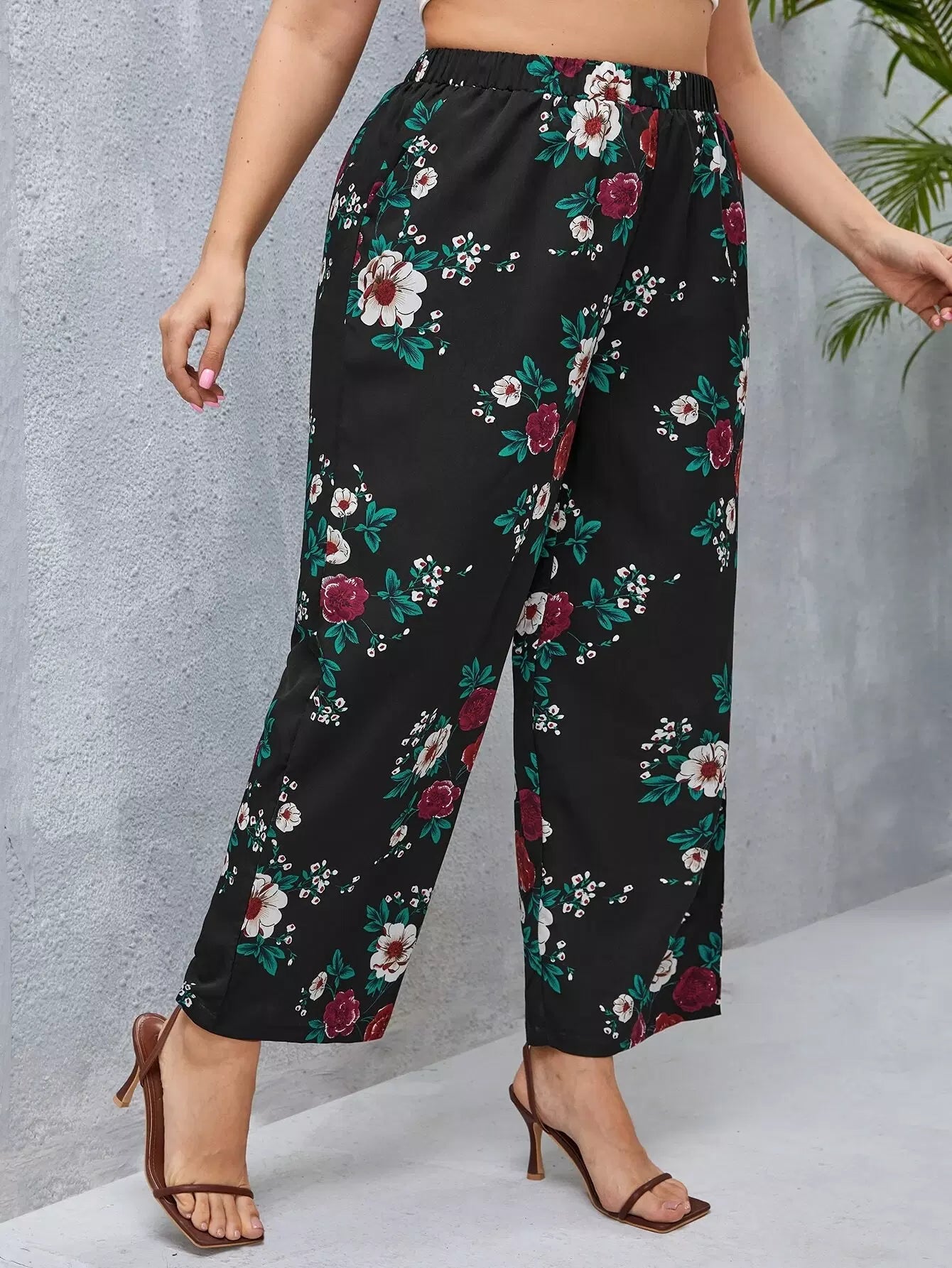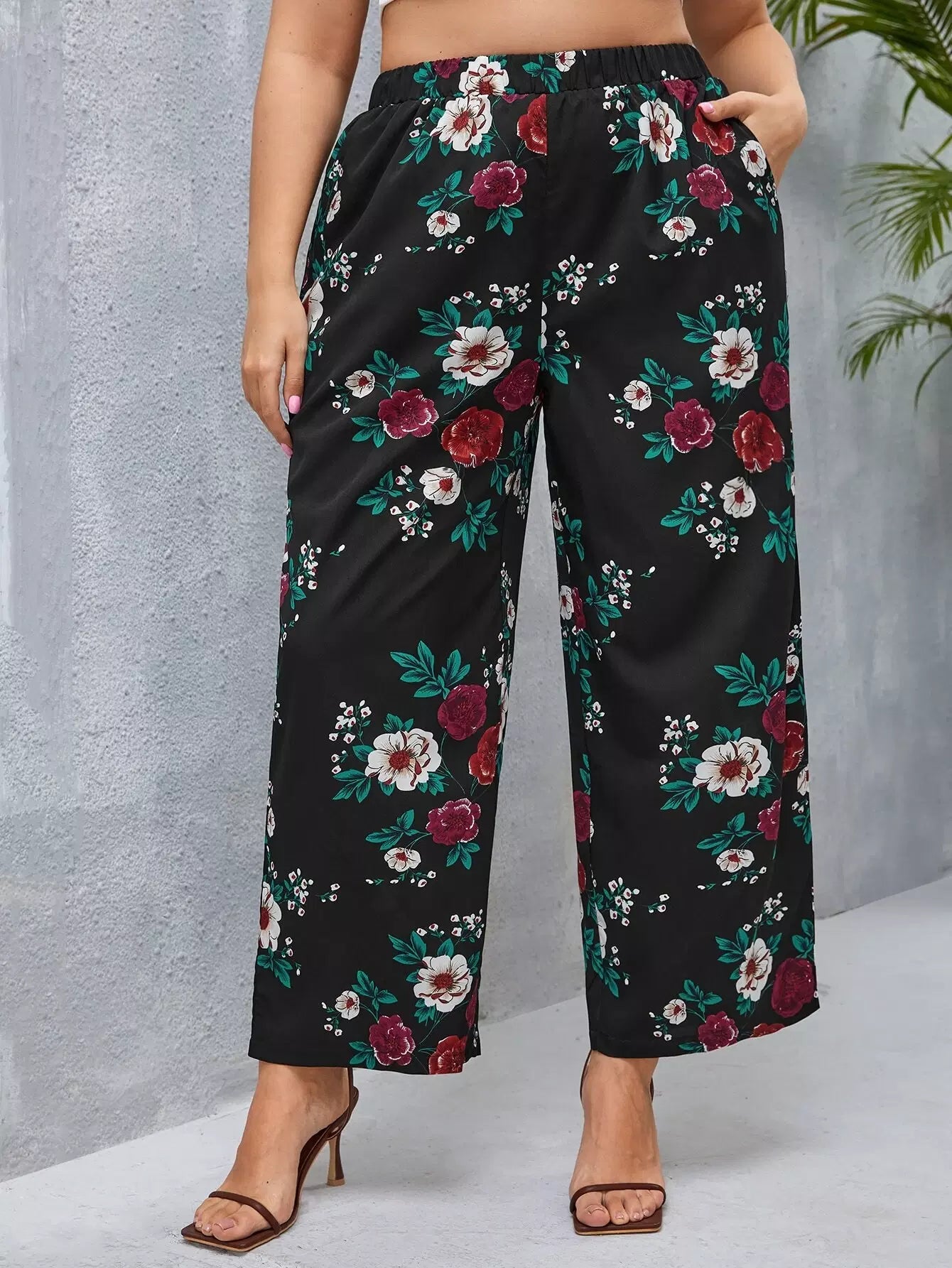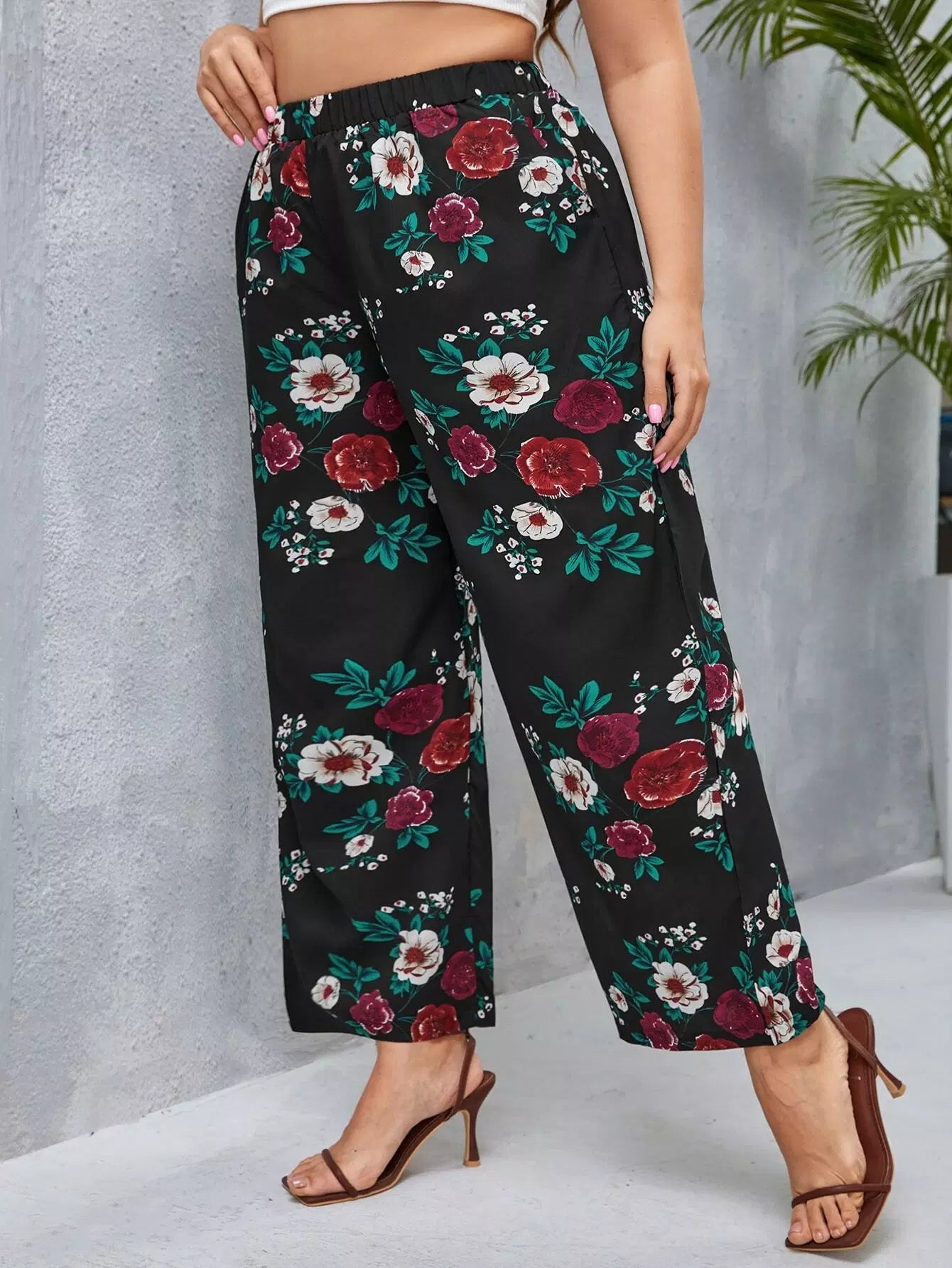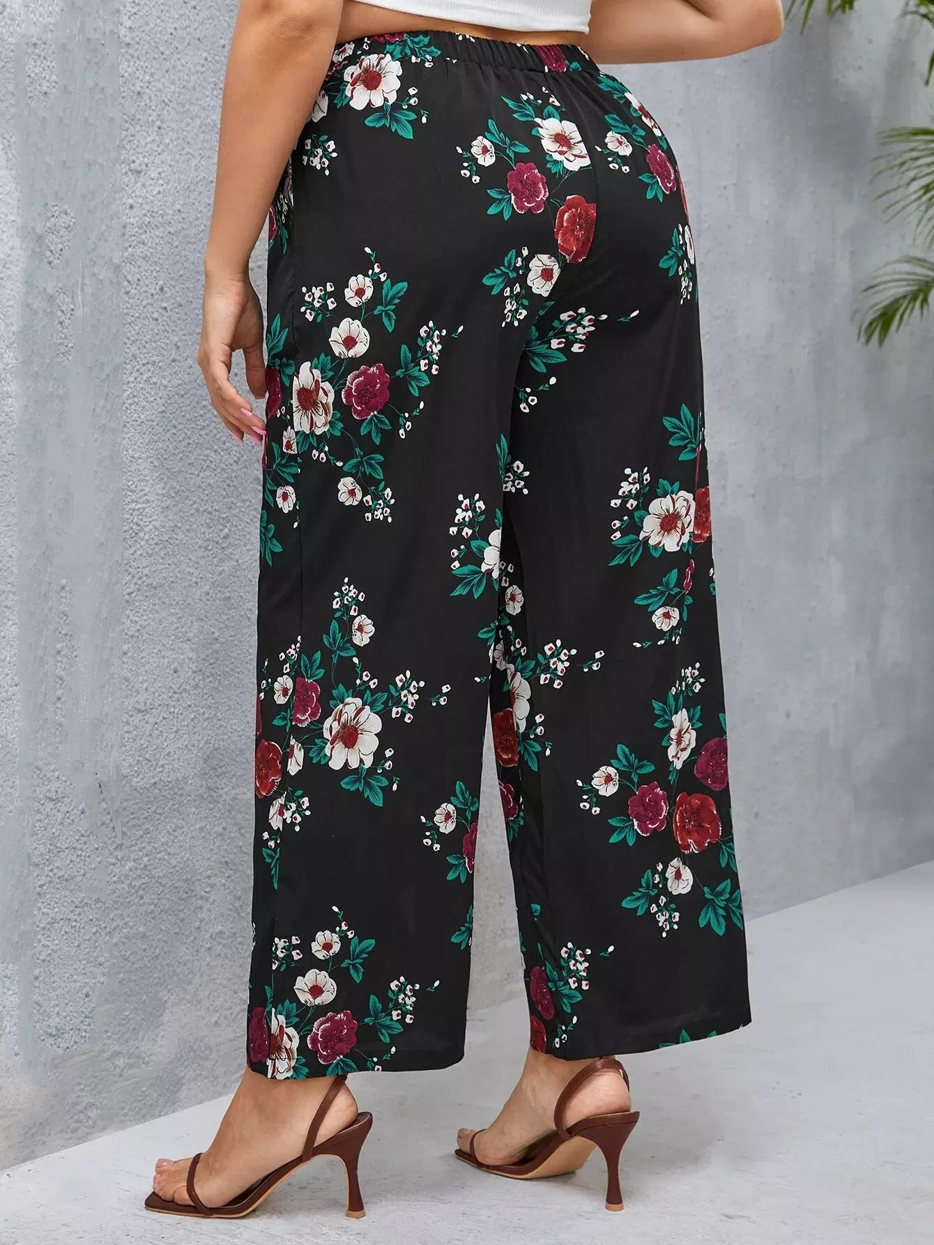بنطلون واسع الساقين بطبعة زهور زائد