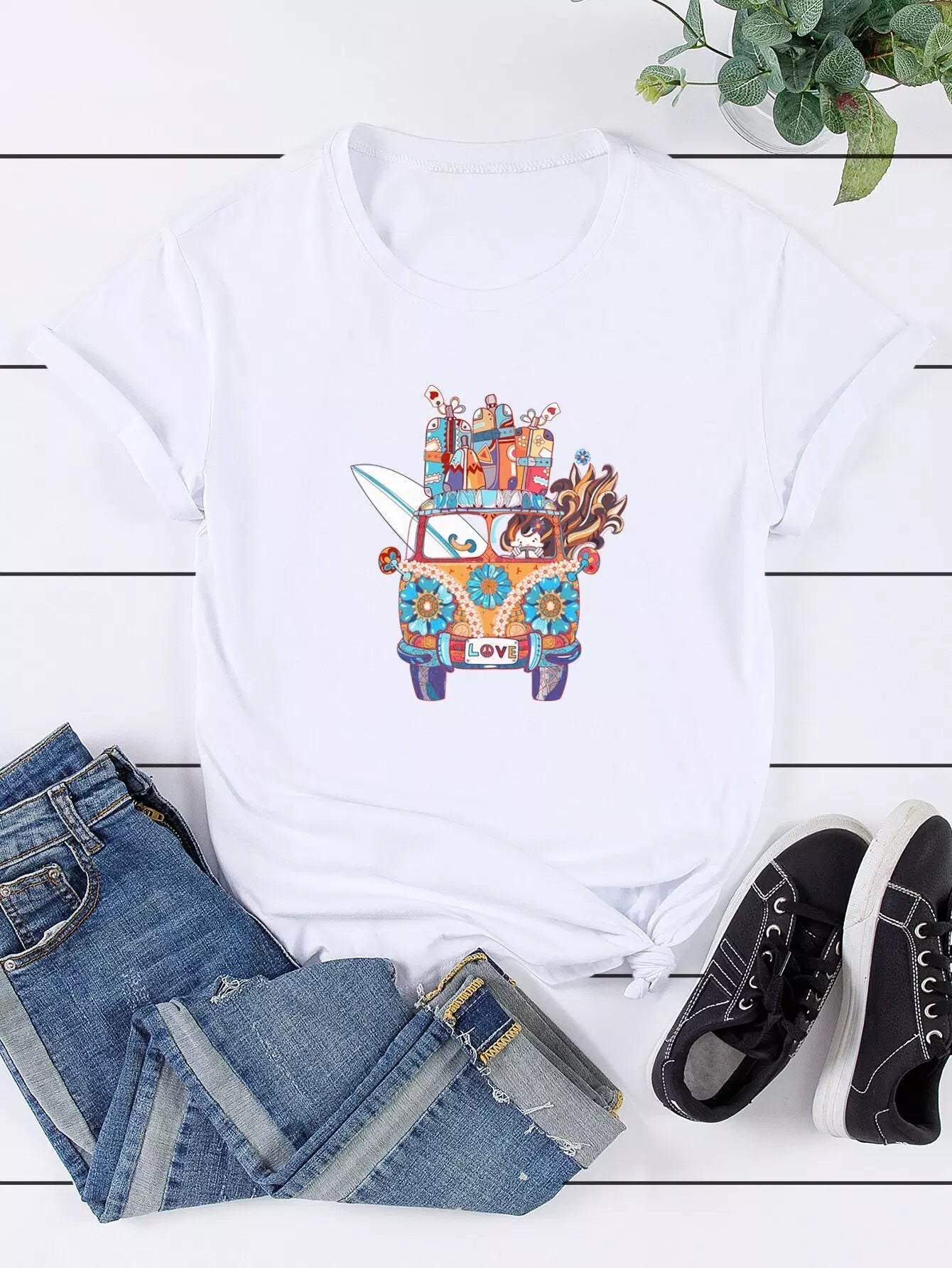 تي شيرت بياقة كرو مطبوع عليه رسومات زائد