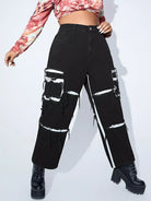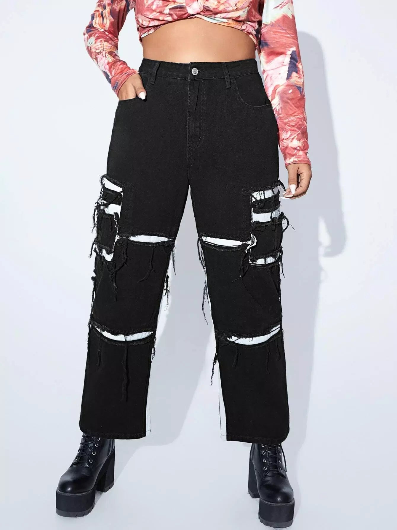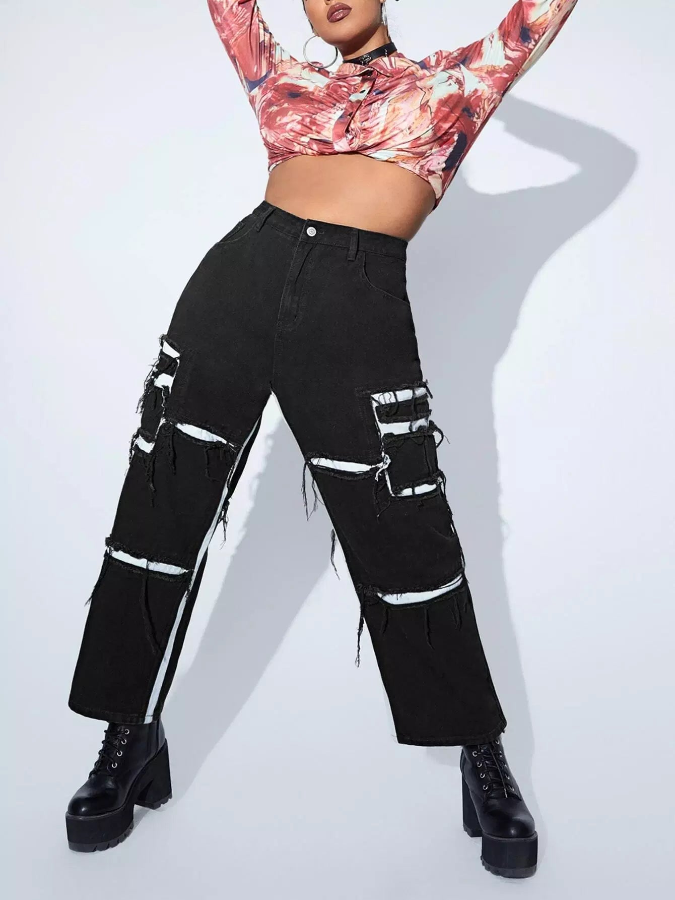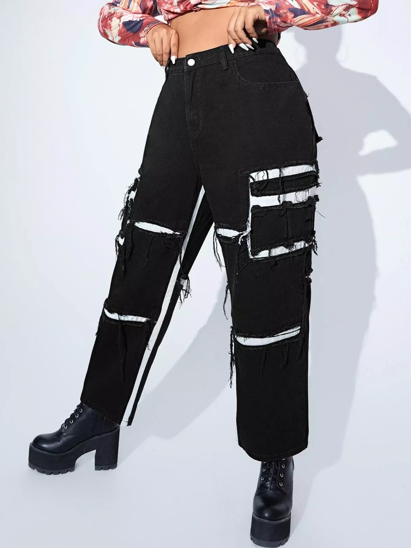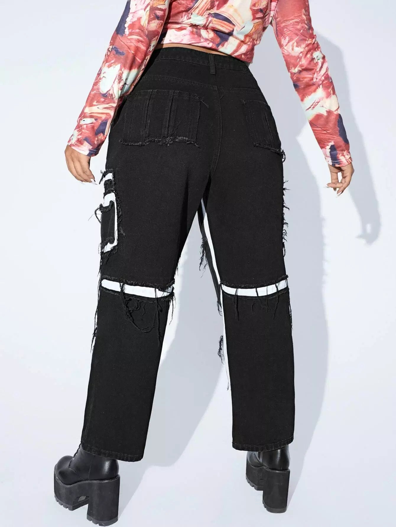 بنطال جينز ممزق ذو خصر عالٍ ممزق بلون متباين ومزخرف