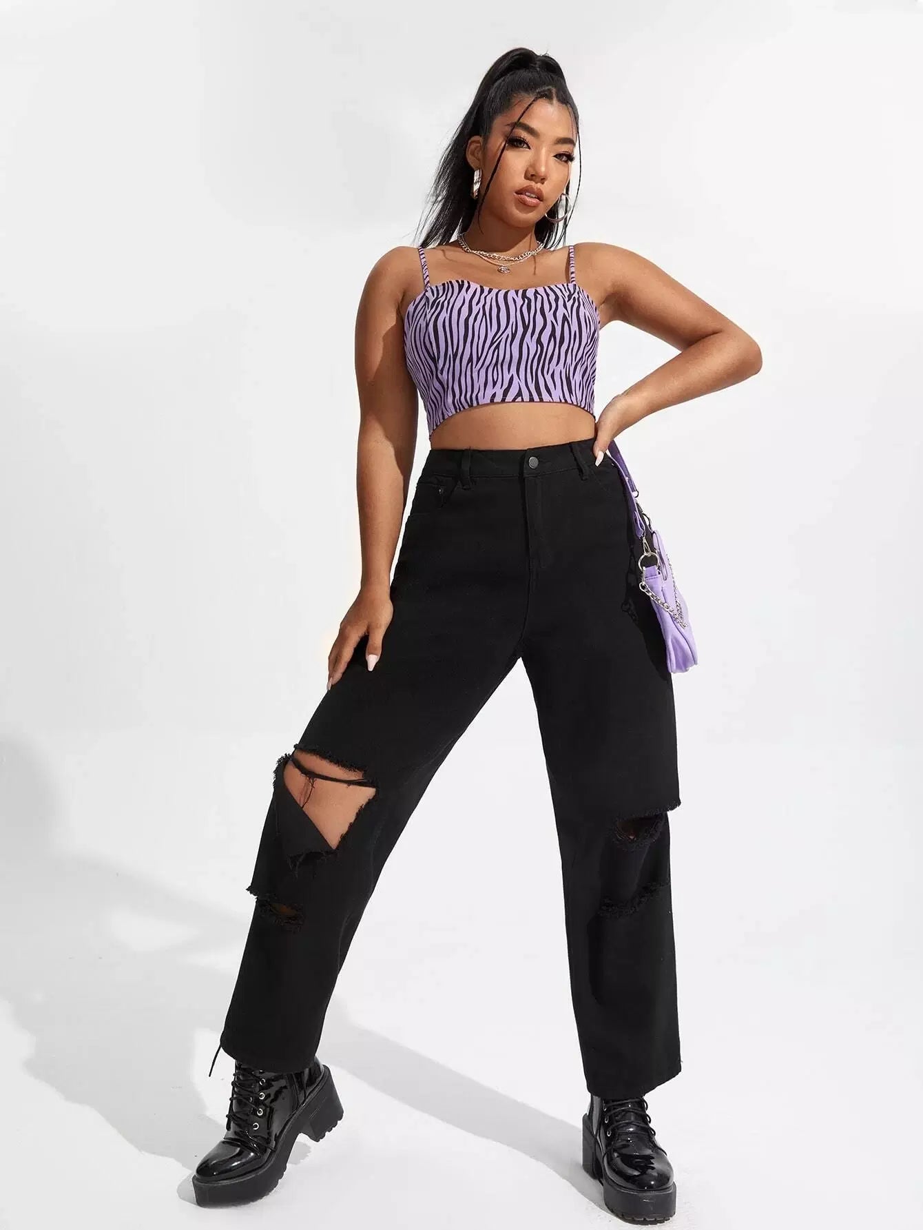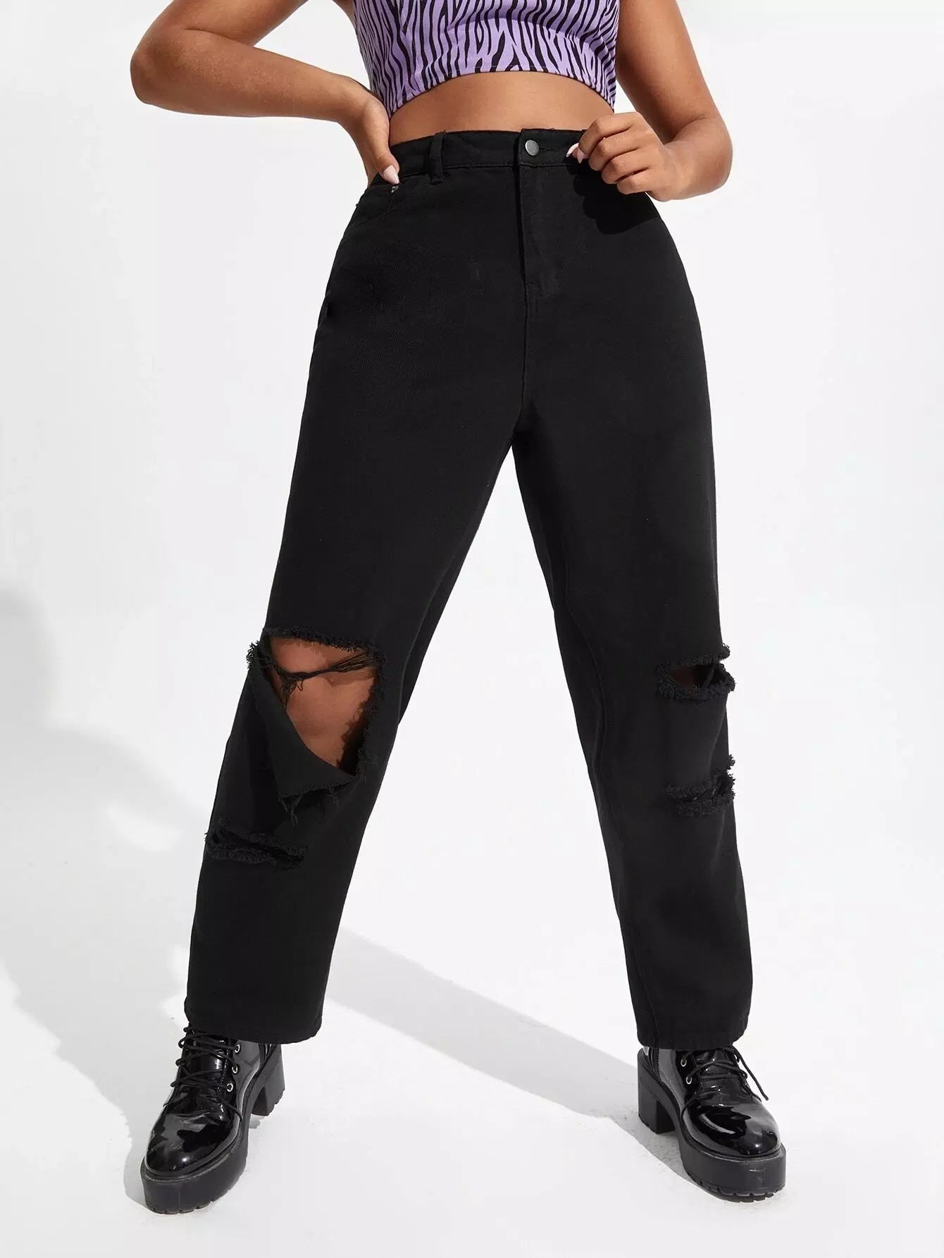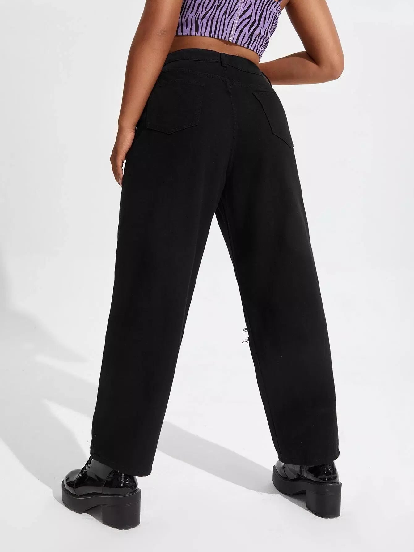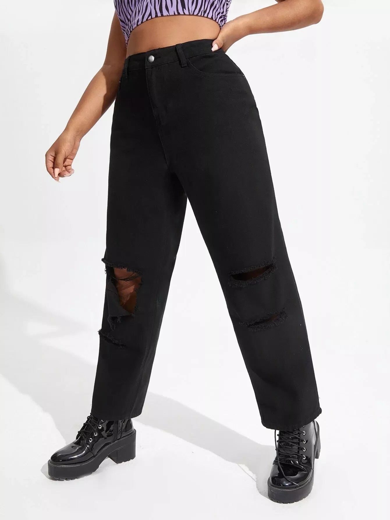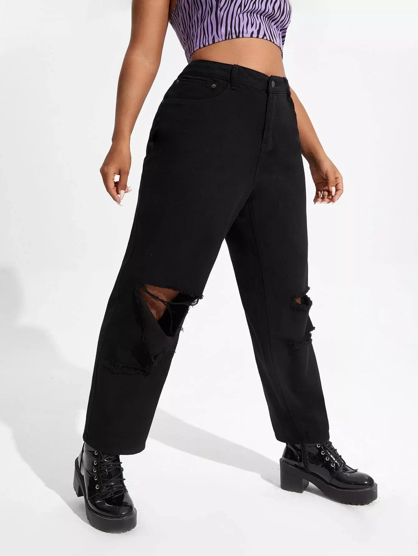 بنطلون جينز ممزق عالي الخصر وعريض الساقين زائد
